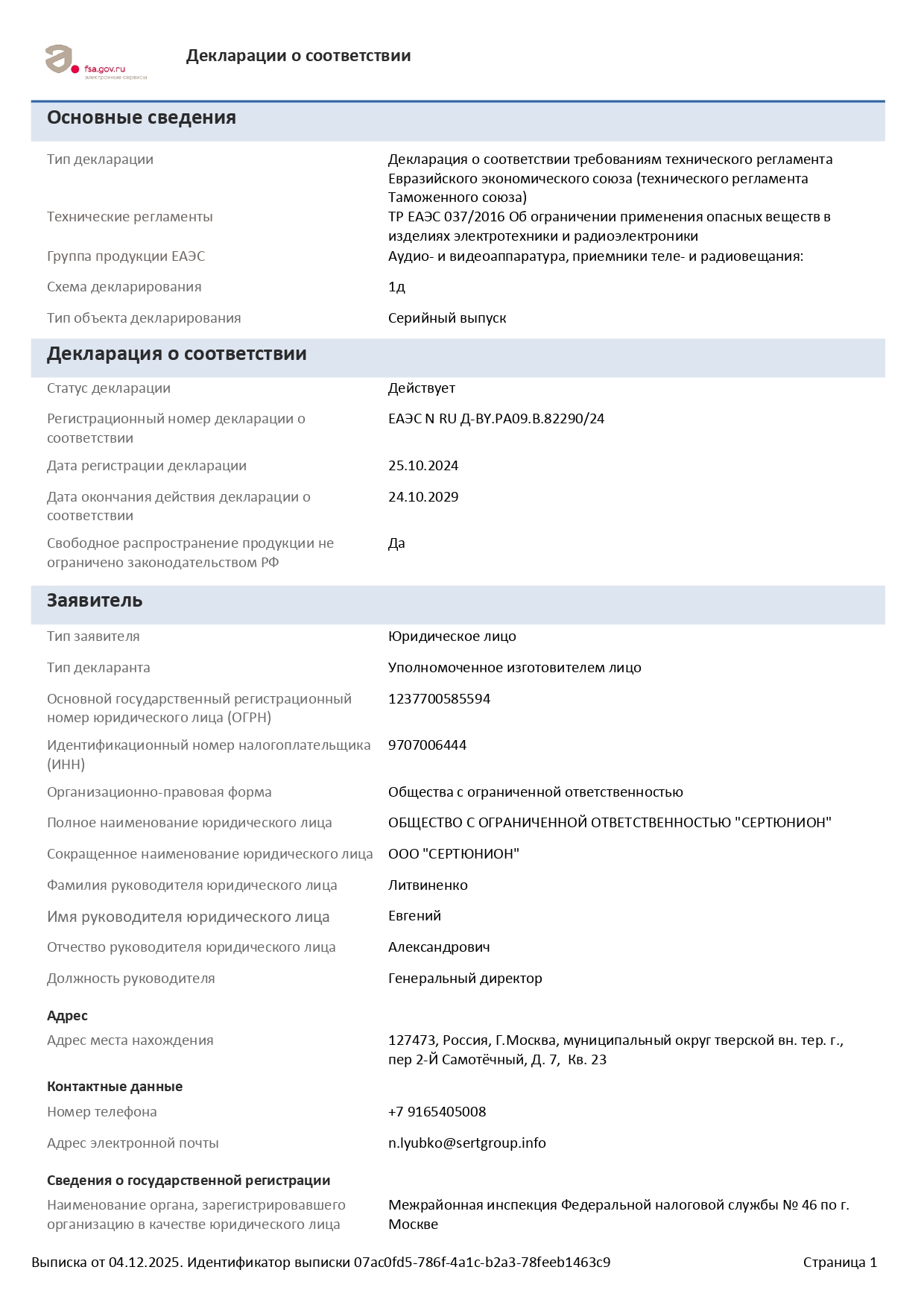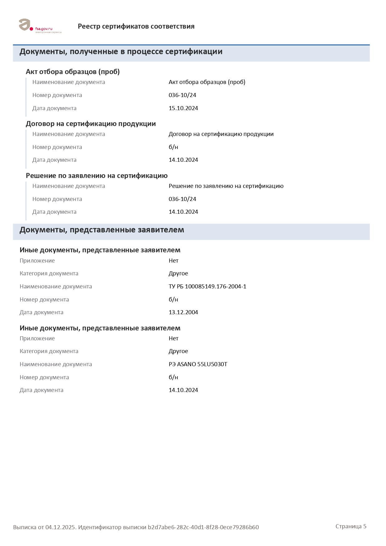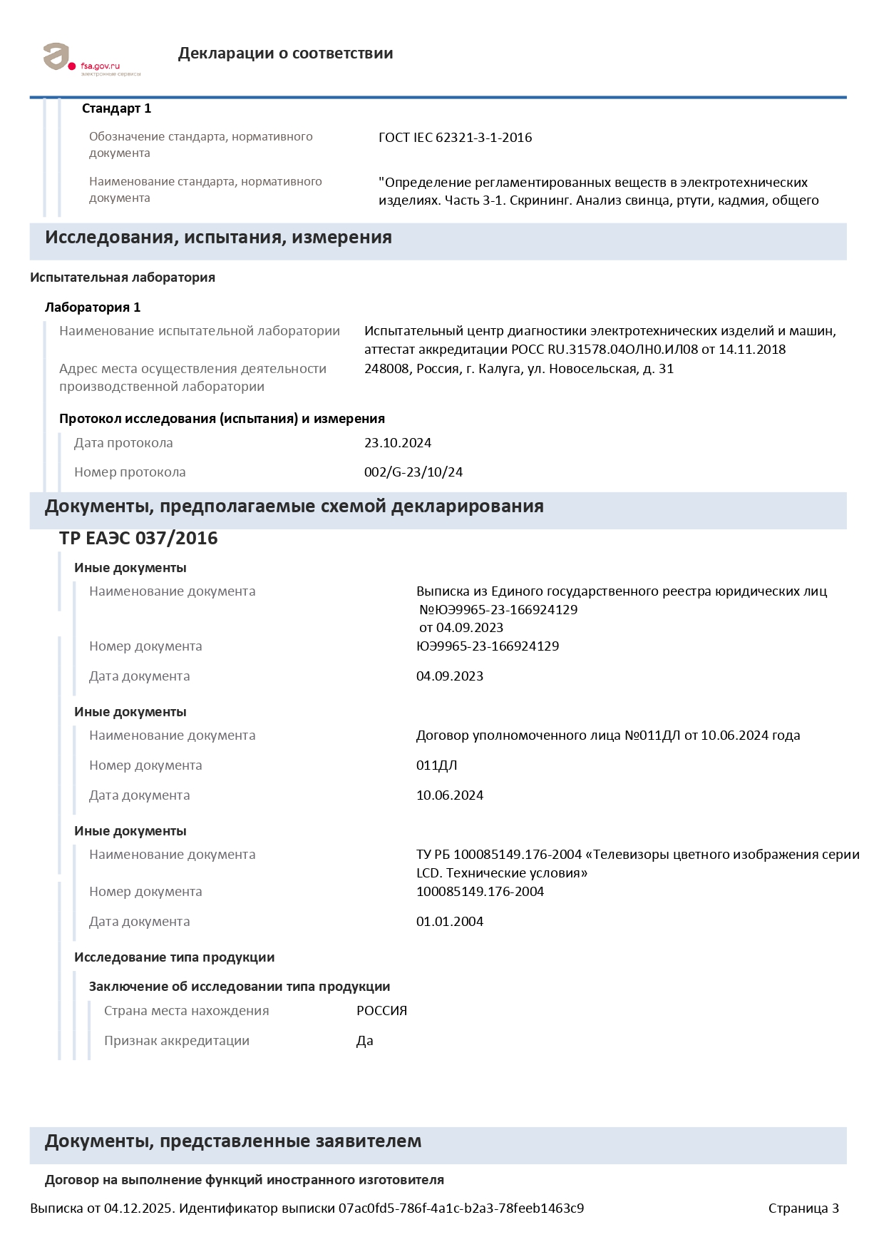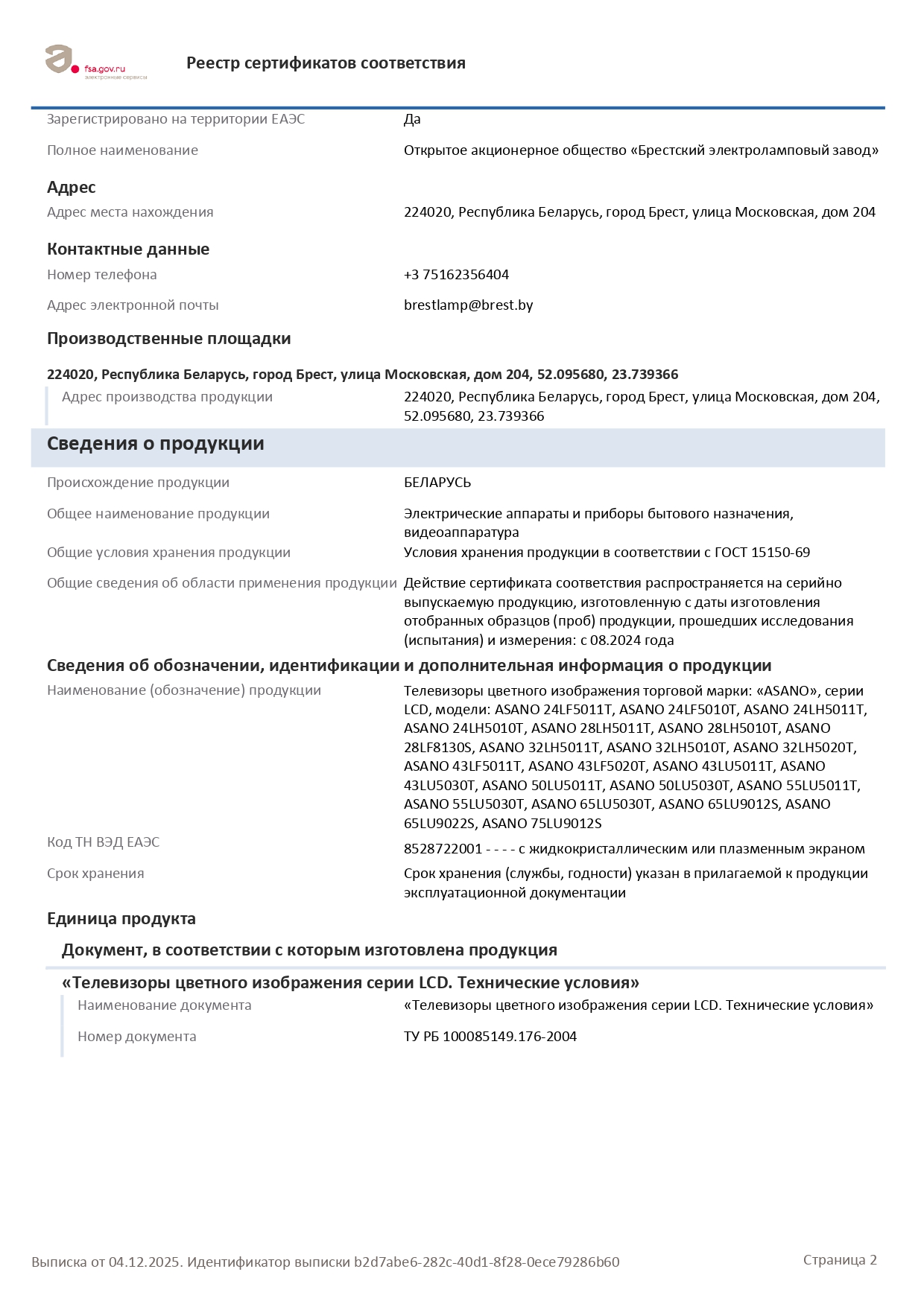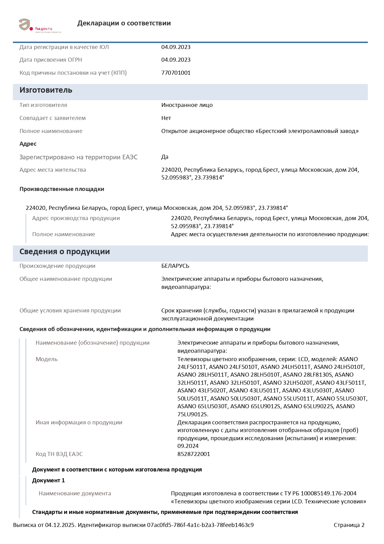 Телевизор ASANO 24LH5010T, 24" (60 см), 1366x768, HD, 16:9, Салют ТВ, Wi-Fi, черный Код товара: 458878 10 766 ₽ Купить Производитель:ASANO Погрузитесь в мир качественного изображения и умных возможностей с ASANO 24LH5010T – компактным 24-дюймовым LED-телевизором с HD-разрешением, идеально подходящим для кухни и спальни или небольшой гостиной! Его стильный черный корпус с закрытыми рамками легко вписывается в любой интерьер, поддержка Smart TV на платформе "Салют ТВ" на базе Android 11 открывает доступ к онлайн-кинотеатрам и другим сервисам без дополнительных устройств. Телевизор оснащён матрицей TFT с Direct LED-подсветкой, частотой обновления 60 Гц, яркостью 200 кд/м2 и контрастностью 3000:1, что обеспечивает чёткое, насыщенное изображение с неизменными цветами. Широкие углы обзора 178° по горизонтали и вертикали позволяют комфортно смотреть контент с любого ракурса. Поддержка технологии Dolby Digital и стереозвука мощностью 6 Вт делают звук насыщенным и объемным. Для подключения внешних устройств предусмотрены 2 порта HDMI 2.0 (с ARC) и 2 порта USB 2.0. Поддержка DLNA, TimeShift и записи видео на USB носитель расширяют возможности использования. Медиаплеер воспроизводит популярные форматы: MP4, MKV, AVI, MP3, JPEG и другие. Габариты (без подставки): 550х335х67 мм, вес – 2,4 кг, поддержка крепления к стене по стандарту VESA 100х100. Объём памяти – 1 ГБ ОЗУ и 8 ГБ ПЗУ, есть родительский контроль и таймер сна. Производитель оставляет за собой право без предварительного уведомления вносить изменения в технические характеристики, комплектацию и конструкцию, не ухудшающие эксплуатационные характеристики изделия.Производство: БеларусьТип экрана: Direct LEDДиагональ экрана: 24" (60 см)Разрешение экрана: 1366х768 pixФормат экрана: 16:9Поддержка HDTV: HD READYПоддержка Smart TV: даПлатформа Smart TV: Салют ТВМощность звука: 6 ВтWi-Fi: даЦифровые тюнеры: DVB-T2Количество HDMI-портов: 2 шт.Поддержка HDMI 2.0: даКоличество USB-портов: 2 шт.Воспроизведение с внешних носителей: даВозможность крепления на стену: даРазмер VESA: 100x100 ммСерия: ASANO50Комплектация: документация, кабель питания, пульт ДУЦвет корпуса: черныйШирина без подставки: 550 ммВысота без подставки: 335 ммГлубина без подставки: 67 ммВес без подставки: 2.4 кгШирина с подставкой: 550 ммВысота с подставкой: 363 ммГлубина с подставкой: 166 ммВес с подставкой (без упаковки): 2.5 кгВес: 3,14 кгРазмер упаковки: 41 × 60 × 10 смОбъём: 0.0246 м3Промежуточная упаковка: 1 штТранспортная упаковка: 1 штШтрих-код: 4814032011714 Файлы Приложение-1.pdf Сертификат-1.jpg Сертификат-2.jpg Сертификат-3.jpg Сертификат-4.jpg Сертификат-5.jpg Сертификат-6.jpg Сертификат-7.jpg Сертификат-8.jpg Сертификат-9.jpg Сертификат-10.jpg Сертификат-11.jpg Сертификат-12.jpg