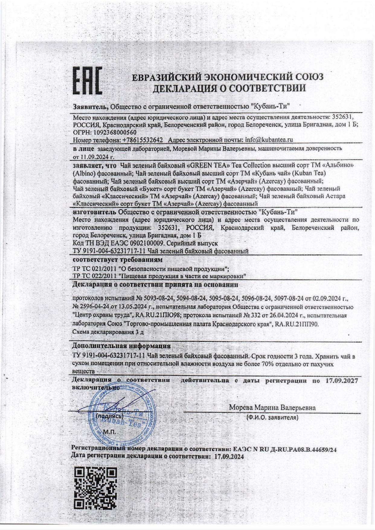 Чай листовой АЗЕРЧАЙ "Букет" зеленый крупнолистовой 400 г Код товара: 624516 503,07 ₽ Купить Производитель:АЗЕРЧАЙ АЗЕРЧАЙ "Букет" черный многие годы остается лидером продаж. Совсем недавно у него появился зеленый вариант – крупнолистовой зеленый чай сорта букет. Вопреки распространенному мнению, черный и зеленый чай собирают с одних и тех же чайных кустов. Но благодаря тому, что зеленый чай не проходит стадию ферментации (потемнения на свету), он сохраняет свой природный цвет и свою природную силу. Именно зеленый чай содержит большее количество антиоксидантов и способен взбодрить человека лучше и на более продолжительный срок, чем кофе. Напиток имеет светло-зеленоватый оттенок, вкус мягкий. АЗЕРЧАЙ "Традиционная коллекция" – это классические вкусы для правильного, душевного чаепития. Невозможно представить себе чайную культуру Востока без крепкого черного чая, бергамота и чабреца, без зеленого чая в летнюю жару, без аромата жасмина и обжигающей строгости имбиря. Способ приготовления: в сухой разогретый чайник насыпать чай из расчета 2 чайные ложки на 200 мл воды, залить свежим кипятком и дать настояться в течение 7-8 минут. Хранить в сухом помещении отдельно от пахучих веществ при относительной влажности воздуха не более 70%.Производство: РоссияВид чая: листовойСерия: БукетАромат: классическийМасса нетто: 400 гУпаковка: мягкая упаковкаСрок годности: 36 мес.Фирма-производитель: Кубань-ТиСрок годности: 36 месВес: 457 грРазмер упаковки: 8.6 × 31.1 × 14.1 смОбъём: 0.0041 м3Промежуточная упаковка: 10 штТранспортная упаковка: 10 штШтрих-код: 4610092760889 Сертификат-1.jpg Сертификат-2.jpg Сертификат-3.jpg