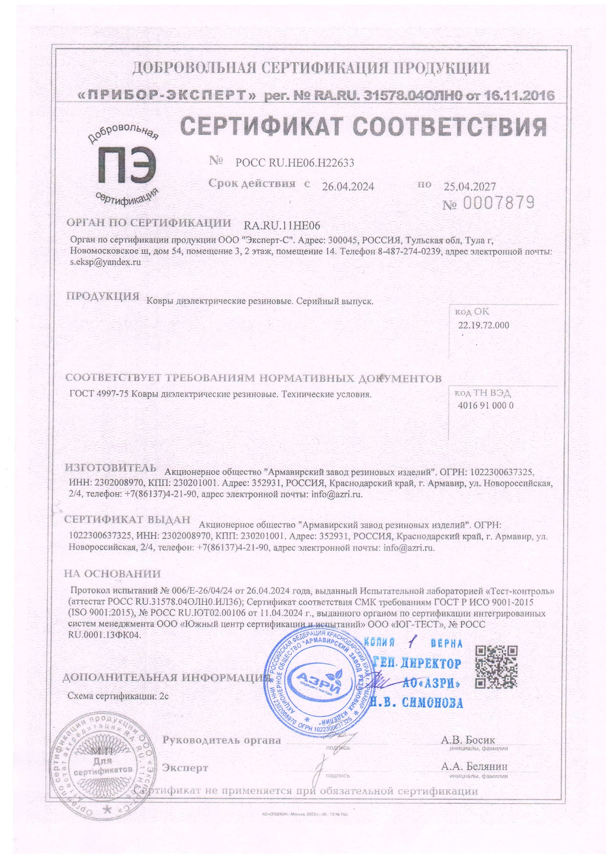 Коврик диэлектрический 50х50 см, защита от поражения током свыше 1000 В, ГОСТ 4997-75, АЗРИ Код товара: 701012 880,08 ₽ Купить Производитель:АЗРИ Предназначен для дополнительного защитного средства в закрытых электроустановках, рабочее напряжение которых не превышает 20 кВ, при температуре от -15 до +40 °С. Коврик диэлектрический предназначен для защиты от возможного поражения электрическим током. Применяется в помещениях с повышенной опасностью и особо опасных по условиям поражения током, а также при выполнении электромонтажных работ всех видов сложности. • Коврик выполнен из специальной резины и имеет рифленую лицевую поверхность, которая предотвращает скольжение. • Размер коврика – 50х50 см. Позволяет удобно разместиться для проведения работ. • Поверхность коврика легко очищается от загрязнений. Применяются в качестве дополнительного средства защиты в закрытых электроустановках напряжением свыше 1000 В, кроме особо сырых помещений, а также в открытых электроустановках в сухую погоду. Нормативный документ: ГОСТ 4997-75. Материал: натуральный каучук. Длина: 500 мм. Толщина: 5 мм ± 1 мм, глубина рифа – 1–3 мм. Ширина: 500 мм. Особенности: рифленая поверхность. Упаковка: без индивидуальной упаковки. Ковры имеют рифленую поверхность, что обеспечивает противоскольжение. Не теряют защитных свойств при температурах от -15 до +40 °С. Обладают высокой износостойкостью и прочностью!Производство: РоссияНазначение: диэлектрический коврикДлина: 50 смШирина: 50 смТолщина: 5 ммМатериал: натуральный каучукМаксимальное рабочее напряжение: 20000Соответствие стандартам: ГОСТ 4997-75Цвет: черныйВес: 1,62 кгРазмер упаковки: 0.6 × 50.3 × 50.1 смОбъём: 0.0015 м3Промежуточная упаковка: 1 штТранспортная упаковка: 1 штШтрих-код: 4606224505503 Файлы Приложение-1.pdf Сертификат-1.jpg Сертификат-2.jpg Сертификат-3.jpg
