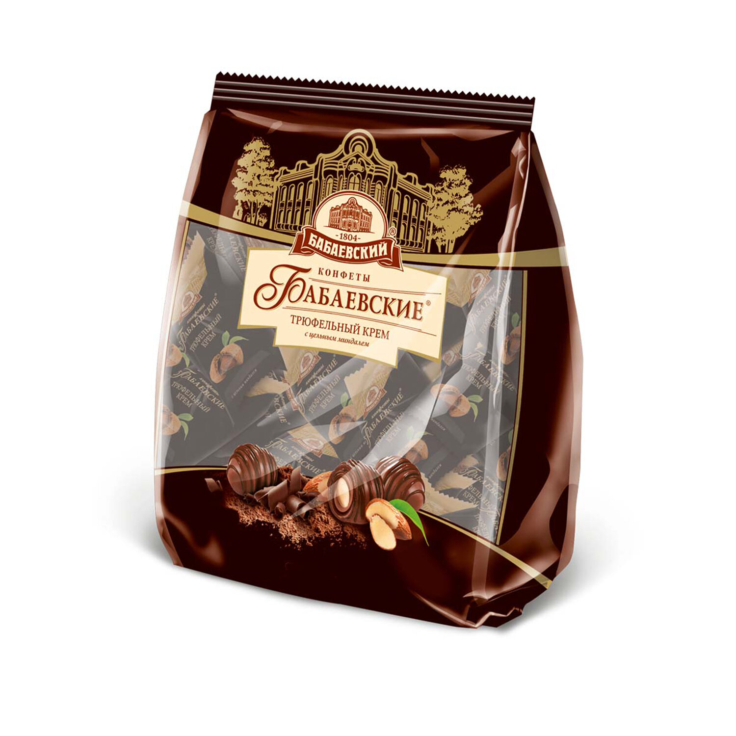 Конфеты шоколадные БАБАЕВСКИЙ, с трюфельным кремом, 200 г, пакет Код товара: 620563 278,45 ₽ Купить Производитель:БАБАЕВСКИЙ Кремовые конфеты с трюфельным вкусом и целым миндалём в хрустящей вафле, покрытые шоколадной глазурью. Производство: РоссияВес нетто: 200 гСерия: БабаевскийУпаковка: пакетВид начинки: вафля, миндальВкус: трюфельный с миндалемСрок годности: 8 мес.Фирма-производитель: ОАО "Кондитерский концерн Бабаевский"Срок годности: 8 месВес: 235 грРазмер упаковки: 6.9 × 14 × 13.1 смОбъём: 0.0016 м3Промежуточная упаковка: 5 штТранспортная упаковка: 5 штШтрих-код: 4600080442149 Файлы Сертификат-1.jpg Сертификат-2.jpg Сертификат-3.jpg Сертификат-4.jpg