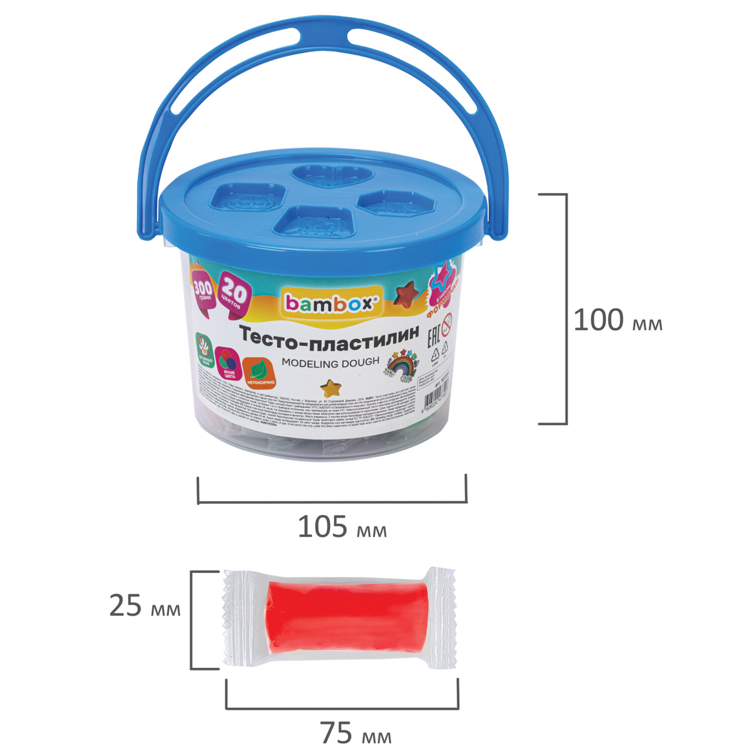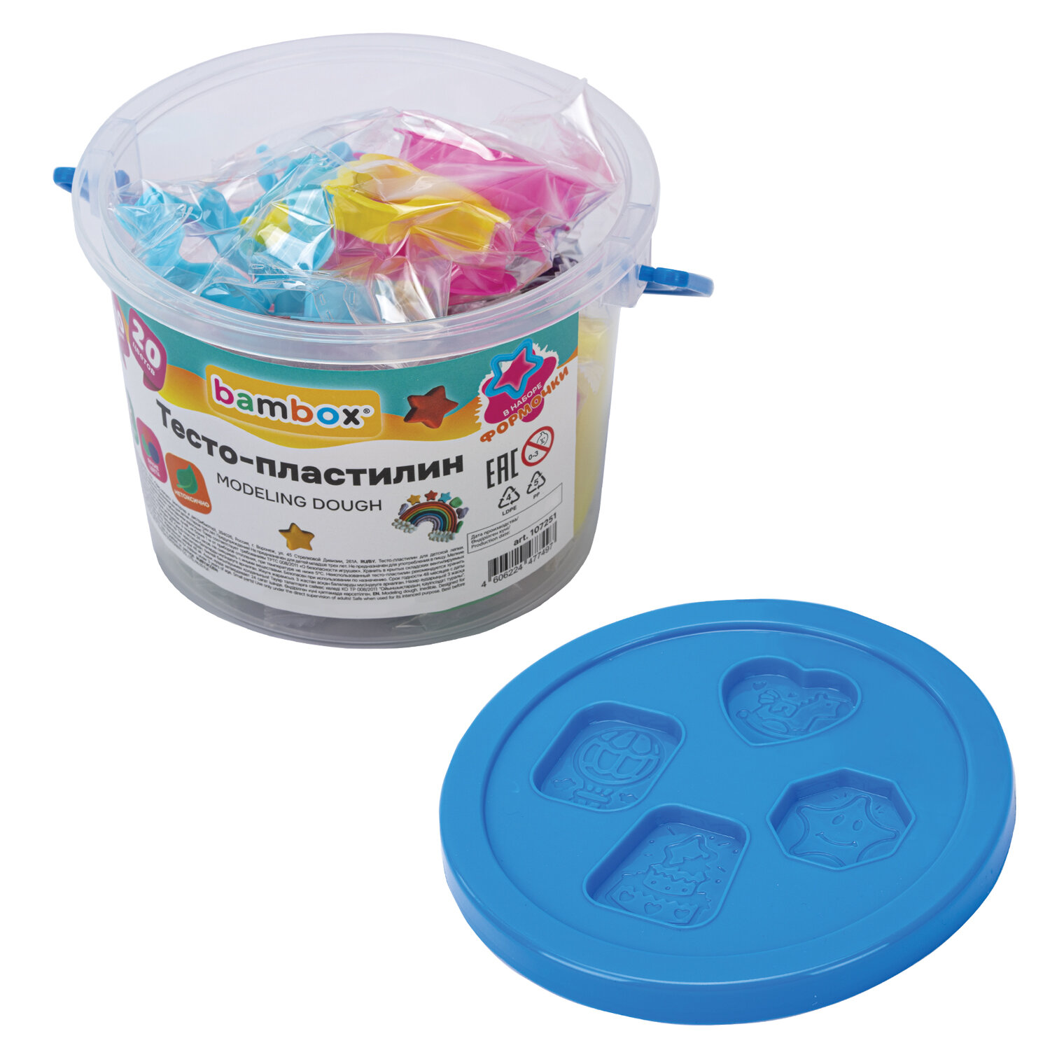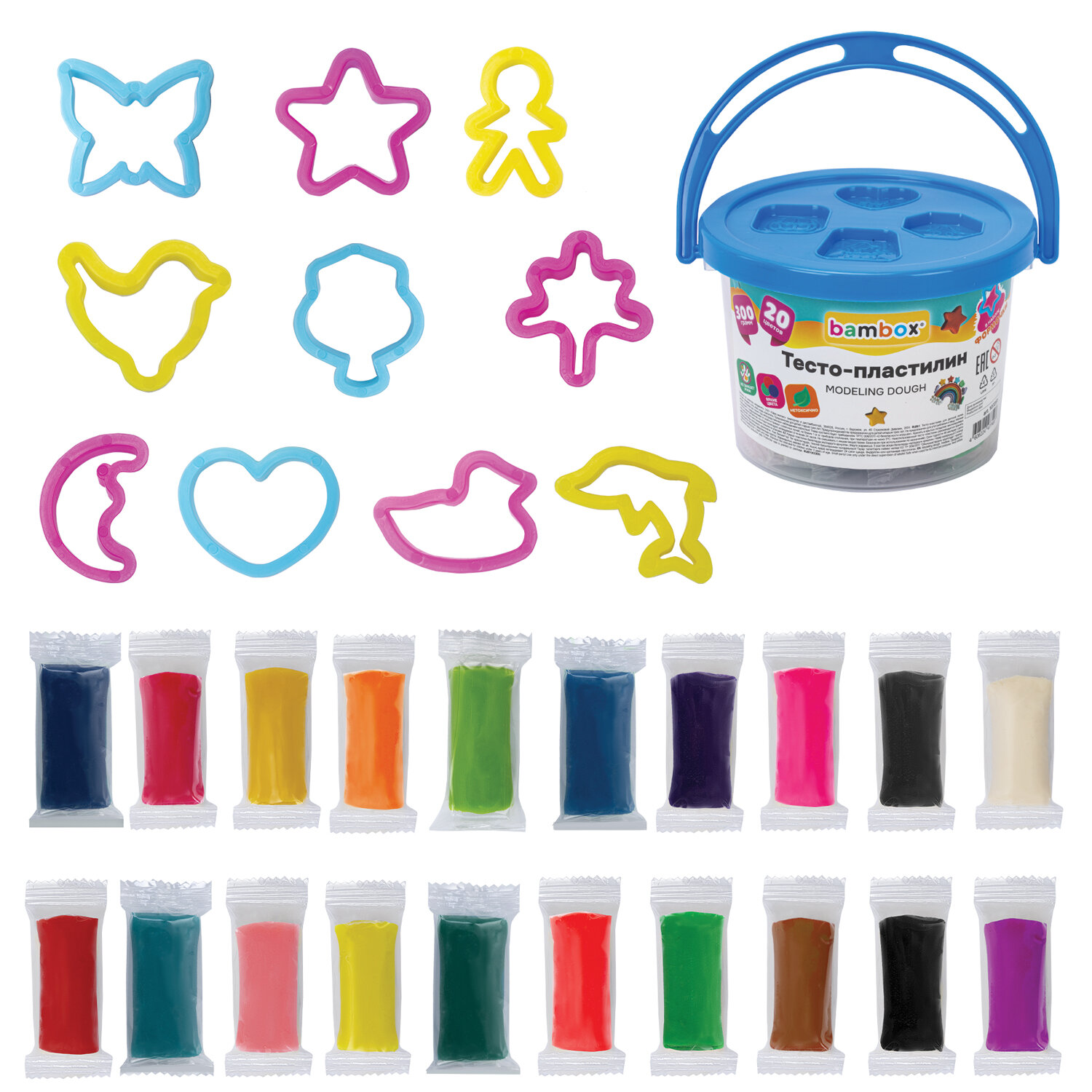 Тесто-пластилин для лепки СУПЕР ПЛАСТИЧНОЕ, 20 цветов 300 г, в пластиковом ведерке, формочки, BAMBOX (БАМБОКС) Код товара: 107251 269,88 ₽ Купить Производитель:BAMBOX Тесто-пластилин BAMBOX развивает и тренирует мелкую моторику рук ребенка, положительно влияет на его эмоциональное состояние. Тесто-пластилин BAMBOX – это пластилин на растительной основе с мягкой текстурой и безопасным составом. В набор входят 20 брусочков теста для лепки, 20 ярких цветов: красный, синий, желтый, зеленый, травянисто-зеленый, персиковый, оранжевый, коричневый, белый, черный, фиолетовый, серый, голубой, темно-синий, светло-розовый, розовый, темно-фиолетовый; 3 неоновых цвета: неоновый красный, неоновый желтый, неоновый салатовый. Цвета можно смешивать между собой и получать новые оттенки. Пластилин легко разминается, не липнет к рукам. Лучший вариант для тех, кто только учится лепить из пластилина. На открытом воздухе затвердевает через 24 часа. Каждый цвет упакован в индивидуальный пакетик, который не позволяет тесту высыхать, а также в набор входит 10 формочек для лепки. Тесто и формочки хранятся в пластиковом ведерке, которое удобно брать с собой. Благодаря натуральной рецептуре тесто безопасно для детей.Производство: КитайКоличество цветов в наборе: 20 шт.Тип: на растительной основе (тесто)Эффекты: неонНаличие аксессуара: формочкиМасса: 300 гМасса бруска: 15 гКоличество брусков в наборе: 20 шт.Серия: DoughВид упаковки: пластиковое ведерко с термоусадкойСрок годности: 48 месВес: 448 грРазмер упаковки: 9.4 × 14.1 × 13.5 смОбъём: 0.0023 м3Промежуточная упаковка: 12 штТранспортная упаковка: 24 штШтрих-код: 4606224477497 Файлы Сертификат-1.jpg Сертификат-2.jpg Сертификат-3.jpg Сертификат-4.jpg Сертификат-5.jpg Сертификат-6.jpg