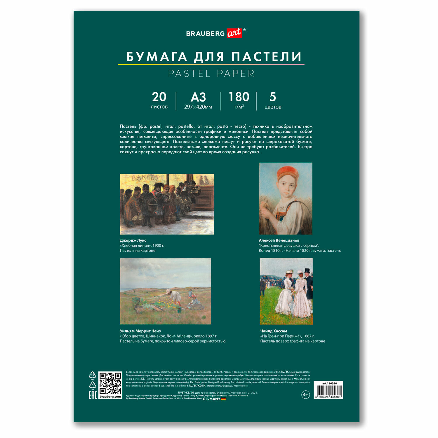 Бумага для пастели БОЛЬШАЯ А3 в папке, 20 листов, 5 цветов, 180 г/м2, BRAUBERG ART CLASSIC Код товара: 116346 284,03 ₽ Купить Производитель:BRAUBERG ART Бумага для пастели BRAUBERG предназначена для различных техник рисования. Позволяет создавать мягкие и детализированные текстуры на картинах, а при более плотной зарисовке пастель выглядит ярко и сочно. Окрашенная в массе бумага в 5 популярных цветах плотностью 180 г/м2 гарантирует превосходное сохранение работ. Еще одним преимуществом является наличие рельефной фактуры, что немаловажно для создания рисунка пастелью. Бумага упакована в картонную папку с ярким рисунком. Папка позволит сохранить ваши рисунки во время транспортировки. В ней также удобно хранить готовые работы. Внутренний блок содержит 20 листов формата А3 (297х420 мм).Производство: КитайТип товара: бумага для пастелиКоличество листов: 20Формат: А3Тип скрепления: в папкеПлотность бумаги: 180 г/м2Серия: ClassicДлина: 420 ммШирина: 297 ммДвухсторонняя: даТонированная бумага: даБез кислот: даТиснение: легкая фактураЦвет: ассортиИндивидуальная упаковка: даВес: 536 грРазмер упаковки: 0.7 × 42.6 × 31 смОбъём: 0.0011 м3Промежуточная упаковка: 15 штТранспортная упаковка: 15 штШтрих-код: 4606224444383 Сертификат-1.jpg Сертификат-2.jpg