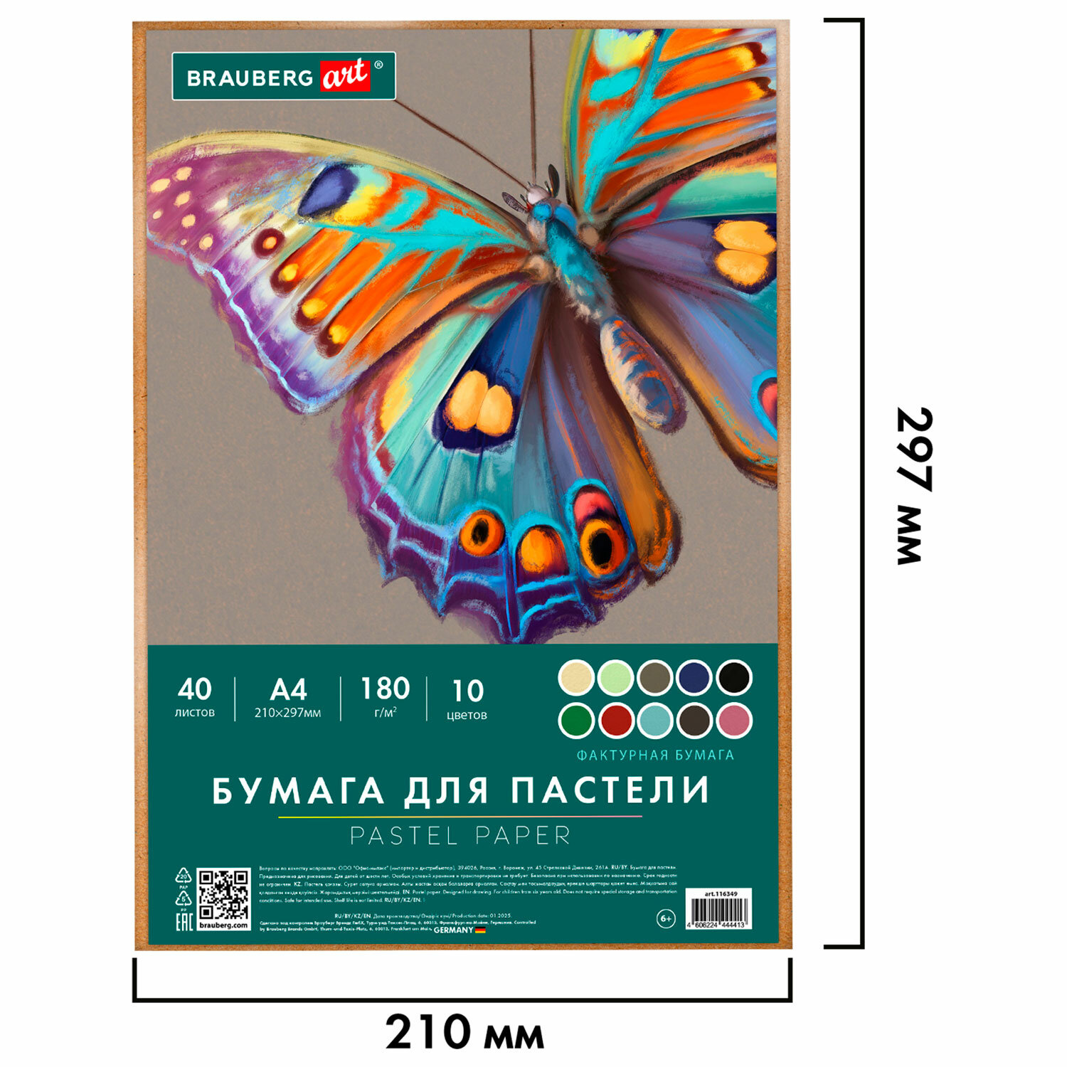 Бумага для пастели А4 в коробке, 40 листов, 10 цветов, 180 г/м2, BRAUBERG ART CLASSIC Код товара: 116349 219,25 ₽ Купить Производитель:BRAUBERG ART Бумага для пастели BRAUBERG предназначена для различных техник рисования. Позволяет создавать мягкие и детализированные текстуры на картинах, а при более плотной зарисовке пастель выглядит ярко и сочно. Окрашенная в массе бумага в 10 популярных цветах плотностью 180 г/м2 гарантирует превосходное сохранение работ. Еще одним преимуществом является наличие рельефной фактуры, что не маловажно для создания рисунка пастелью. Упаковка сделана из микрогофрокартона, что позволит сохранить ваши рисунки во время хранения и транспортировки. В ней также удобно хранить готовые работы. Внутренний блок содержит 40 листов формата А4 (210х297 мм).Производство: КитайТип товара: бумага для пастелиКоличество листов: 40Формат: А4Тип скрепления: коробПлотность бумаги: 180 г/м2Серия: ClassicДлина: 297 ммШирина: 210 ммДвухсторонняя: даТонированная бумага: даБез кислот: даТиснение: легкая фактураЦвет: ассортиИндивидуальная упаковка: даВес: 529 грРазмер упаковки: 1.8 × 30.4 × 22.2 смОбъём: 0.0013 м3Промежуточная упаковка: 15 штТранспортная упаковка: 15 штШтрих-код: 4606224444413 Сертификат-1.jpg Сертификат-2.jpg