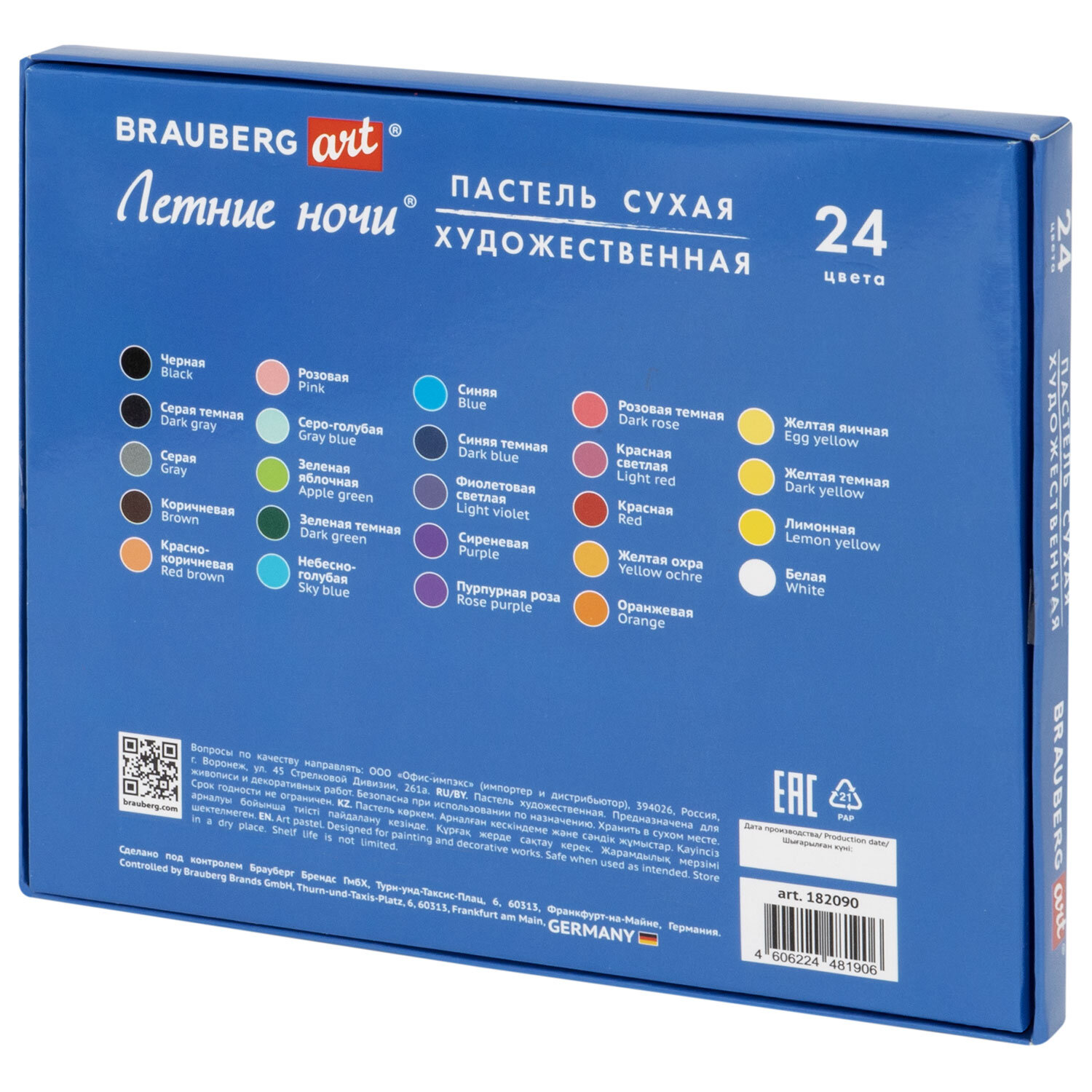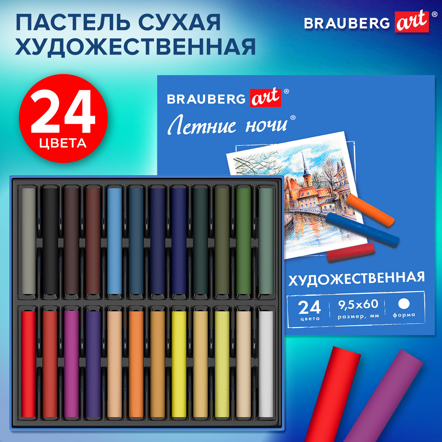 Пастель сухая художественная BRAUBERG ART "Летние ночи", 24 цвета, круглое сечение Код товара: 182090 444,08 ₽ Купить Производитель:BRAUBERG ART Сухая художественная пастель BRAUBERG ART "Летние ночи" предназначена для графики и живописи. Она отличается насыщенностью цвета, мягким письмом и не крошится при использовании. Подходит как для начинающих художников и любителей, так и профессионалов Легко ложится на различные фактуры цветной бумаги, бумагу для рисования, холст, картон, дерево, керамику. Также можно наносить на влажную поверхность или размывать водой для достижения акварельного эффекта. 24 цвета позволяют передать полную цветовую палитру. Высокое качество пигментов и связующего обеспечивает низкий расход материала, хорошую укрывистость и яркость цвета. Пастель имеет вид брусков с квадратным сечением. Не токсична и безопасна при использовании. При попадании на одежду или кожу рук легко смывается тёплой водой. Благодаря компактной упаковке удобно брать с собой. Художественная пастель пригодится школьникам, студентам, участникам мастер-классов, ученикам художественных школ, студий и училищ, живописных мастерских, так как у них представлена широкая гамма цветов. Отлично подойдёт для работы дома или пленэре. Эту пастель используют любители в качестве хобби и профессионалы. Творчество – луч света в серых буднях!Производство: КитайТип пастели: сухаяСерия: Летние ночиКоличество цветов: 24Цвета: классическиеСечение: круглоеУпаковка: картонная коробкаВес: 222 грРазмер упаковки: 1.5 × 18.2 × 15.1 смОбъём: 0.0006 м3Промежуточная упаковка: 12 штТранспортная упаковка: 48 штШтрих-код: 4606224481906 Сертификат-1.jpg Сертификат-2.jpg Сертификат-3.jpg