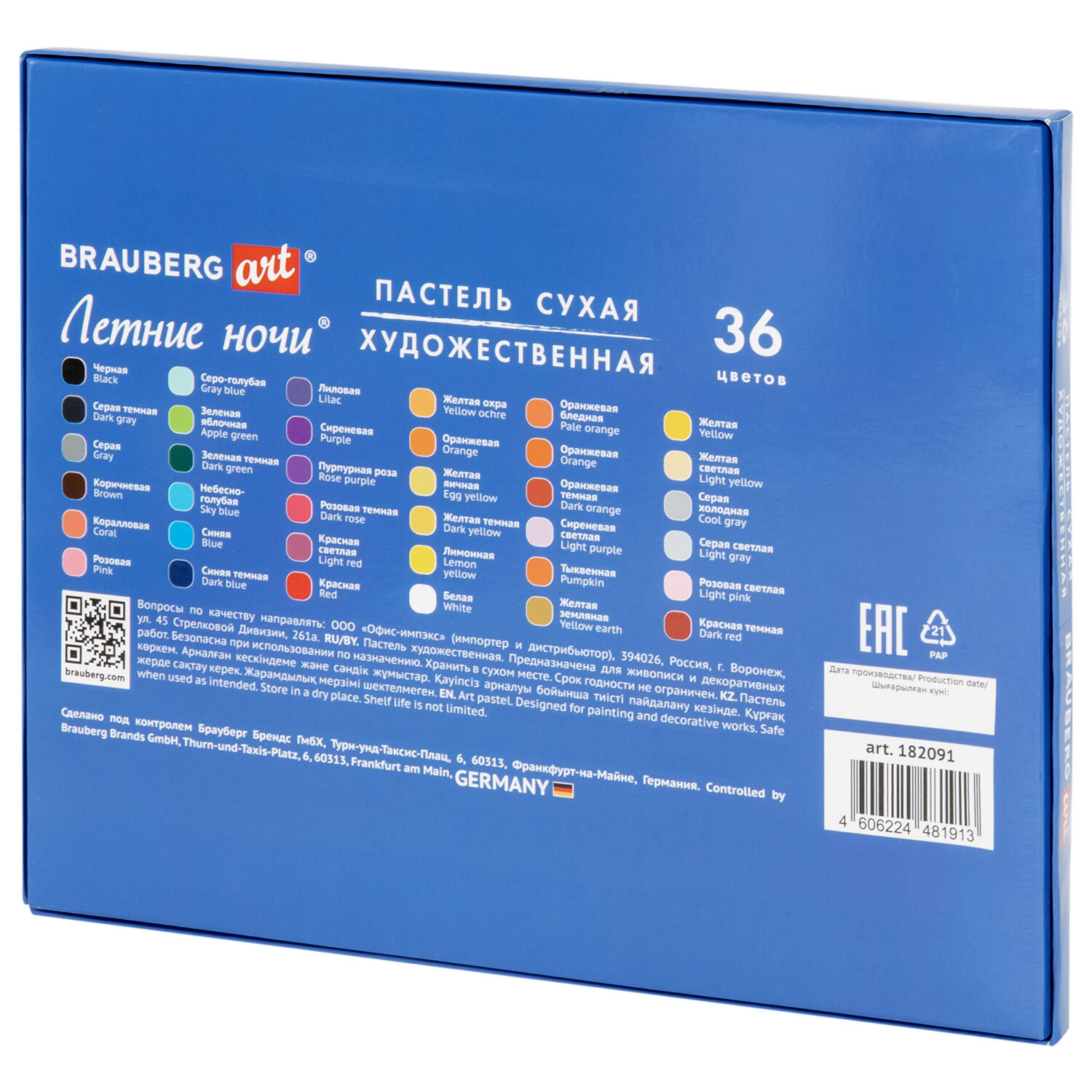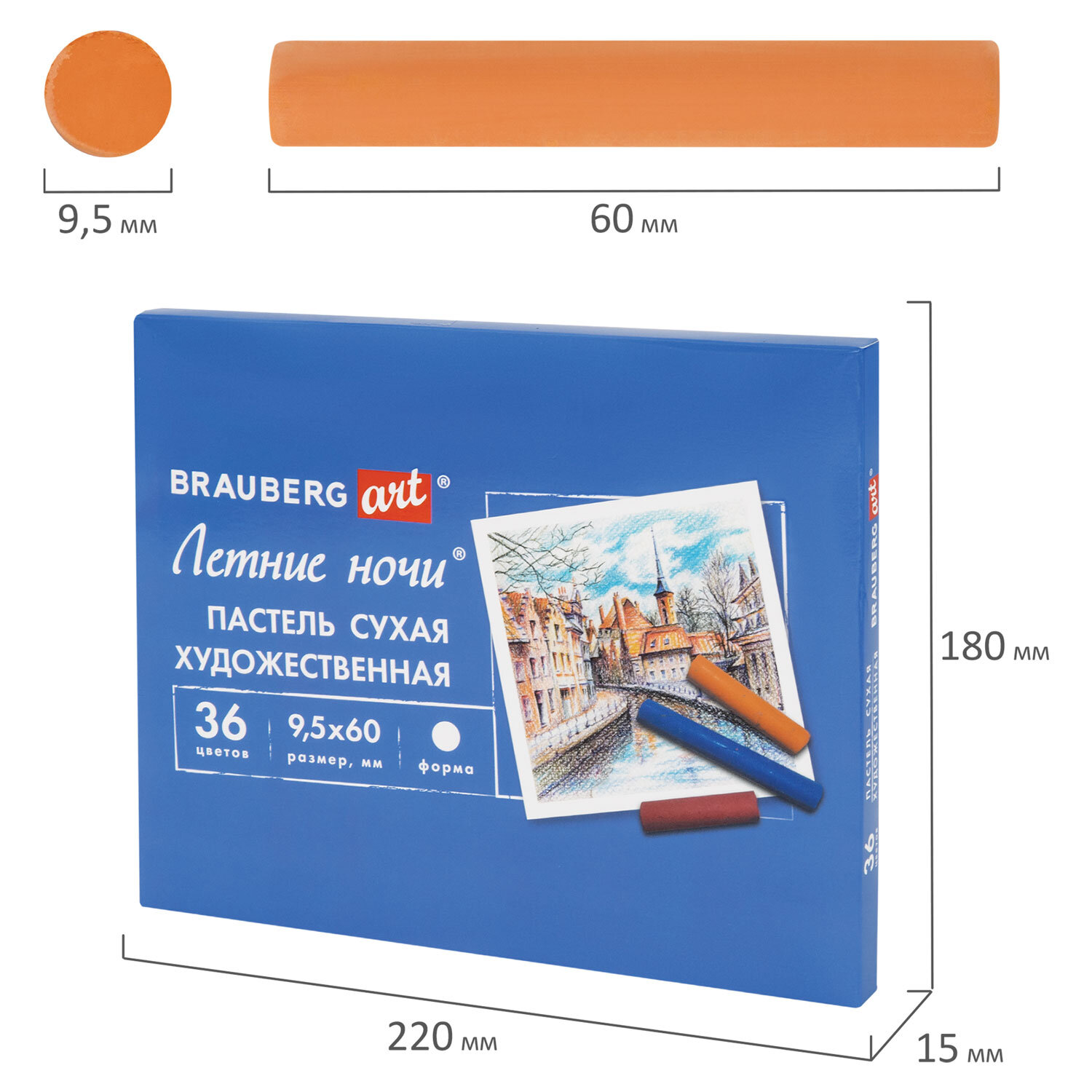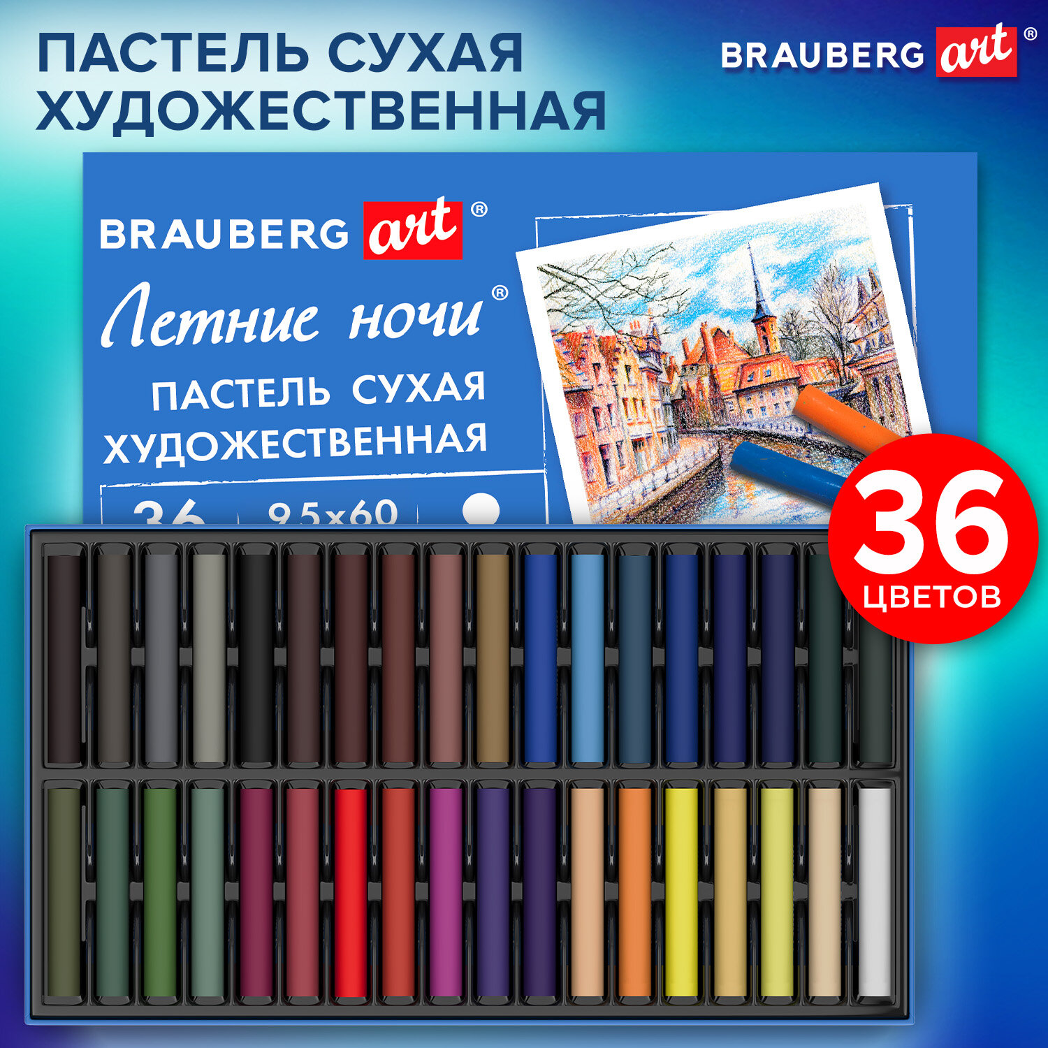 Пастель сухая художественная BRAUBERG ART "Летние ночи", 36 цветов, круглое сечение Код товара: 182091 532,93 ₽ Купить Производитель:BRAUBERG ART Сухая художественная пастель BRAUBERG ART "Летние ночи" предназначена для графики и живописи. Она отличается насыщенностью цвета, мягким письмом и не крошится при использовании. Подходит как для начинающих художников и любителей, так и профессионалов Легко ложится на различные фактуры цветной бумаги, бумагу для рисования, холст, картон, дерево, керамику. Также можно наносить на влажную поверхность или размывать водой для достижения акварельного эффекта. 36 цветов позволяют передать полную цветовую палитру. Высокое качество пигментов и связующего обеспечивает низкий расход материала, хорошую укрывистость и яркость цвета. Пастель имеет вид брусков с квадратным сечением. Не токсична и безопасна при использовании. При попадании на одежду или кожу рук легко смывается тёплой водой. Благодаря компактной упаковке удобно брать с собой. Художественная пастель пригодится школьникам, студентам, участникам мастер-классов, ученикам художественных школ, студий и училищ, живописных мастерских, так как у них представлена широкая гамма цветов. Отлично подойдёт для работы дома или пленэре. Эту пастель используют любители в качестве хобби и профессионалы. Творчество – луч света в серых буднях!Производство: КитайТип пастели: сухаяСерия: Летние ночиКоличество цветов: 36Цвета: классическиеСечение: круглоеУпаковка: картонная коробкаВес: 330 грРазмер упаковки: 1.7 × 22.4 × 17.9 смОбъём: 0.001 м3Промежуточная упаковка: 6 штТранспортная упаковка: 36 штШтрих-код: 4606224481913 Сертификат-1.jpg Сертификат-2.jpg Сертификат-3.jpg