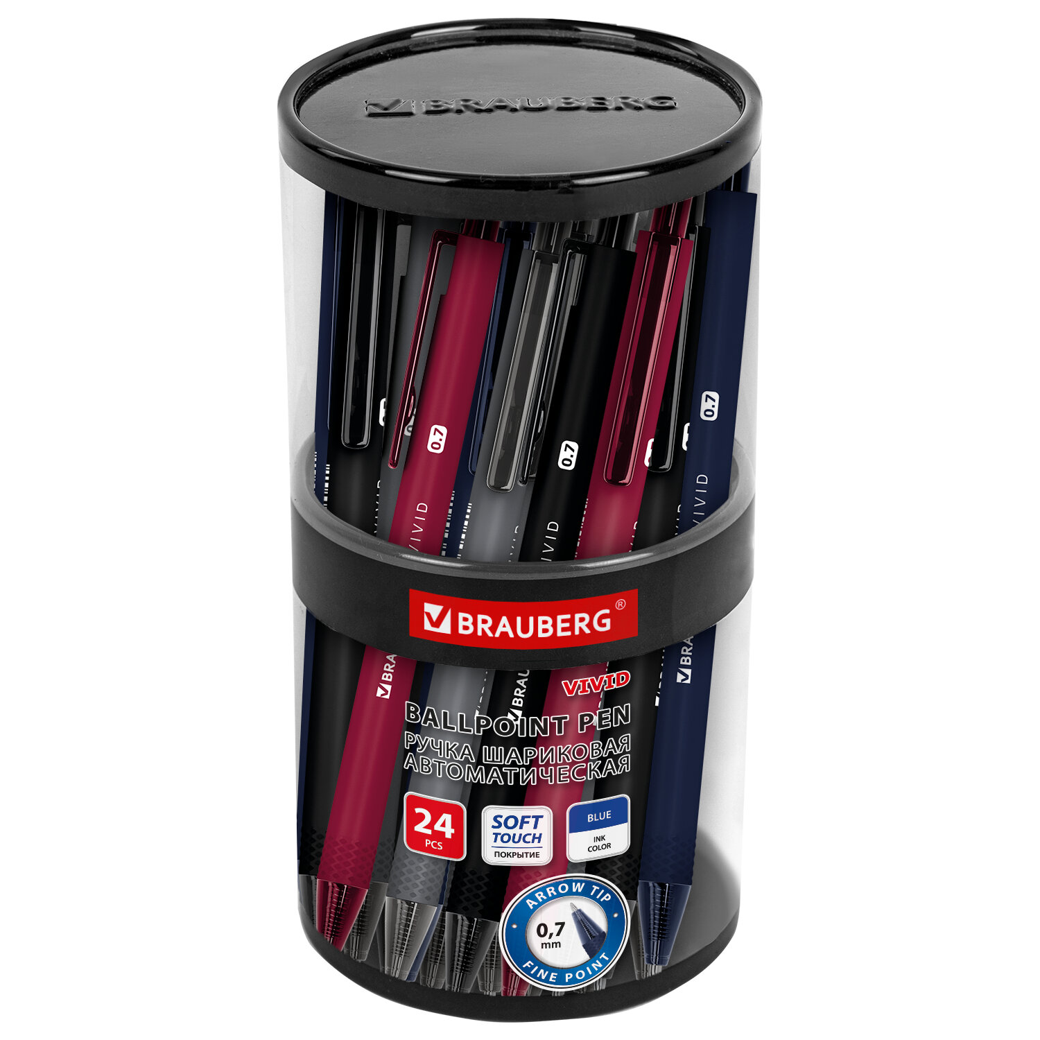 Ручка шариковая автоматическая BRAUBERG "VIVID", корпус soft-touch, СИНЯЯ, пишущий узел 0,7 мм, линия письма 0,35 мм Код товара: 144407 48,06 ₽ Купить Производитель:BRAUBERG Автоматическая шариковая ручка BRAUBERG "VIVID" обладает soft-touch покрытием и стильным дизайном корпуса в темных оттенках. Стандартный пишущий узел, диаметр которого составляет 0,7 мм, создает линию письма, равную 0,35 мм. Ручка имеет сменный стержень длиной 107 мм. Качественные чернила обеспечивают мягкое и комфортное письмо. Цвет чернил – синий. Ручки упакованы в удобную тубу для размещения в розничном магазине.Производство: КитайЦвет чернил: синийТолщина линии письма: 0.35 ммДиаметр пишущего узла: 0.7 ммФорма наконечника: стандартныйДлина сменного стержня: 107 ммКоличество в комплекте: 1 шт.Цвет корпуса: Vivid dark formДлина письма: 1000 мСерия: VIVIDДизайн: Vivid dark formФорма корпуса: круглаяПокрытие корпуса: Soft-TouchУпаковка: пластиковая тубаСрок годности: 60 месВес: 7 грРазмер упаковки: 14.5 × 1 × 1.4 смОбъём: 0.0001 м3Промежуточная упаковка: 24 штТранспортная упаковка: 864 штШтрих-код: 4606224469041