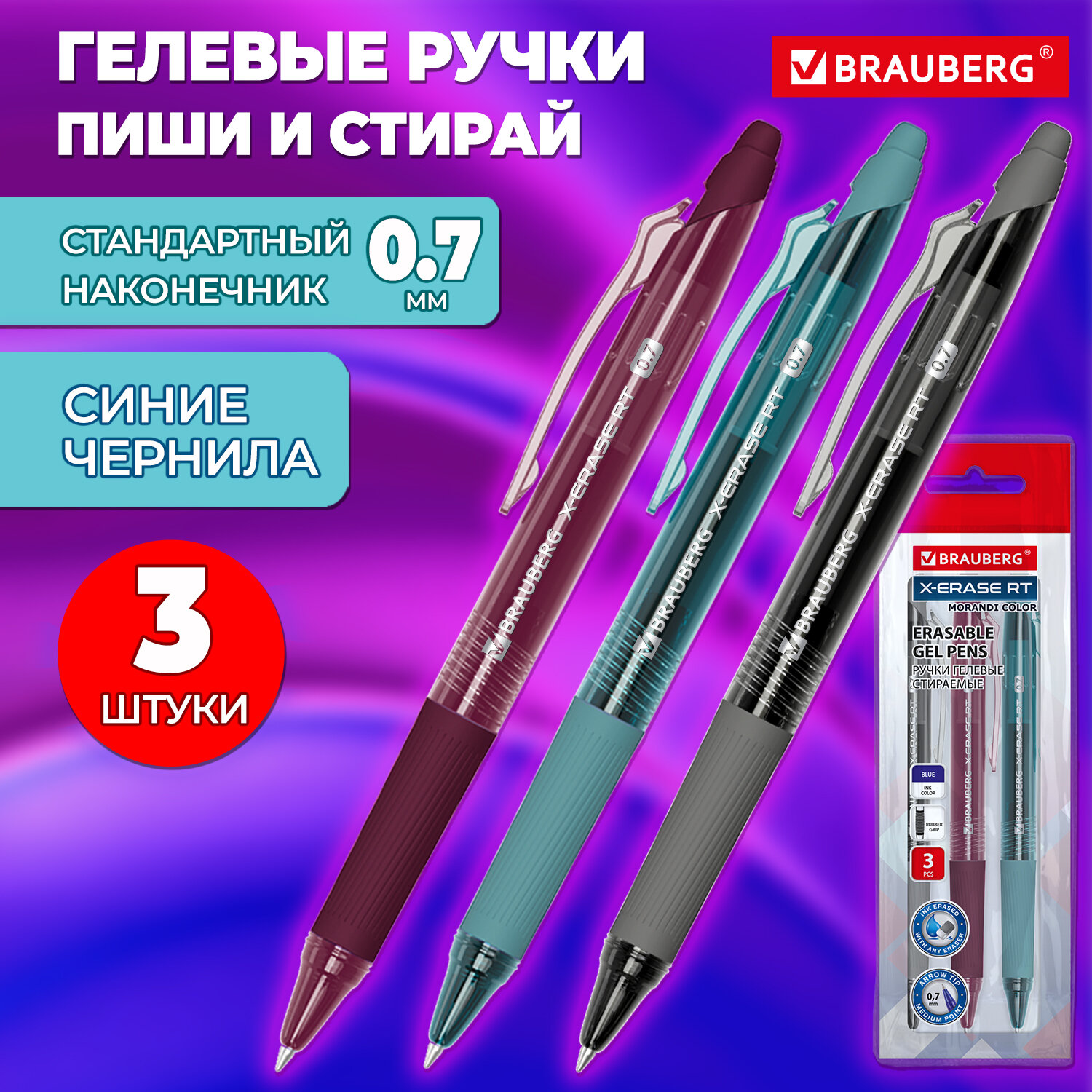 Ручки гелевые стираемые автоматические BRAUBERG "X-ERASE RT MORANDI COLOR", СИНИЕ, НАБОР 3 ШТ., пишущий узел 0,7 мм, линия 0,5 мм Код товара: 144427 288,4 ₽ Купить Производитель:BRAUBERG Набор автоматических гелевых стираемых ручек BRAUBERG "X-ERASE RT MORANDI COLOR" – ваш надежный помощник в создании чистых и аккуратных заметок без ограничений. Набор из 3 автоматических гелевых ручек BRAUBERG "X-ERASE RT PASTEL COLOR" позволяет писать синими чернилами линией толщиной 0,5 мм и с пишущим узлом 0,7 мм. Специальные гелевые чернила становятся невидимыми при нагревании до 60 °С и выше. Написанное можно восстановить при температуре ниже -18 °С. В ручку встроен ластик, что обеспечивает возможность многократного стирания и повторного письма. Записи также можно стереть любым другим ластиком. Удобная прорезиненная зона захвата гарантирует комфорт при использовании. В наборе представлены 3 приятных глазу сдержанных элегантных цветов: бордовый, бирюзовый, серый.Производство: КитайЦвет чернил: синийКоличество в комплекте: 3 шт.Толщина линии письма: 0.5 ммФорма наконечника: стандартныйАвтоматическая: даСерия: X-ERASE RTТип ручки: гелеваяСтираемые чернила: даДиаметр пишущего узла: 0.7 ммСтирание чернил: стирательной резинкойДлина сменного стержня: 97 ммКомплектация: без запасных стержнейЦвет корпуса: ассортиФорма корпуса: круглаяПокрытие корпуса: -Эргономичная зона захвата: резиновый держательУпаковка: пакетСрок годности: 60 месВес: 36 грРазмер упаковки: 1.3 × 15.6 × 5.8 смОбъём: 0.0002 м3Промежуточная упаковка: 24 штТранспортная упаковка: 288 штШтрих-код: 4606224480718 Сертификат-1.jpg Сертификат-2.jpg Сертификат-3.jpg