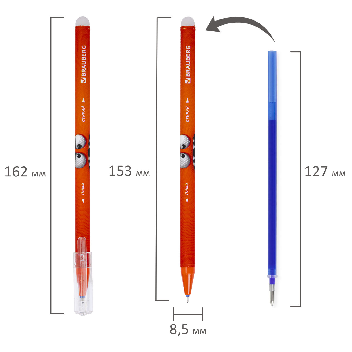 Ручка стираемая гелевая, кросс-серия "МОНСТРИКИ", BRAUBERG, СИНЯЯ, корпус ассорти, игольчатый наконечник 0,5 мм, линия 0,35 мм Код товара: 144484 43,36 ₽ Купить Производитель:BRAUBERG Ручка стираемая гелевая кросс-серии "МОНСТРИКИ" BRAUBERG – надежный проводник в мир идеальных записей. Больше не нужно бояться допустить ошибку: записи всегда можно легко исправить, просто воспользовавшись ластиком. Ручка представлена в ярких дизайнах ассорти с забавными монстриками, которые привлекают внимание своим необычным видом. Гелевые чернила синего цвета мягко и плавно ложатся на бумагу, обеспечивая комфортный процесс письма без усилий. Аккуратная линия письма 0,35 мм достигается за счет игольчатого наконечника диаметром 0,5 мм. Конструкция ручки дополнена специальным ластиком, который обеспечивает удаление чернил. Чернила являются термочувствительными и удаляются встроенным ластиком – при трении о бумагу они нагреваются и становятся бесцветными под воздействием температуры. Надписи исчезают, не оставляя следов на бумаге и не повреждая ее. Вернуть написанное возможно при охлаждении бумаги до -18 °С.Производство: КитайЦвет чернил: синийКоличество в комплекте: 1 шт.Толщина линии письма: 0.35 ммФорма наконечника: игольчатыйСерия: CuteТип ручки: гелеваяСтираемые чернила: даДиаметр пишущего узла: 0.5 ммСтирание чернил: стирательной резинкойДлина сменного стержня: 127 ммКомплектация: без запасных стержнейЦвет корпуса: МонстрикиФорма корпуса: круглаяПокрытие корпуса: -Упаковка: пластиковая тубаСрок годности: 60 месВес: 9 грРазмер упаковки: 1 × 15.9 × 1.3 смПромежуточная упаковка: 36 штТранспортная упаковка: 1728 штШтрих-код: 4606224482415 Сертификат-1.jpg Сертификат-2.jpg Сертификат-3.jpg