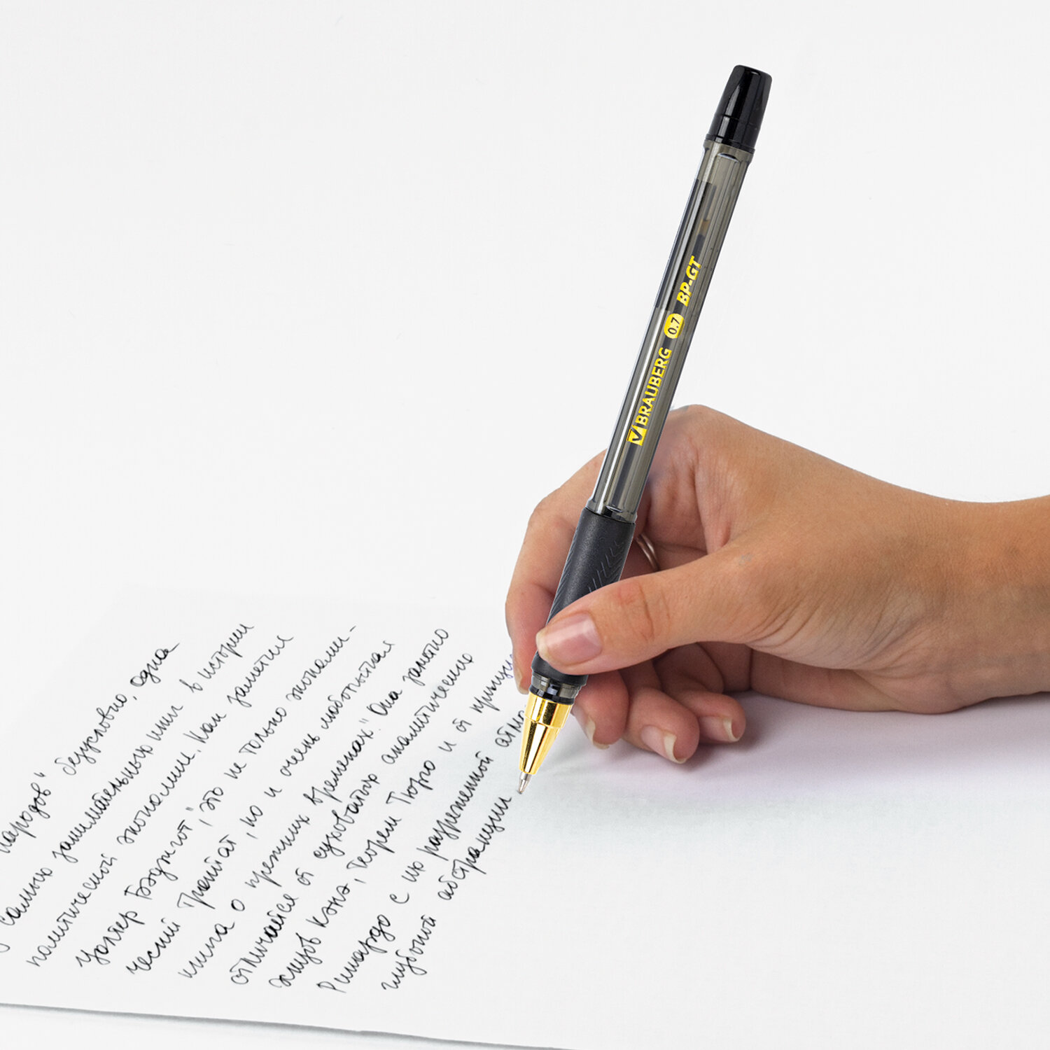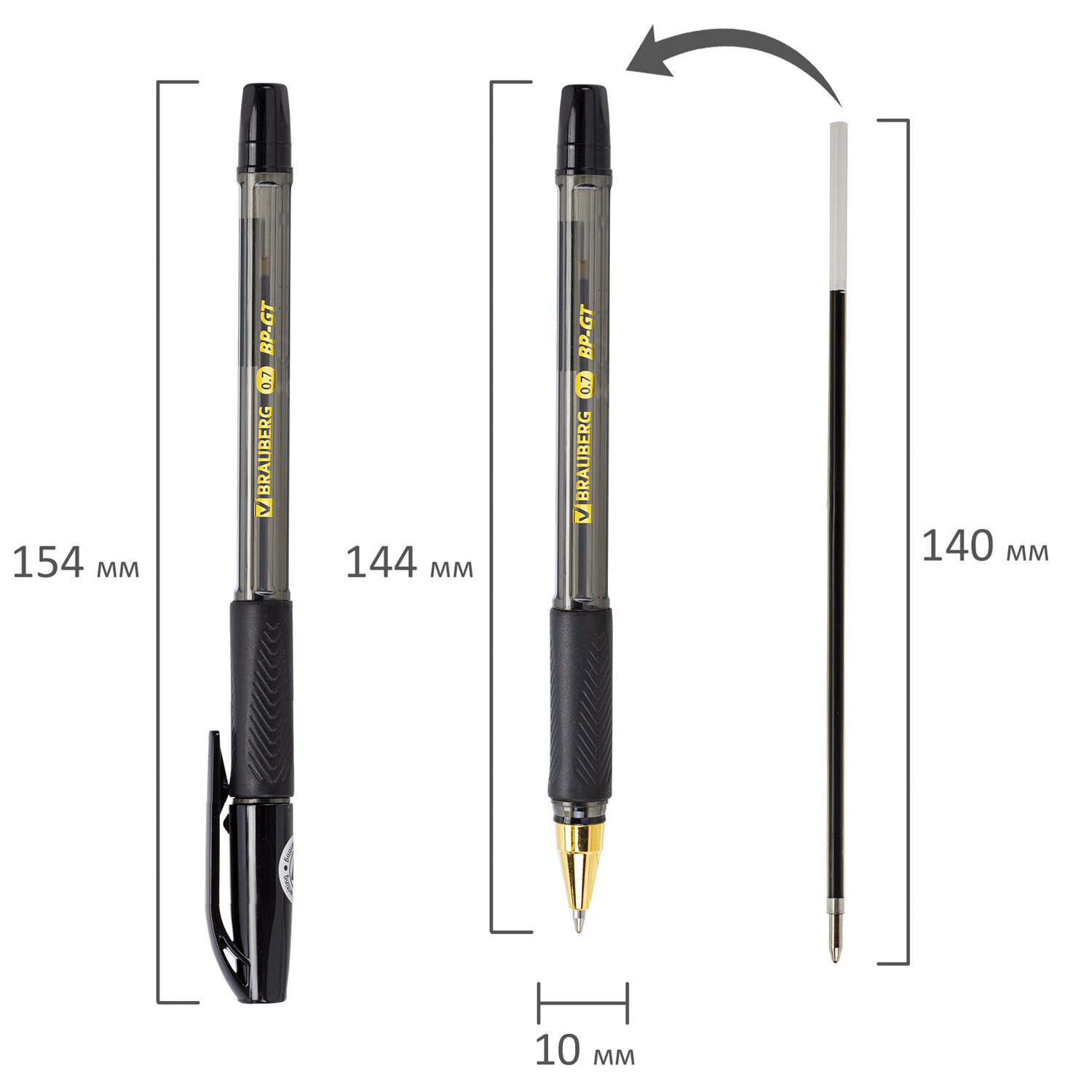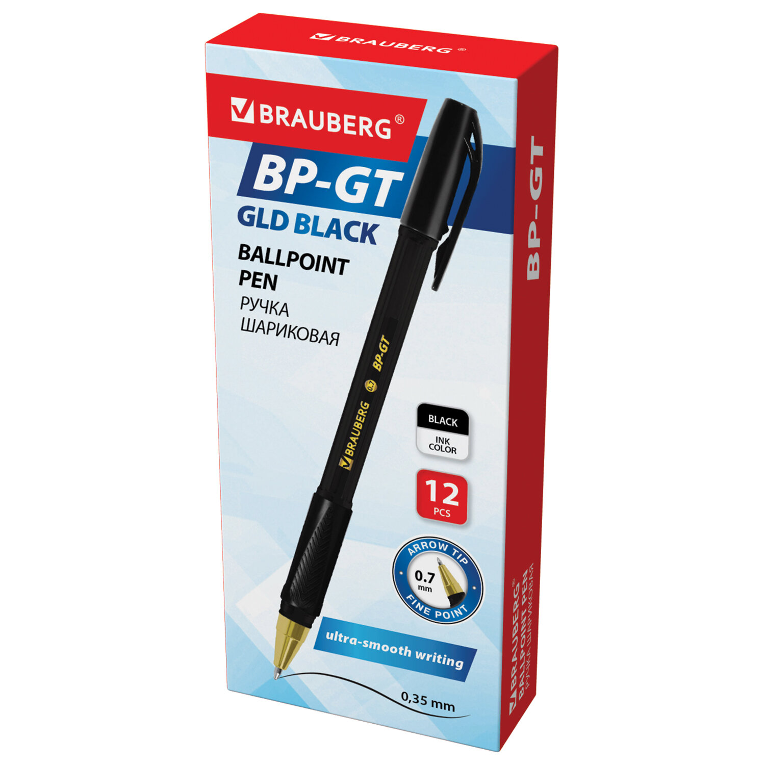 Ручка шариковая BRAUBERG BP-GT GLD BLACK, ЧЕРНАЯ, корпус тонированный, пишущий узел 0,7 мм, линия письма 0,35 мм Код товара: 144507 42,9 ₽ Купить Производитель:BRAUBERG Шариковая ручка BRAUBERG "BP-GT GLD BLACK" сочетает в себе эргономичный, функциональный корпус и классический дизайн. Шестигранный корпус ручки с ярко выраженными четырьмя гранями позволяет ручке комфортно располагаться в руке. Резиновая зона захвата эргономичной формы с фактурными деталями для комфортного долгого письма исключает скольжение пальцев. Чернила c технологией "ultra-smooth" гарантируют лёгкое и четкое письмо без усилий. Диаметр пишущего узла 0,7 мм позволяет писать тонко и четко. Корпус черного цвета и золотые детали гармонично дополняют друг друга.Производство: КитайЦвет чернил: черныйКоличество в комплекте: 1 шт.Толщина линии письма: 0.35 ммДиаметр пишущего узла: 0.7 ммЧернила на масляной основе: даФорма наконечника: стандартныйДлина сменного стержня: 140 ммСерия: BP-GTСтиль: для офиса и учебыЭргономичная зона захвата: резиновый держательЦвет корпуса: черныйДлина письма: 1500 мДизайн: черныйФорма корпуса: шестиграннаяУпаковка: картонная коробкаСрок годности: 60 месВес: 10 грРазмер упаковки: 1.1 × 15.5 × 1.5 смПромежуточная упаковка: 12 штТранспортная упаковка: 864 штШтрих-код: 4606224493060 Файлы Сертификат-1.jpg Сертификат-2.jpg Сертификат-3.jpg Сертификат-4.jpg
