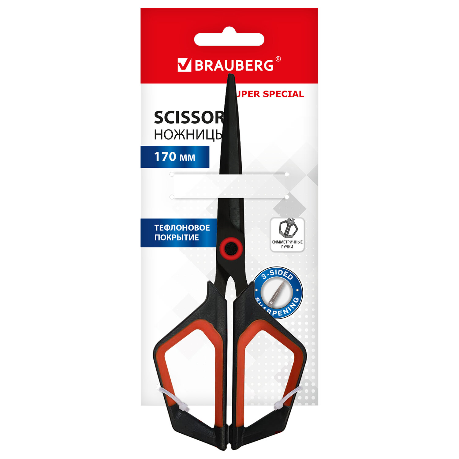 Ножницы BRAUBERG "Super special", 170 мм, черные, 3-х сторонняя заточка, тефлоновое покрытие Код товара: 238848 279,71 ₽ Купить Производитель:BRAUBERG BRAUBERG "Super special" – это ножницы для разрезания бумаги и картона. Идеальный вариант для регулярного применения в офисе или дома. Лезвия имеют 3-стороннюю заточку, ручки из пластика с резиновыми вставками. Специальная форма ручек в значительной степени облегчает выполнение работы. Прочные и долговечные лезвия обеспечивают необходимую устойчивость к износу. Тефлоновое антискользящее покрытие позволяет регулярно использовать ножницы при резке скотча, не беспокоясь о возможном его прилипании к лезвиям и появлении следов от липкой поверхности клейкой ленты. Резиновые вставки исключают скольжение пальцев рук. Это ножницы для тех, кто хочет добавить в набор канцелярских принадлежностей удобный, стильный и красивый инструмент, позволяющий в кратчайшие сроки и без лишних сложностей справиться с любой поставленной задачей – разрезанием бумаги, картона и т.д.Производство: КитайДлина: 170 ммТип ножниц: для правшиЗаточка лезвий: трёхсторонняяСимметричные ручки: даФорма лезвий: остроконечныеДлина лезвий: 90 ммСерия: Super specialМатериал лезвия: тефлоновое покрытиеМатериал ручек: пластик с резиновыми вставкамиЦвет ручек: черный/красныйУпаковка: блистер с европодвесомВес: 43 грРазмер упаковки: 2.5 × 8 × 18 смОбъём: 0.0003 м3Промежуточная упаковка: 12 штТранспортная упаковка: 288 штШтрих-код: 4606224472546