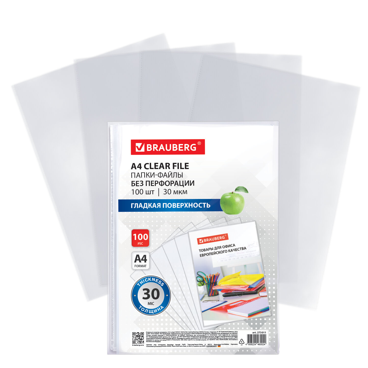 Папки-файлы БЕЗ ПЕРФОРАЦИИ для хранения и защиты документов А4 BRAUBERG, КОМПЛЕКТ 100 шт., гладкие, 30 мкм Код товара: 273011 317,75 ₽ Купить Производитель:BRAUBERG Папки-файлы без перфорации BRAUBERG предназначены для хранения и защиты бумажных документов от загрязнения и механических повреждений. Папки-файлы формата А4 БЕЗ ПЕРФОРАЦИИ с вертикальным размещением имеют гладкую поверхность и прочные швы. Файлы являются незаменимым атрибутом в офисе, позволяют систематизировать документы и обеспечивают их сохранность на долгое время. Изготовлены из прочной пленки толщиной 30 мкм. В комплект входит 100 штук.Производство: КитайФормат: А4Количество в комплекте: 100 шт.Толщина пленки: 30 мкмОриентация: вертикальнаяФактура: гладкаяСерия: StandardЦвет: прозрачныйВес: 343 грРазмер упаковки: 1 × 31.1 × 23.6 смОбъём: 0.0006 м3Промежуточная упаковка: 30 штТранспортная упаковка: 30 штШтрих-код: 4606224460024 Файлы Сертификат-1.jpg Сертификат-2.jpg Сертификат-3.jpg Сертификат-4.jpg Сертификат-5.jpg Сертификат-6.jpg Сертификат-7.jpg Сертификат-8.jpg Сертификат-9.jpg Сертификат-10.jpg Сертификат-11.jpg Сертификат-12.jpg Сертификат-13.jpg Сертификат-14.jpg Сертификат-15.jpg Сертификат-16.jpg Сертификат-17.jpg Сертификат-18.jpg Сертификат-19.jpg Сертификат-20.jpg Сертификат-21.jpg Сертификат-22.jpg Сертификат-23.jpg Сертификат-24.jpg Сертификат-25.jpg Сертификат-26.jpg