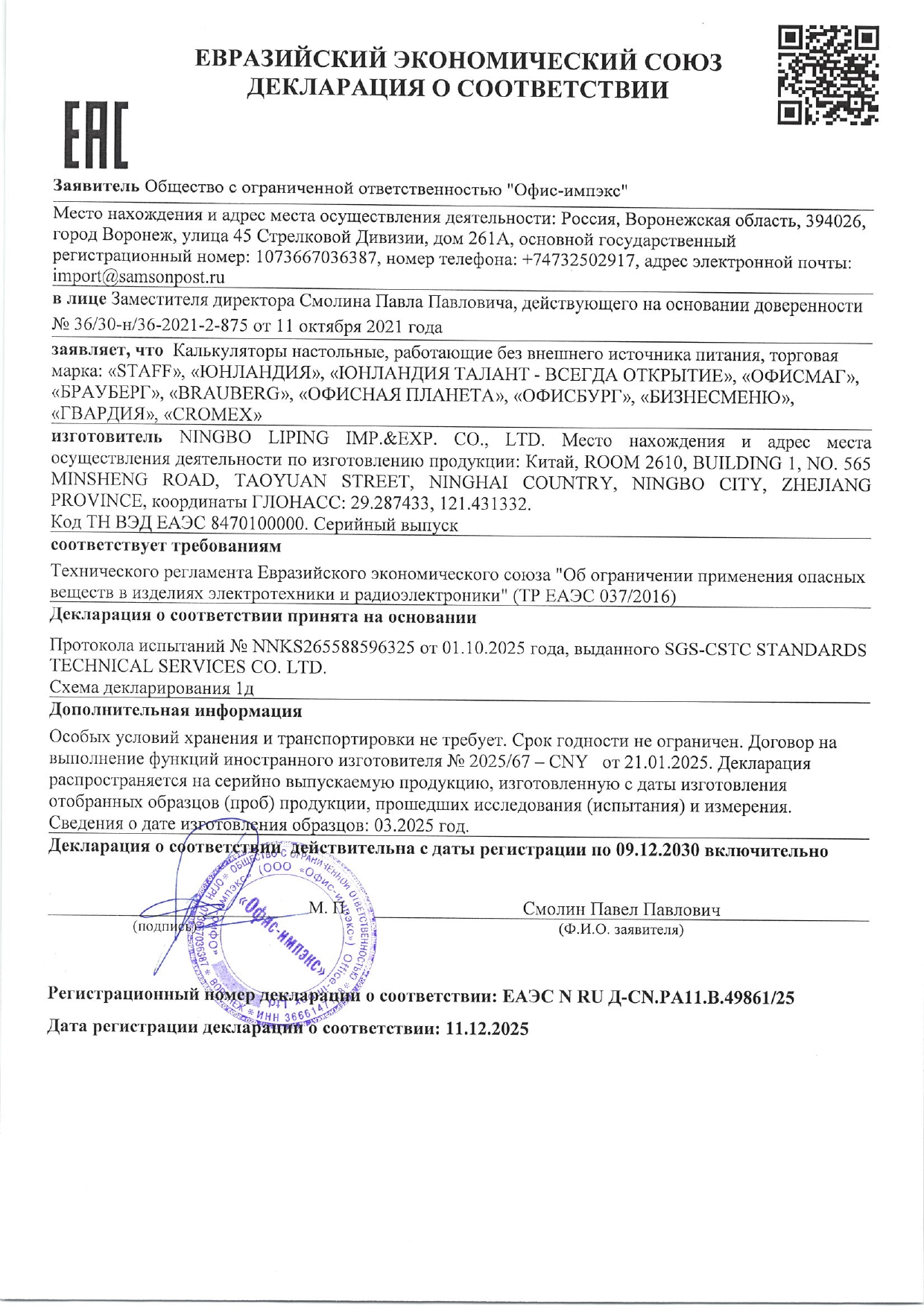 Калькулятор настольный BRAUBERG AAA-888 (202x159 мм),12 разрядов, ЧЕРНЫЙ, двойное питание Код товара: 273981 742,98 ₽ Купить Производитель:BRAUBERG Настольный калькулятор BRAUBERG AAA-888. Большой дисплей с увеличенными символами, надежный корпус и оптимальный набор наиболее используемых функций для эффективной работы. Калькулятор поддерживает ключевые арифметические действия: возведение в степень, вычисления с процентами, извлечение квадратного корня, запоминание промежуточных результатов. Подходит для бухгалтеров благодаря наличию клавиш двойной памяти, «00» и MU для расчетов налогов и торговой наценки. С переключателями округления и положения десятичного знака. Большой двенадцатиразрядный дисплей с акриловым экраном комфортно отображает большие символы с высокой точностью округления. Встроенный аккумулятор и солнечная батарея позволяют калькулятору работать при любом освещении, а клавиша выключения OFF и функция автоматического отключения (через 8-10 минут бездействия) позволяют максимально продлить срок его службы без замены батареи. Размер - 202x159 мм. Гарантия 10 лет.Производство: КитайРазрядность дисплея: 12Серия: AAA-888Тип размера: полноразмерныйТип применения: для бухгалтеровСтиль: классическийФункционал: вычисление наценки (MU), вычисление с памятью, извлечение квадратного корня, расчет процентов, сложение, вычитание, деление, умножениеИсполнение: настольныйЧисло строк дисплея: 1Материал кнопок: пластикТип питания: 1 батарейка LR54 (LR1130/AG10), солнечный элементЦвет панели: черныйДлина корпуса: 202 ммШирина корпуса: 159 ммВысота корпуса: 31 ммВес: 329 грРазмер упаковки: 3.2 × 16.2 × 20.8 смОбъём: 0.0015 м3Промежуточная упаковка: 20 штТранспортная упаковка: 80 штШтрих-код: 4606224507231 Сертификат-1.jpg Сертификат-2.jpg Сертификат-3.jpg