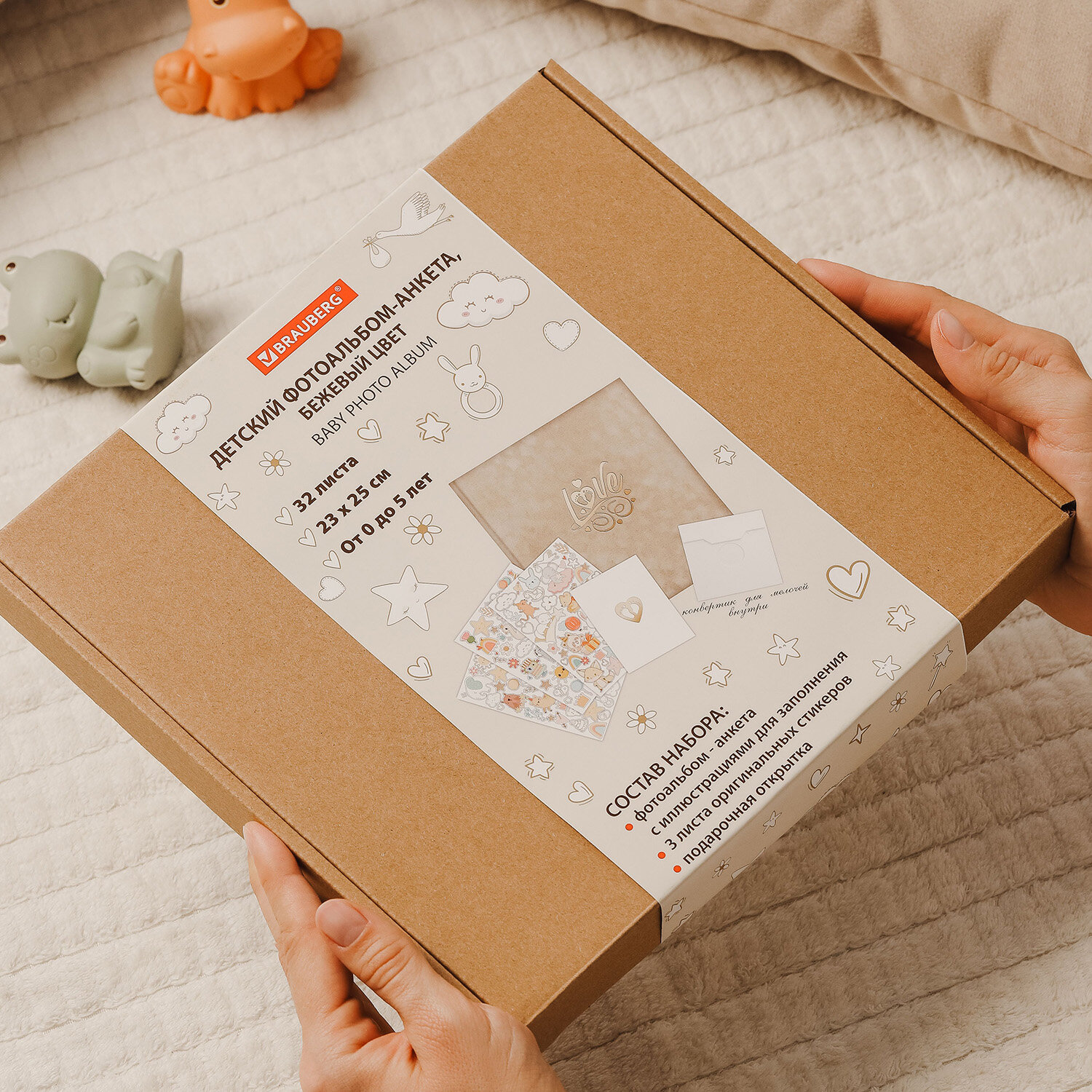 Фотоальбом-анкета детский 23х25 см, 32 листа, стикеры, открытка, конверт, бежевый бархат, BRAUBERG Код товара: 391421 803,88 ₽ Купить Производитель:BRAUBERG Детский фотоальбом-анкета BRAUBERG станет настоящей коллекцией памятных дат и событий малыша, а также отличным подарком для родителей новорожденного! Альбом состоит из 64-х бумажных страниц размером 22,6х24,6 см с красочными детскими рисунками. Каждая страница позволит сохранить значимые моменты малыша – от его рождения, первого купания и первой прогулки, и до 5 лет! Альбом c бархатной бежевой обложкой станет важным семейным архивом, ведь в нем можно описать не только историю рождения и развития малыша, но и внести информацию о семье: о маме и папе, составить семейное древо. В набор входят 3 тематических листа стикеров, открытка с ножками в подарок, а также маленький конвертик для мелочей на внутренней стороне обложки, куда можно поместить бирку из роддома, снимок УЗИ, локон ребенка. Комплект бережно упакован в термоусадочную пленку, затем помещен в подарочный коробок с красочным бумажным рукавом - идеальный подарок для семьи новорожденного!Производство: КитайТип листов: бумажные листы с рисункамиМакс. количество фотографий: 70 штРазмер фотографий: 10х15 см, 13х18 смТип обложки: бархатнаяОднотонный цвет обложки: даБазовый цвет обложки: бежевыйДизайн: LoveКоличество листов: 32 шт.Размер листа: 22,6х24,6 смСкрепление страниц: книжный переплетЦвет страниц: белый с рисункамиПоля для подписей: даВысота альбома: 23 смШирина альбома: 25 смШирина корешка: 1.5 смУпаковка: подарочная коробкаВес: 721 грРазмер упаковки: 2.8 × 24.8 × 27.4 смОбъём: 0.0029 м3Промежуточная упаковка: 4 штТранспортная упаковка: 4 штШтрих-код: 4606224508238 Файлы Сертификат-1.jpg Сертификат-2.jpg Сертификат-3.jpg Сертификат-4.jpg Сертификат-5.jpg Сертификат-6.jpg Сертификат-7.jpg Сертификат-8.jpg Сертификат-9.jpg Сертификат-10.jpg Сертификат-11.jpg Сертификат-12.jpg Сертификат-13.jpg Сертификат-14.jpg Сертификат-15.jpg Сертификат-16.jpg Сертификат-17.jpg Сертификат-18.jpg Сертификат-19.jpg Сертификат-20.jpg Сертификат-21.jpg Сертификат-22.jpg Сертификат-23.jpg Сертификат-24.jpg Сертификат-25.jpg Сертификат-26.jpg