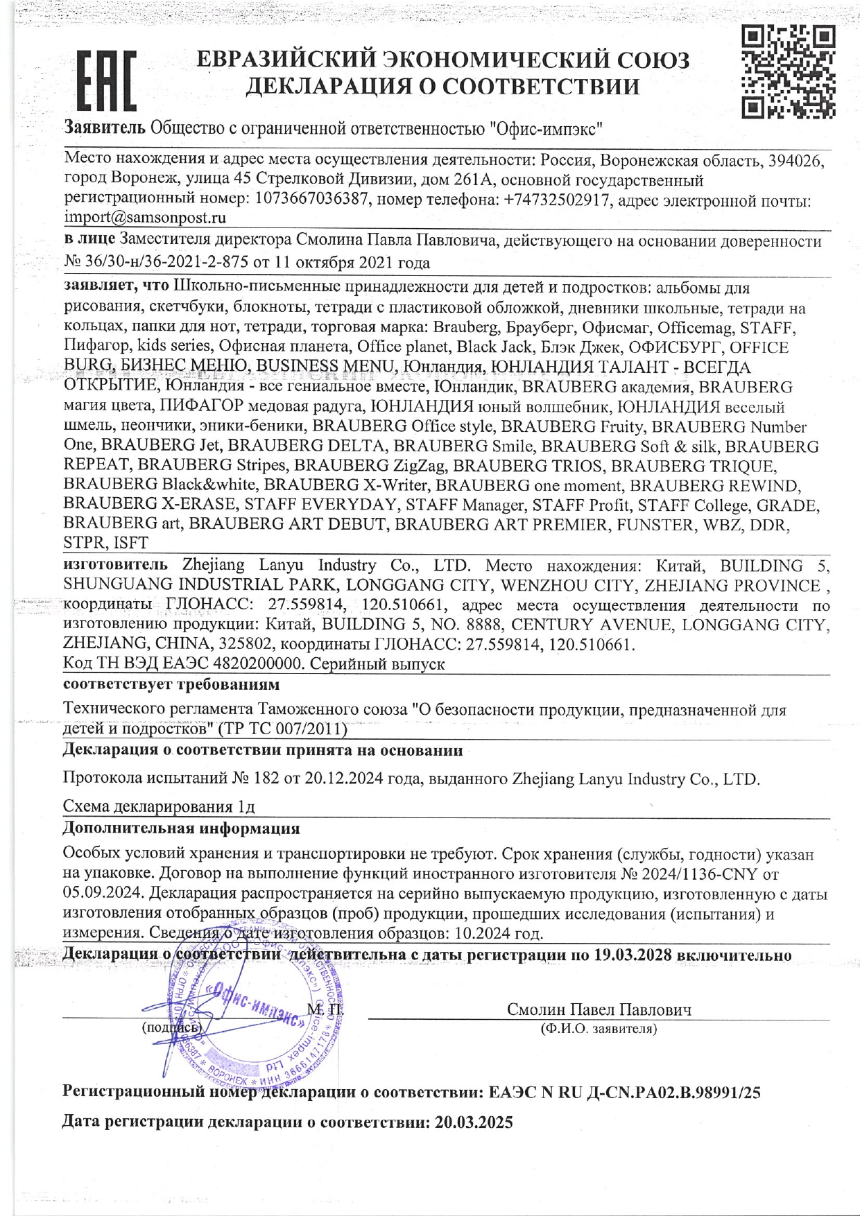 Тетрадь А4 96 л. BRAUBERG, на сшивке с корешком, клетка, обложка картон, "Flowers" Код товара: 405286 155,82 ₽ Купить Производитель:BRAUBERG Удобная, практичная тетрадь BRAUBERG незаменима для школьников средних и старших классов, студентов и офисных сотрудников. Отлично подходит для записей большого объема. Внутренний блок содержит 96 листов офсетной бумаги плотностью 60 г/м2. Обложка изготовлена из мелованного картона повышенной плотности 300 г/м2 со специальной матовой ламинацией, устойчивой к царапинам и потертостям. Линовка блока – клетка с полями, выполненная в сером цвете для комфортного письма. Сшивка надежно соединяет листы между собой. Корешок тетради проклеен плотным материалом, дополняющим дизайн. Белизна блока – 100%. Формат листов – А4. Поставляется в одном или нескольких вариантах дизайна без возможности выбора.Производство: КитайКоличество листов: 96Тип скрепления: сшивкаМатериал обложки: мелованный картонЛиновка блока: клеткаНаличие полей: даЦвет бумаги блока: белыйСерия: А4 картон 96 л.Дизайн: FlowersФормат: А4Плотность внутреннего блока: 60 г/м2Белизна: 100 %Тип спецэффектов на обложке: матовая ламинацияКоличество дизайнов в минимальной упаковке: 2 шт.Количество дизайнов в транспортной упаковке: 2 шт.Длина: 297 ммШирина: 210 ммВес: 420 грРазмер упаковки: 0.9 × 29.7 × 21.1 смОбъём: 0.0007 м3Промежуточная упаковка: 2 штТранспортная упаковка: 20 штШтрих-код: 4606224500720 Сертификат-1.jpg Сертификат-2.jpg Сертификат-3.jpg