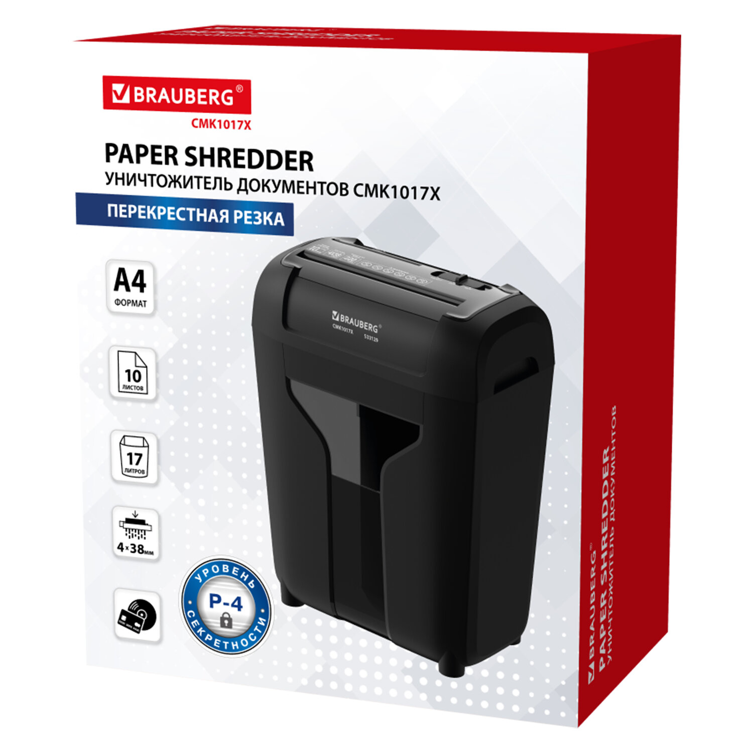 Уничтожитель (шредер) BRAUBERG CMK-1017х, 4 уровень секретности, 4х38 мм, 10 листов, корзина 17 литров Код товара: 533129 4 898,96 ₽ Купить Производитель:BRAUBERG Бесшумный уничтожитель документов (шредер) BRAUBERG CMK-1017х предназначен для уничтожения документов, компакт-дисков и пластиковых карт (банковских, дисконтных и прочих), потерявших актуальность. Отлично подходит для интенсивного персонального или коллективного использования в малом офисе. Резка на фрагменты размером 4х38 мм обеспечивает P-4 уровень секретности (DIN 66399). Устройство надежно уничтожит бумажные документы и компакт-диски с очень уязвимыми и конфиденциальными данными, а также персональными данными. Рекомендуемое количество пользователей – от 2 до 4. За один раз уничтожает 10 листов формата А4 и 1 компакт-диск. Объем корзины составляет 17 л. BRAUBERG CMK-1017x снабжен надежными ножами, способными уничтожать не только бумагу, а также компакт-диски и пластиковые карты. Шредер оснащен защитой двигателя от перегрева, что крайне важно для подобных устройств. Для удобства отслеживания наполняемости корзины отходами в ней предусмотрено прозрачное смотровое окошко. Комплектация: уничтожитель, руководство пользователя, гарантийный талон.Производство: КитайУровень секретности (DIN 66399): P-4Область применения: офисныйВозможности уничтожения: бумаги А4 (80 г/м2), дисков CD и DVD, пластиковых картРекомендуемое кол-во пользователей: 2-4Тип резки: перекрестнаяКоличество уничтожаемых листов: 10 А4Резка бумаги на полоски / фрагменты размером: 4х38 ммВремя непрерывной работы: 5 минВремя перерыва: 45 минСредняя скорость резки: 1.8 м/минОбъем приемной корзины: 17 литр.Ширина входного отверстия: 220 ммУровень шума: 60 дБАвтостарт: даРеверс: даБесшумный: даИндикатор перегрева двигателя: даВысота: 31.5 смШирина: 19 смГлубина: 42.6 смМатериал корпуса: пластикЦвет: черныйВес: 4.7 кгРазмер упаковки: 20.9 × 39.4 × 32.7 смОбъём: 0.0312 м3Промежуточная упаковка: 2 штТранспортная упаковка: 2 штШтрих-код: 4606224484808 Сертификат-1.jpg Сертификат-2.jpg Сертификат-3.jpg