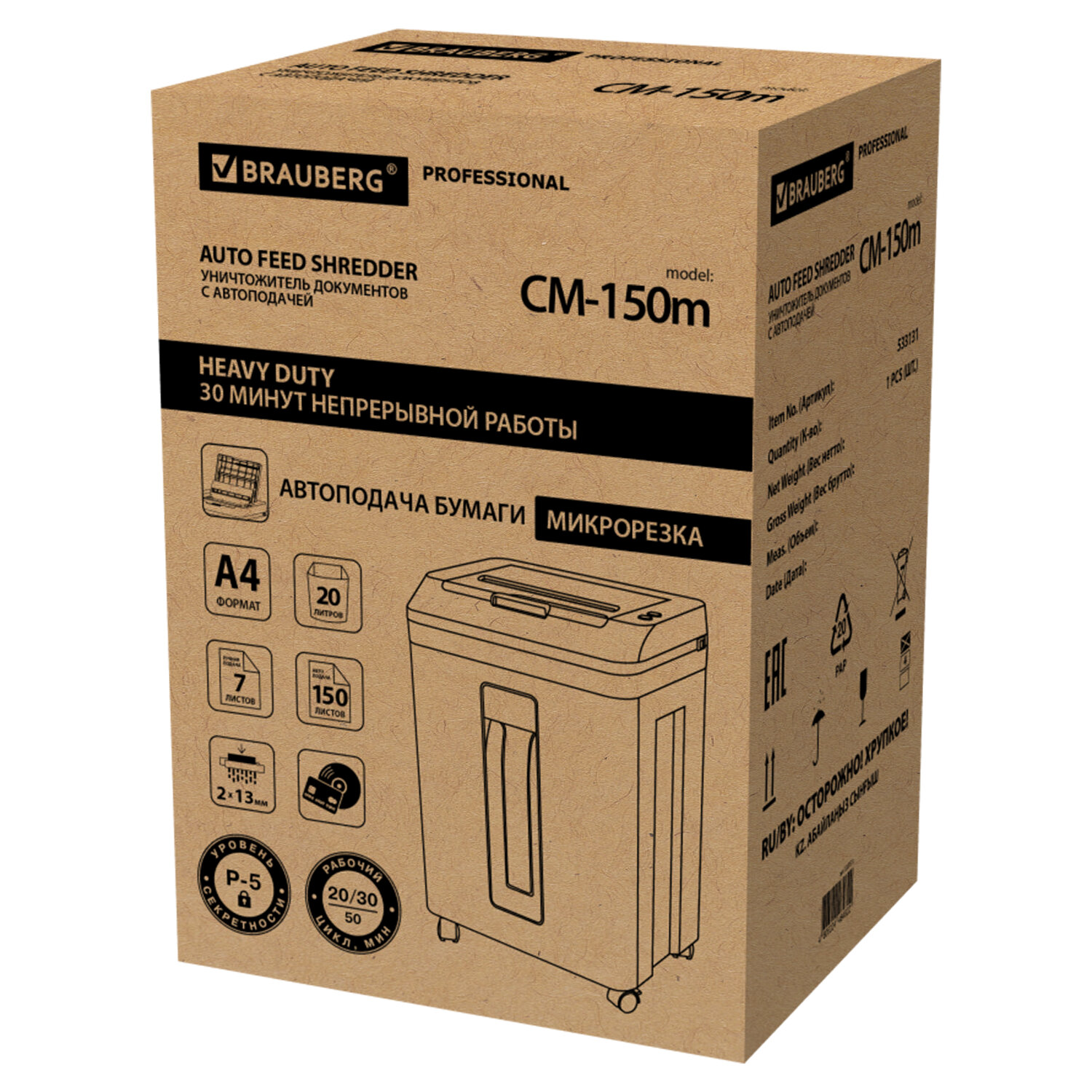 Уничтожитель (шредер) с автоподачей BRAUBERG PROFESSIONAL AUTO CM-150m, HeavyDuty, 5 уровень секретности, 2х13 мм, корзина 20 литров Код товара: 533131 14 250,58 ₽ Купить Производитель:BRAUBERG Уничтожитель документов (шредер) с функцией автоподачи BRAUBERG PROFESSIONAL AUTO CM-150m предназначен для продолжительного уничтожения документов, потерявших актуальность. Отлично подходит для интенсивного персонального или коллективного использования в среднем и большом офисе. Резка на фрагменты размером 2х13 мм обеспечивает P-5 уровень секретности (DIN 66399). Устройство надежно уничтожит бумажные документы с очень уязвимыми и конфиденциальными данными, а также персональными данными. Рекомендуемое количество пользователей – от 5 до 10. За один раз уничтожает 150 листов формата А4. Объем корзины составляет 20 л. Основным преимуществом BRAUBERG PROFESSIONAL AUTO CM-150m является удобная функция автоподачи. Положите в лоток пачку бумажных документов (до 150 листов А4) и продолжайте заниматься своим рабочим функционалом, не отвлекаясь на уничтожение документов. Кроме того, в ручном режиме можно уничтожить до 7 листов бумаги. Шредер отличается высокой продолжительностью непрерывной работы – до 30 минут в режиме автоподачи. Уничтожитель BRAUBERG PROFESSIONAL AUTO CM-150m снабжен надежными ножами, способными уничтожать не только бумагу, но и компакт-диски и пластиковые карты. Шредер также оснащен защитой двигателя от перегрева, что является частой причиной выхода этой дорогостоящей запчасти из строя на уничтожителях бумаги других производителей. Для удобства отслеживания наполняемости корзины отходами в ней предусмотрено прозрачное смотровое окошко. Комплектация: уничтожитель, руководство пользователя, гарантийный талон.Производство: КитайУровень секретности (DIN 66399): P-5Область применения: офисныйВозможности уничтожения: бумаги А4 (80 г/м2), дисков CD и DVD, пластиковых картРекомендуемое кол-во пользователей: 5-10Тип резки: микрорезкаКоличество уничтожаемых листов: 150 А4Резка бумаги на полоски / фрагменты размером: 2x13 ммВремя непрерывной работы: 30 минВремя перерыва: 50 минСредняя скорость резки: 1.6 м/минОбъем приемной корзины: 20 литр.Ширина входного отверстия: 220 ммУровень шума: 58 дБАвтоподача бумаги: даАвтостарт: даРеверс: даБесшумный: даИндикатор перегрева двигателя: даИндикатор заполнения корзины : даКомплектуется колесиками: даВысота: 35.2 смШирина: 26.2 смГлубина: 53 смМатериал корпуса: пластикЦвет: белый/черныйВес: 8.7 кгРазмер упаковки: 60.8 × 42.2 × 36.1 смОбъём: 0.0926 м3Промежуточная упаковка: 1 штТранспортная упаковка: 1 штШтрих-код: 4606224484822 Сертификат-1.jpg Сертификат-2.jpg Сертификат-3.jpg