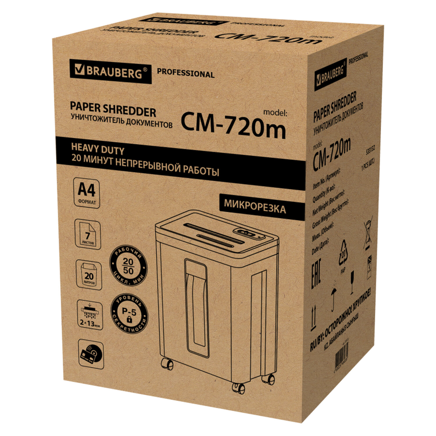 Уничтожитель (шредер) BRAUBERG PROFESSIONAL CM-720m, "Heavy Duty", 5 уровень секретности, 2х13 мм, 7 листов, корзина 20 литров Код товара: 533132 11 745,86 ₽ Купить Производитель:BRAUBERG Бесшумный уничтожитель документов (шредер) BRAUBERG PROFESSIONAL CM-720m с улучшенным рабочим циклом предназначен для продолжительного уничтожения документов, потерявших актуальность. Отлично подходит для интенсивного персонального или коллективного использования в малом и среднем офисе. Резка на фрагменты размером 2х13 мм обеспечивает P-5 уровень секретности (DIN 66399). Устройство надежно уничтожит бумажные документы с очень уязвимыми и конфиденциальными данными, а также персональными данными. Рекомендуемое количество пользователей – от 3 до 5. За один раз уничтожает 7 листов формата А4. Объем корзины составляет 20 л. Благодаря технологии "Heavy Duty" устройство может работать до 20 минут без перерыва. Уничтожитель BRAUBERG PROFESSIONAL CM-720m снабжен надежными ножами, способными уничтожать не только бумагу, а также компакт-диски и пластиковые карты. Шредер также оснащен защитой двигателя от перегрева, что является частой причиной выхода этой дорогостоящей запчасти из строя на уничтожителях бумаги других производителей. Для удобства отслеживания наполняемости корзины отходами в ней предусмотрено прозрачное смотровое окошко. Комплектация: уничтожитель, руководство пользователя, гарантийный талон.Производство: КитайУровень секретности (DIN 66399): P-5Область применения: офисныйВозможности уничтожения: бумаги А4 (80 г/м2), дисков CD и DVD, пластиковых картРекомендуемое кол-во пользователей: 3-5Тип резки: микрорезкаКоличество уничтожаемых листов: 7 А4Резка бумаги на полоски / фрагменты размером: 2x13 ммВремя непрерывной работы: 20 минВремя перерыва: 50 минСредняя скорость резки: 1.6 м/минОбъем приемной корзины: 20 литр.Ширина входного отверстия: 220 ммУровень шума: 58 дБАвтостарт: даРеверс: даБесшумный: даИндикатор перегрева двигателя: даКомплектуется колесиками: даВысота: 35.2 смШирина: 26.2 смГлубина: 49.6 смМатериал корпуса: пластикЦвет: белый/черныйВес: 7.9 кгРазмер упаковки: 57.8 × 42.1 × 36.1 смОбъём: 0.0878 м3Промежуточная упаковка: 1 штТранспортная упаковка: 1 штШтрих-код: 4606224484839 Сертификат-1.jpg Сертификат-2.jpg Сертификат-3.jpg