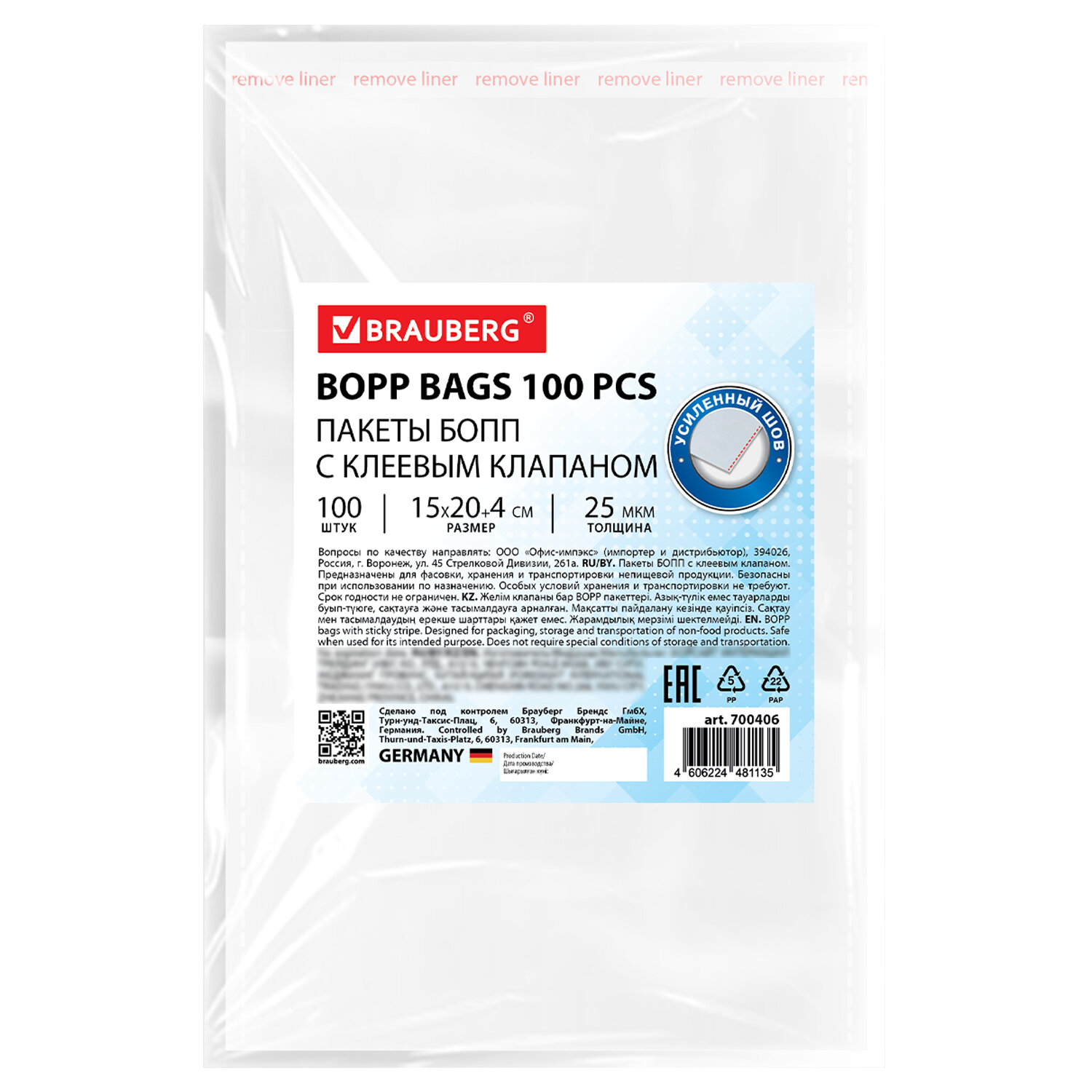 Пакеты БОПП с клеевым клапаном КОМПЛЕКТ 100 штук, 15х20 + 4 см, 25 мкм, с усиленным швом, BRAUBERG Код товара: 700406 141,32 ₽ Купить Производитель:BRAUBERG Пакеты БОПП BRAUBERG – это идеальное решение для упаковки. Они обеспечивают надежную защиту содержимого, сохраняя свежесть и привлекательный внешний вид. БОПП-упаковка BRAUBERG выполнена из прочного, прозрачного и влагостойкого полипропилена, который подчеркивает эстетику продукта и делает его более привлекательным. Материал надежно защищает содержимое от влаги и пыли, а удобный клеевой клапан обеспечивает быстрое запечатывание. Усиленный шов предотвращает разрывы и повышает долговечность упаковки. Размер: 15х20 см. Клеевой клапан: 15х4 см. Толщина: 25 мкм. Количество: 100 штук.Производство: КитайТип товара: пакеты БОППРазмер: 15х20 смТолщина: 25 мкмКоличество в комплекте: 100 шт.Материал: БОППОсобенности: клеевой крайТип упаковки: пакетВес: 165 грРазмер упаковки: 0.7 × 24.6 × 17.4 смОбъём: 0.0003 м3Промежуточная упаковка: 140 штТранспортная упаковка: 140 штШтрих-код: 4606224481135 Сертификат-1.jpg Сертификат-2.jpg