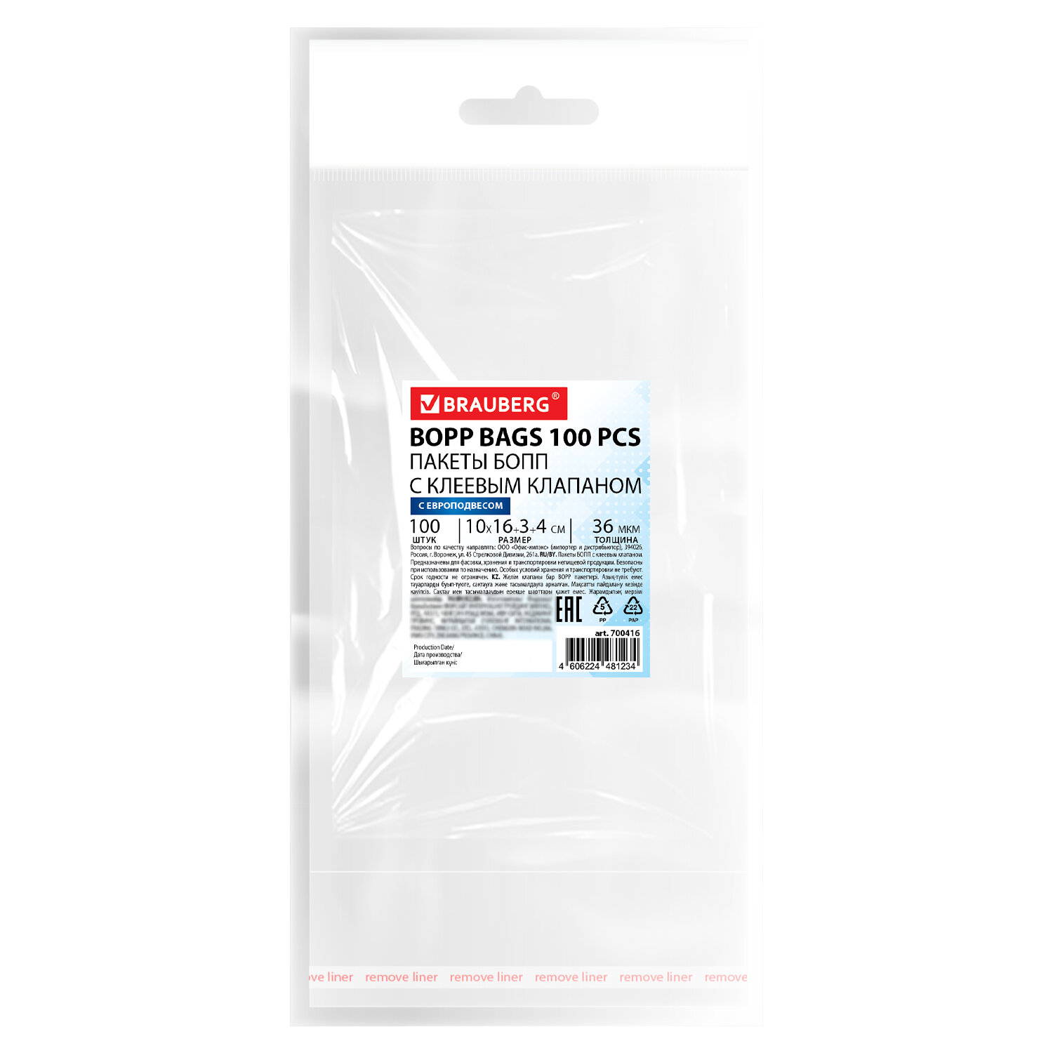 Пакеты БОПП с европодвесом, клеевым клапаном, КОМПЛЕКТ 100 штук, 10х16 + 3 + 4 см, белая подложка, BRAUBERG Код товара: 700416 198,77 ₽ Купить Производитель:BRAUBERG Пакеты БОПП BRAUBERG – это идеальное решение для упаковки. Они обеспечивают надежную защиту содержимого, сохраняя свежесть и привлекательный внешний вид. Пакеты БОПП BRAUBERG выполнены из прочного, прозрачного и влагостойкого полипропилена. Такая упаковка подчеркивает эстетику продукта и надежно защищает его от пыли и влаги. Удобный клеевой клапан ускоряет процесс фасовки, а европодвес позволяет разместить товар на крючке. Размер: 10х16 см. Клеевой клапан: 10х4 см. Толщина: 36 мкм. Количество: 100 штук.Производство: КитайТип товара: пакеты БОПП с европодвесомРазмер: 10х16 смТолщина: 36 мкмКоличество в комплекте: 100 шт.Материал: БОППОсобенности: клеевой крайТип упаковки: пакетВес: 149 грРазмер упаковки: 1.3 × 23.6 × 11.4 смОбъём: 0.0003 м3Промежуточная упаковка: 100 штТранспортная упаковка: 100 штШтрих-код: 4606224481234 Сертификат-1.jpg Сертификат-2.jpg