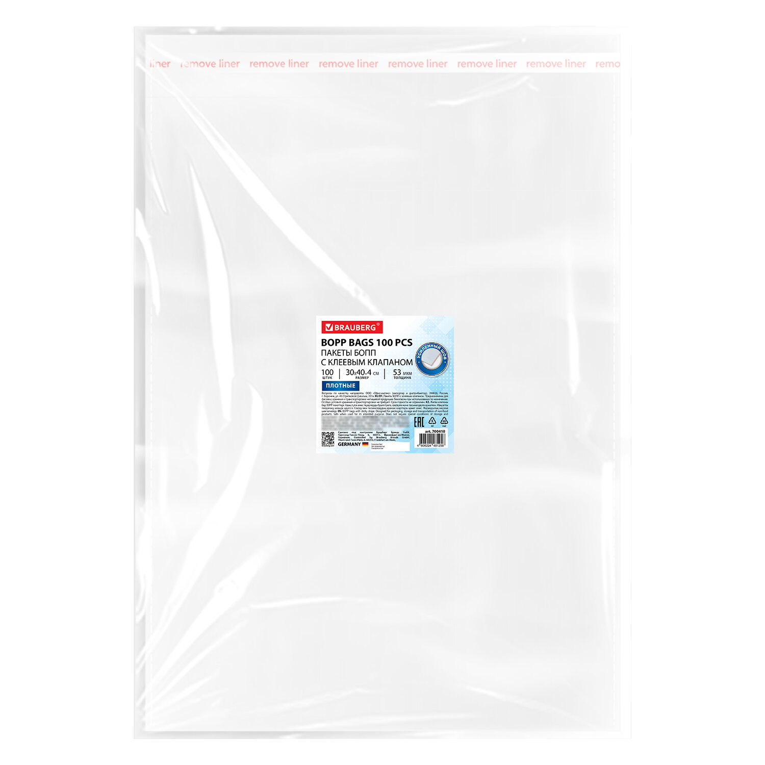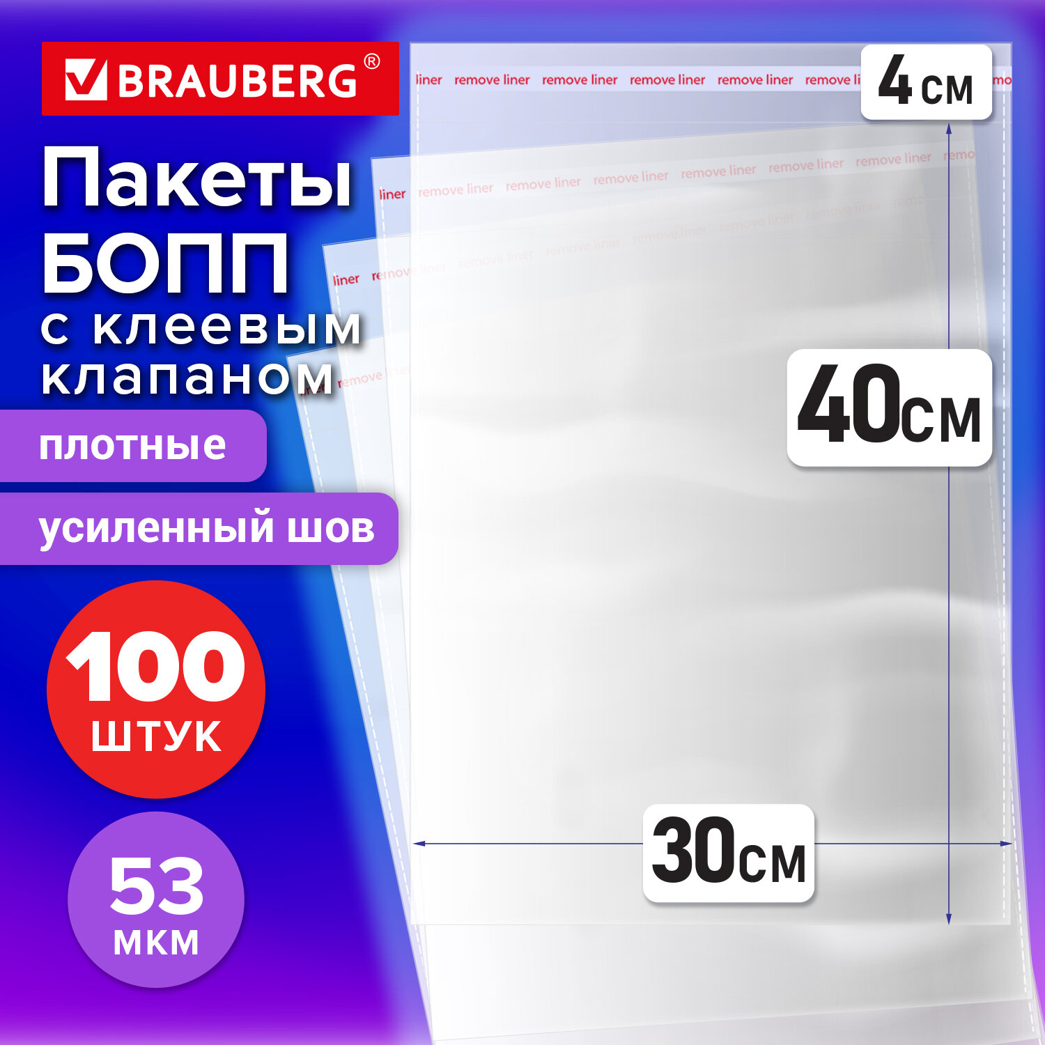Пакеты БОПП с клеевым клапаном, КОМПЛЕКТ 100 штук, 30х40 + 4 см, 53 мкм, с усиленным швом, BRAUBERG Код товара: 700418 658,03 ₽ Купить Производитель:BRAUBERG Пакеты БОПП BRAUBERG – это идеальное решение для упаковки. Они обеспечивают надежную защиту содержимого, сохраняя свежесть и привлекательный внешний вид. БОПП-упаковка BRAUBERG выполнена из прочного, прозрачного и влагостойкого полипропилена, который подчеркивает эстетику продукта и делает его более привлекательным. Материал надежно защищает содержимое от влаги и пыли, а удобный клеевой клапан обеспечивает быстрое запечатывание. Усиленный шов предотвращает разрывы и повышает долговечность упаковки. Размер: 30х40 см. Клеевой клапан: 30х4 см. Толщина: 53 мкм. Количество: 100 штук.Производство: КитайТип товара: пакеты БОППРазмер: 30х40 смТолщина: 53 мкмКоличество в комплекте: 100 шт.Материал: БОППОсобенности: клеевой крайТип упаковки: пакетВес: 1,26 кгРазмер упаковки: 1.7 × 45 × 32.2 смОбъём: 0.0018 м3Промежуточная упаковка: 20 штТранспортная упаковка: 20 штШтрих-код: 4606224481258 Сертификат-1.jpg Сертификат-2.jpg