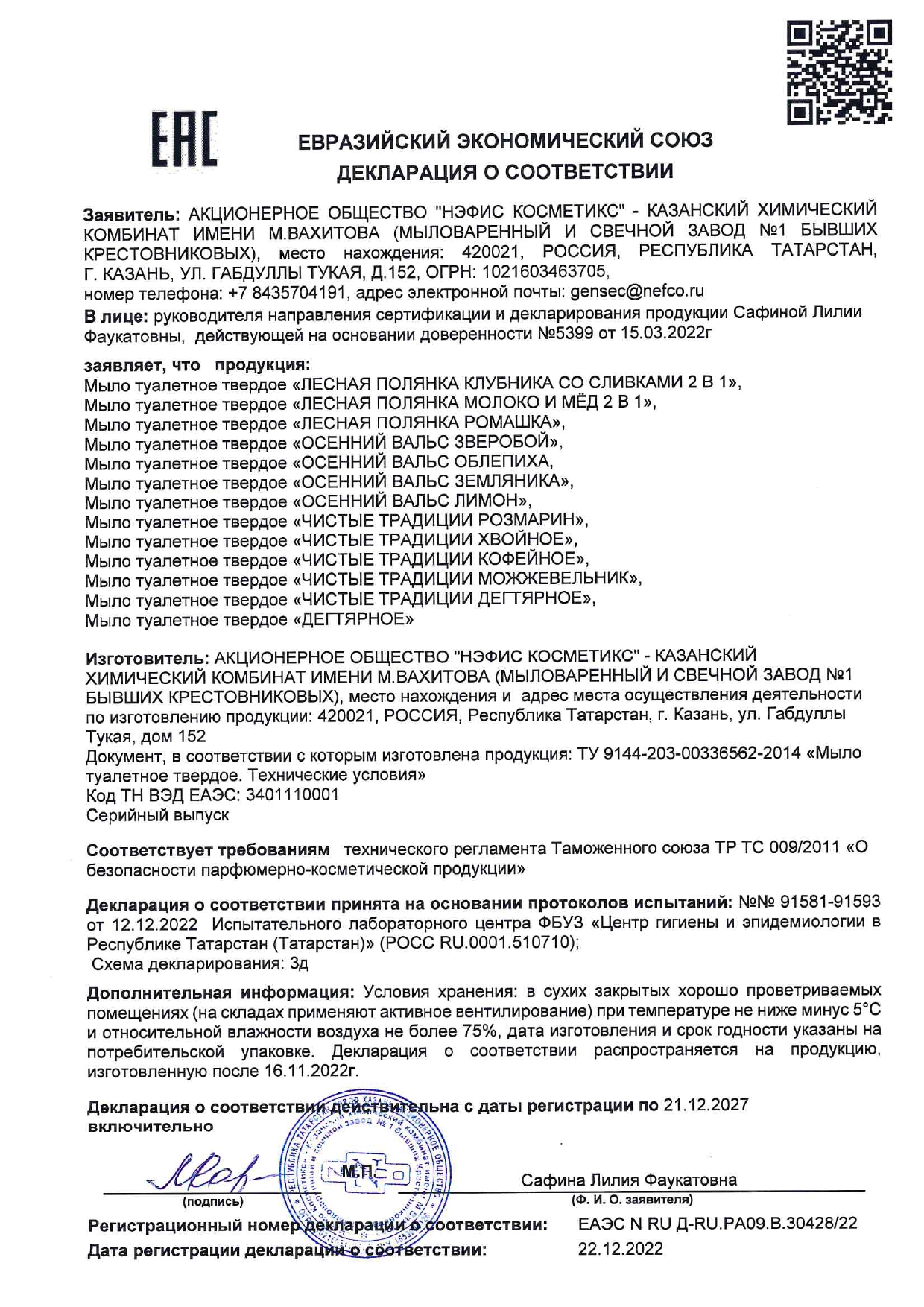 Мыло туалетное 140 г, ЧИСТЫЕ ТРАДИЦИИ "Дегтярное" Код товара: 609028 46,71 ₽ Купить Производитель:ЧИСТЫЕ ТРАДИЦИИ Дегтярное мыло ЧИСТЫЕ ТРАДИЦИИ – это натуральное средство для бережного ухода за кожей. В дегтярном мыле использован мягкий, очищенный от примесей берестовый деготь, рекомендованный для косметологии и фарминдустрии. Берестовый деготь изготавливают из верхней светлой коры растущих молодых березовых деревьев, что снижает содержание примесей. Глицерин в составе мыла предотвращает сухость кожи без ущерба лечебно-профилактическому действию антибактериальных компонентов продукта. Состав: Sodium Tallowate, Sodium Palm Kernelate, Water, Glycerin, Betula Tar, Sodium Сhloride, Sodium Acrylates Copolymer, Sodium Benzoate, Sodium Citrate, Disodium EDTA, Diethylenetriamine penta (methylene phosphonic acid) Heptasodium Salt.Производство: РоссияТип: дегтярноеВес: 140 гОтдушка: НетКоличество в упаковке: 1 шт.Марка: ОрдинарноеСерия: СТАНДАРТВид упаковки: полиэтиленСрок годности: 24 месРазмер упаковки: 2.5 × 9 × 5 смОбъём: 0.0002 м3Промежуточная упаковка: 84 штТранспортная упаковка: 84 штШтрих-код: 4604049097876 Сертификат-1.jpg Сертификат-2.jpg Сертификат-3.jpg