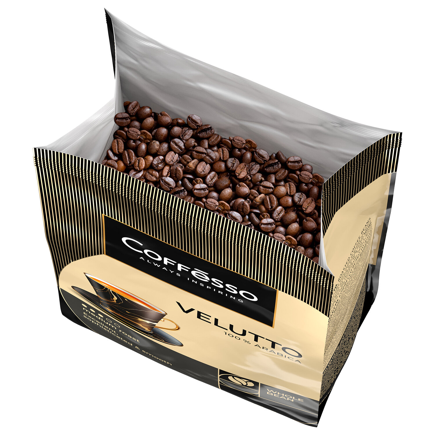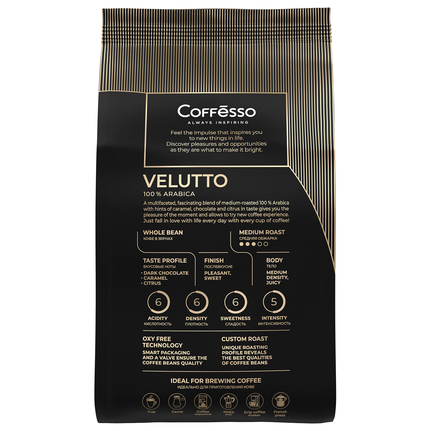 Кофе в зернах COFFESSO "VELUTTO", арабика 100%, 1 кг Код товара: 624564 2 788,43 ₽ Купить Производитель:COFFESSO Кофе COFFESSO "VELUTTO" – изысканный купаж 100% арабики со сбалансированным вкусом и насыщенным ароматом. Оттенки тёмного шоколада, карамели и цитруса придают напитку утончённость, а средняя обжарка раскрывает его природную мягкость. Кофе в зёрнах COFFESSO "VELUTTO" (1 кг) изготовлен из 100% арабики премиум-класса. Средняя степень обжарки обеспечивает гармоничный вкус с нотами тёмного шоколада, карамели и лёгкой цитрусовой свежестью. Подходит для приготовления в турке, кофемашине, френч-прессе, гейзерной и капельной кофеварках. Упакован в герметичный пакет с сохранением аромата в азотной среде.Производство: РоссияМасса нетто: 1000 гСтепень обжарки: средняяСорт зерна: 100% арабикаТип кофе: зерновойСрок годности: 18 мес.Вкус: VELUTTOФирма-производитель: ООО МАЙУпаковка: пакетСрок годности: 18 месВес: 1,1 кгРазмер упаковки: 9 × 25.4 × 16.5 смОбъём: 0.0053 м3Промежуточная упаковка: 4 штТранспортная упаковка: 4 штШтрих-код: 4660115909153 Сертификат-1.jpg Сертификат-2.jpg Сертификат-3.jpg