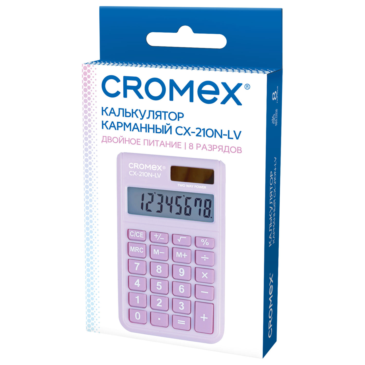 Калькулятор карманный CROMEX (КРОМЕКС) CX-210N-LV (96х62 мм), 8 разрядов, двойное питание, сиреневый Код товара: 273836 208 ₽ Купить Производитель:CROMEX Карманный калькулятор CROMEX CX-210N-LV – простой и надежный помощник в ежедневных расчетах в работе, учебе и дома. Пастельный сиреневый (лавандовый) цвет корпуса принесет удовольствие при работе с расчетами. Калькулятор выполняет все базовые арифметические действия, операции с памятью и процентами, извлечение квадратного корня. Контрастный дисплей, резиновые кнопки для комфортной работы. Встроенный аккумулятор рассчитан на многолетнюю работу и оснащён функцией автоматического отключения (через 8–10 минут бездействия) и кнопкой "OFF" – это снижает расход энергии и увеличивает срок службы без замены батареи. Размер – 96х62 мм. Гарантия – 12 месяцев. Инструкция на русском языке. Выполнен в пастельном сиреневом (лавандовом) цвете.Производство: КитайРазрядность дисплея: 8Серия: CX-210NТип питания: 1 батарейка LR54 (LR1130/AG10)Конструктивные особенности: нетЦвет панели: сиреневыйИсполнение: карманныйМатериал клавиш: резинаДлина корпуса: 96 ммШирина корпуса: 62 ммТолщина корпуса: 8 ммВес: 37 гФункционал: вычисление с памятью, извлечение квадратного корня, расчет процентов, сложение, вычитание, деление, умножениеУпаковка: картонная коробка с европодвесомРазмер упаковки: 1.6 × 7.2 × 10.5 смОбъём: 0.0001 м3Промежуточная упаковка: 100 штТранспортная упаковка: 600 штШтрих-код: 4606224498416
