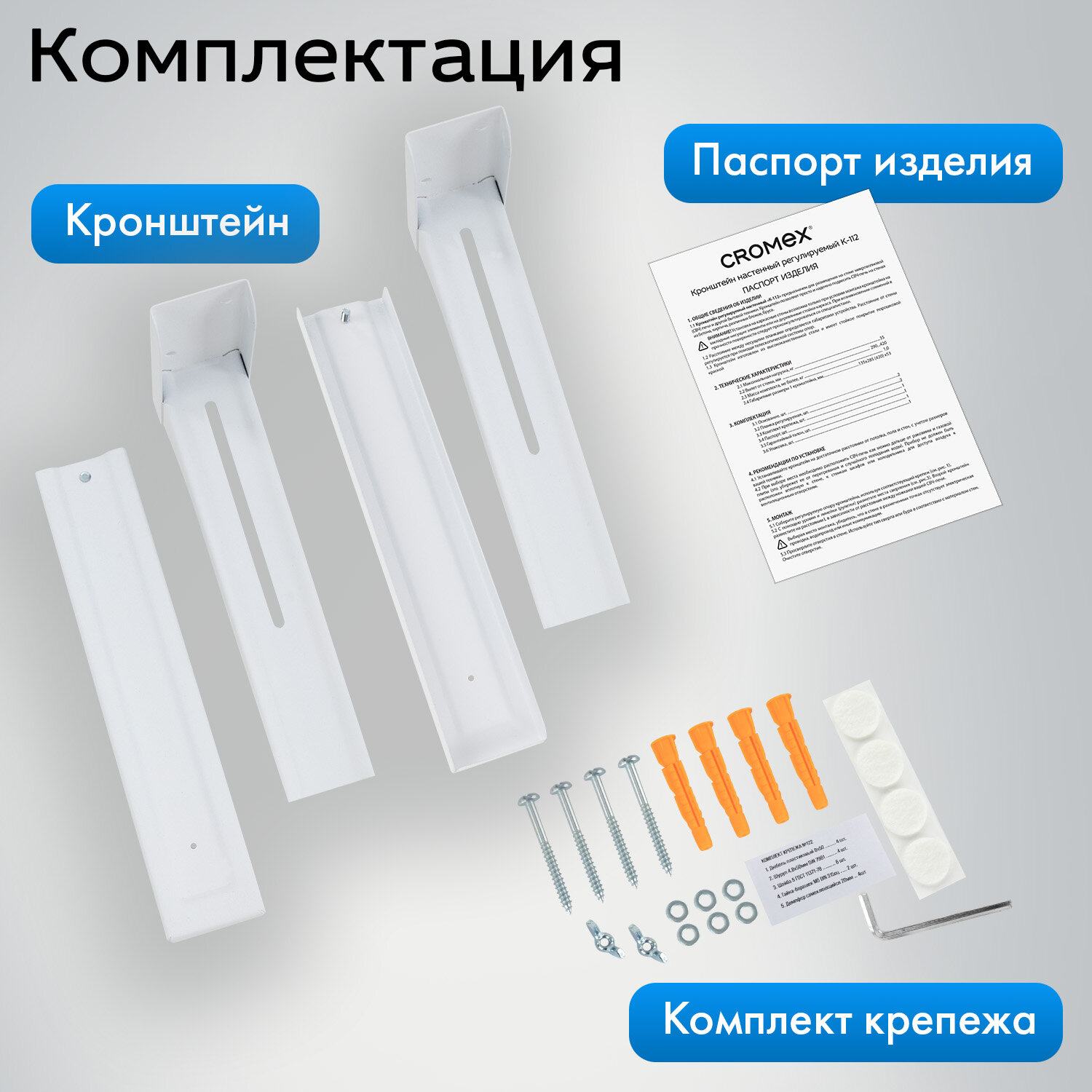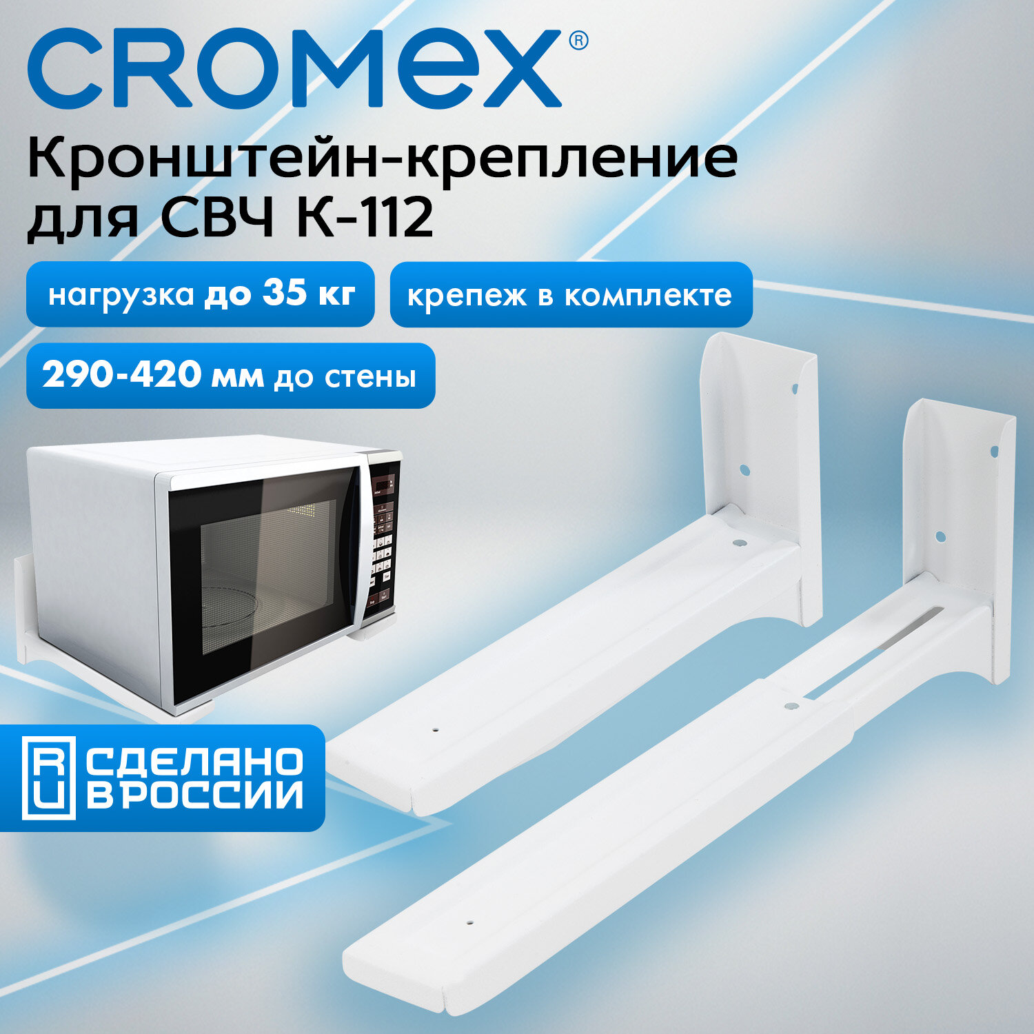 Кронштейн-крепление для СВЧ, нагрузка до 35 кг, CROMEX (КРОМЕКС) K-112, регулировка до 42 см, белый Код товара: 457879 673,72 ₽ Купить Производитель:CROMEX Настенный кронштейн CROMEX K-112 – удобный способ организации пространства, который порадует надежностью, универсальностью и простотой использования. Настенный кронштейн CROMEX K-112 выдерживает нагрузку до 35 кг. Благодаря раздвижной конструкции опорной части длина кронштейна регулируется в диапазоне от 29 до 42 см. Микроволновые печи, принтеры, сканеры – кронштейн можно использовать для установки различных бытовых приборов и офисной техники. Кронштейн выполнен из стали, что обеспечит прочность и надежность изделия, а универсальный белый цвет впишется в любой интерьер. Набор крепежа и инструкция по монтажу входят в комплект, поэтому установка кронштейна не составит труда.Производство: РоссияНазначение: настенныйМаксимальная нагрузка: 35 кгРегулировка расстояния до стены: даМинимальное расстояние от стены: 29 смМаксимальное расстояние от стены: 42 смСерия: K-11Материал : стальЦвет: белыйВысота: 13.5 смШирина: 5.3 смГлубина: 28.5 смВес: 1 кгРазмер упаковки: 5.6 × 29.9 × 15.6 смОбъём: 0.0028 м3Промежуточная упаковка: 10 штТранспортная упаковка: 10 штШтрих-код: 4606224500386 Файлы Приложение-1.pdf Сертификат-1.jpg Сертификат-2.jpg Сертификат-3.jpg Сертификат-4.jpg Сертификат-5.jpg Сертификат-6.jpg Сертификат-7.jpg Сертификат-8.jpg Сертификат-9.jpg Сертификат-10.jpg Сертификат-11.jpg Сертификат-12.jpg Сертификат-13.jpg Сертификат-14.jpg Сертификат-15.jpg Сертификат-16.jpg Сертификат-17.jpg Сертификат-18.jpg Сертификат-19.jpg Сертификат-20.jpg Сертификат-21.jpg Сертификат-22.jpg Сертификат-23.jpg Сертификат-24.jpg Сертификат-25.jpg Сертификат-26.jpg