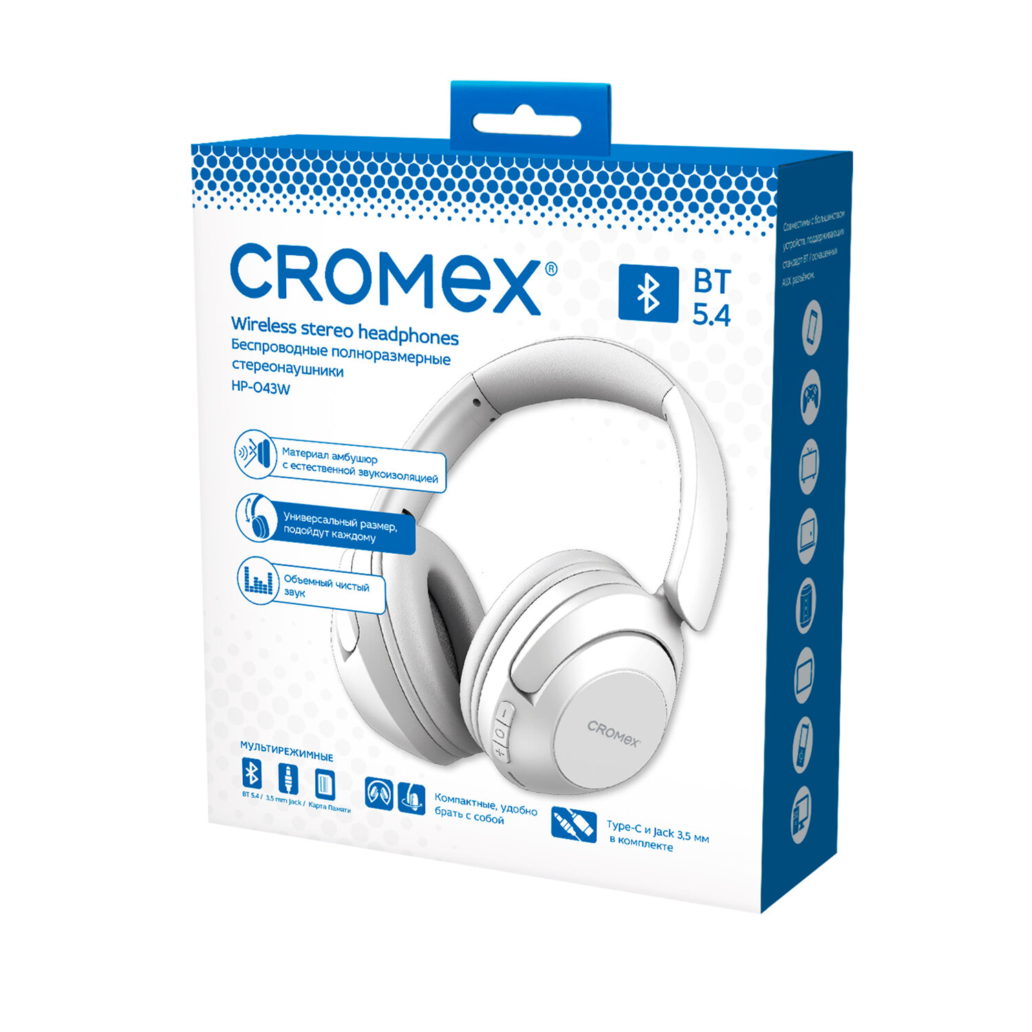 Наушники беспроводные полноразмерные складные раздвижные, CROMEX (КРОМЕКС) HP-043W, Bluetooth 5.4, белые Код товара: 514120 795,15 ₽ Купить Производитель:CROMEX Беспроводные наушники с микрофоном CROMEX HP-043W – незаменимый аксессуар для прослушивания музыки, аудиокниг, лекций и подкастов, а также для телефонных разговоров на прогулке, во время занятия спортом, на отдыхе, за рулем. Беспроводные наушники CROMEX изготовлены из прочного и легкого ABS-пластика. Наушники имеют регулируемое по длине оголовье, что позволяет отрегулировать оголовье под необходимый размер и делает наушники универсальными для каждого покупателя. Беспроводные наушники имеют складную конструкцию, что делает их невероятно компактными и удобными, например, во время путешествия. Амбушюры наушников изготовлены из экокожи. Мягкие амбушюры обеспечивают комфортное и в то же время достаточно плотное прилегание к ушам, что обеспечивает комфорт при прослушивании музыки. На одной из чаш динамика расположены кнопки управления. Вы сможете быстро переключить трек, добавить или убавить громкость, а также оперативно ответить на звонок. Наушники работают при помощи беспроводного соединения Bluetooth 5.4 и оснащены разъемом mini jack 3,5 мм (аудио-кабель jack 3,5 мм входит в комплект). Это дает возможность использовать наушники как с проводным, так и с беспроводным подключением, что обеспечивает максимальное удобство в использовании. Наушники оснащены слотом для карты памяти (приобретается отдельно). В этом случае для воспроизведения аудиофайлов не требуется подключение к смартфону. Высокое качество звука наушников CROMEX обеспечивается использованием при производстве современных технологий, которые позволяют создавать электронику с качественным звучанием. Диапазон воспроизводимых частот от 20 Гц до 20000 Гц гарантирует широкий спектр и глубину звучания. Сопротивление наушников составляет 32 Ом, а чувствительность – 105 дБ, что позволяет им работать с различными источниками звука и обеспечивать одинаково высокое качество звучания независимо от выбранного источника. Более того, наличие микрофона позволяет использовать их для звонков, в качестве гарнитуры. Ещё одним преимуществом наушников CROMEX является продолжительное время работы без подзарядки благодаря мощному аккумулятору на 200 мАч. Наушники будут радовать вас до 8 часов* в зависимости от режима и интенсивности использования. Упакованы в прочный цветной картонный короб привлекательного дизайна, поэтому беспроводные наушники CROMEX подойдут в качестве подарка друзьям, близким, детям. Комплектация: - кабель USB-A - Type-C; - аудио-кабель Jack 3,5 мм; - инструкция; - гарантийный талон. Производитель сохраняет за собой право на внесение изменений в технические характеристики, комплектацию и конструкцию данной модели для улучшения эксплуатационных свойств без предварительного уведомления. * Время работы устройства может меняться в зависимости от режима прослушивания, уровня громкости и условий окружающей среды.Производство: КитайКатегория товара: гарнитураРазъем: USB Type-C, AUX 3,5 ммЗвук: стереоТип наушников: беспроводныеТип крепления: оголовьеМатериал амбушюров: экокожаКоличество каналов: 2 шт.Шумоподавление: даРадиус действия: 10 мМинимальная воспроизводимая частота: 20 ГцМаксимальная воспроизводимая частота: 20000 ГцЧувствительность: 105 дБСопротивление (импеданс): 32
