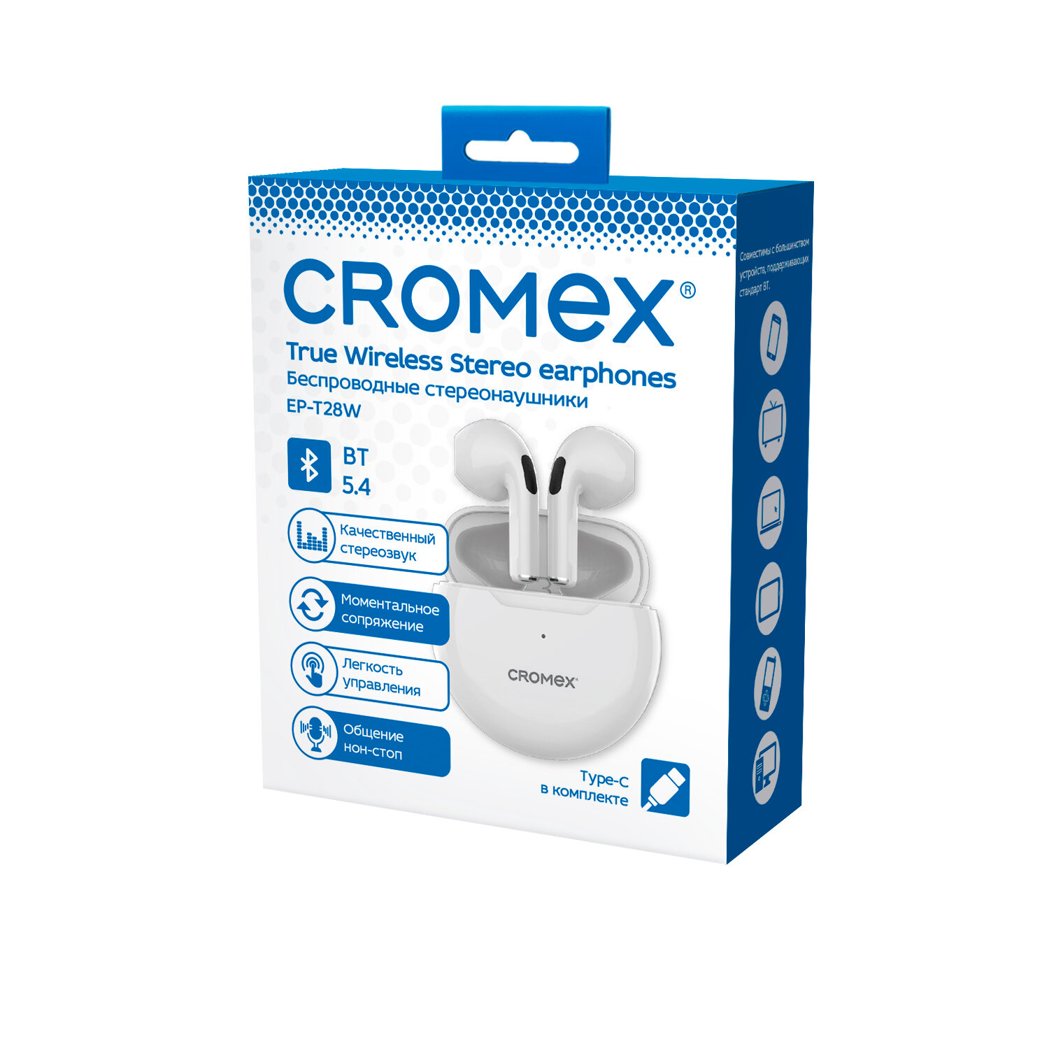 Наушники беспроводные TWS вкладыши с микрофоном CROMEX (КРОМЕКС) EP-T28W, Bluetooth 5.4, белые Код товара: 514121 436,14 ₽ Купить Производитель:CROMEX Беспроводные наушники с микрофоном CROMEX EP-T28W – незаменимый аксессуар для прослушивания музыки, аудиокниг, лекций и подкастов, а также для телефонных разговоров на прогулке, во время занятия спортом, на отдыхе, за рулем. Наушники CROMEX EP-T28W – это качественный и стильный аксессуар для повседневной жизни и отдыха. Созданы с учетом анатомии ушных раковин, что делает их максимально комфортными в использовании. Закрытое акустическое оформление позволяет наслаждаться прослушиванием, не отвлекаясь на посторонние звуки. Модуль Bluetooth версии 5.4 гарантирует бесперебойную и качественную связь с любым источником сигнала, поддерживающим подключение по Bluetooth. Встроенный микрофон позволяет оставаться на связи в любой ситуации. Многофункциональный сенсорный датчик делает управление максимально простым и комфортным. Данная модель поддерживает оптимальный для восприятия частотный диапазон 20-20000 Гц. Также обладает высокой чувствительностью 105 дБ и сопротивлением 32 Ом, которые обеспечивают качественный и насыщенный стереозвук даже при подключении к слабому источнику сигнала. Наушники имеют современный дизайн со стильным внешним видом, создавая идеальный аксессуар для тех, кто ценит и технологичность, и эстетику. Наушники оснащены датчиком Холла, позволяющим осуществлять мгновенное сопряжение при открытии кейса: наушники автоматически найдут и подключатся к вашему устройству. Объем аккумуляторов наушников по 30 мАч каждый обеспечивает работу в активном режиме прослушивания без дополнительной подзарядки до 3 часов*. Объем аккумулятора зарядного кейса 150 мАч продлевает работу наушников. Упакованы в элегантный цветной картонный короб с пластиковым европодвесом. Упаковка усилена термоусадочной пленкой для дополнительной защиты. Все это делает наушники SONNEN отличным подарком для друзей и близких. В комплект также входит кабель USB-A - Type-C для зарядки кейса, руководство пользователя и гарантийный талон. Производитель сохраняет за собой право на внесение изменений в технические характеристики, комплектацию и конструкцию данной модели для улучшения эксплуатационных свойств без предварительного уведомления. * Время работы устройства может меняться в зависимости от режима прослушивания, уровня громкости и условий окружающей среды.Производство: КитайКатегория товара: гарнитураРазъем: USB Type-CЗвук: стереоТип наушников: беспроводныеТип крепления: -Материал амбушюров: -Количество каналов: 2 шт.Шумоподавление: даРадиус действия: 10 мМинимальная воспроизводимая частота: 20 ГцМаксимальная воспроизводимая частота: 20000 ГцЧувствительность: 105 дБСопротивление (импеданс): 32 ОмМикрофон: даРегулятор громкости: даКнопка ответа вызова: даТип подключения: Bluetooth 5.4Крепление микрофона: встроенныйОсобенности: моментальное сопряжениеКомплектация: зарядный кейс, провод USB-A - Type-C, инструкция, гарантийный талонЕмкость аккумулятора: 150 мАчРазмер: 21х50х50 ммЦвет: белыйВес: 24 гСерия: EP-T28WРазмер упаковки: 3.7 × 12.1 × 9.4 смОбъём: 0.0006 м3Промежуточная упаковка: 50 штТранспортная упаковка: 100 штШтрих-код: 4606224477671