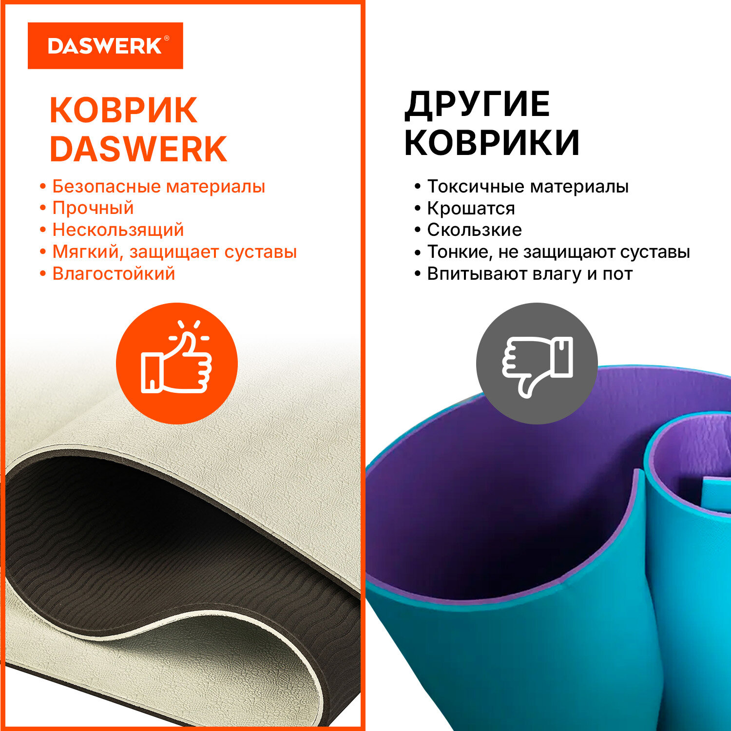 Коврик для йоги и фитнеса спортивный двухцветный, ТПЭ, 183x61x0,6 см, бежевый/чёрный, DASWERK (ДАСВЕРК) Код товара: 680030 1 046,8 ₽ Купить Производитель:DASWERK Коврик для йоги и фитнеса DASWERK – универсальный и незаменимый спортивный инвентарь для йоги и фитнеса дома, на улице или в зале. В комплекте фиксирующие резинки, чехол для хранения и переноски в подарок! Коврик для йоги и фитнеса DASWERK изготовлен из высококачественного экологически безопасного термопластичного эластомера TPE. Материал TPE плотный, упругий и износостойкий, сохраняет свою форму. Коврик двусторонний, имеет 2 рабочие стороны, 2 разных узора для разных типов упражнений. Выберите наиболее удобный для себя или чередуйте использование. Коврик имеет оптимальный размер 183х61 см, что обеспечит максимально комфортные тренировки как для взрослых, так и для детей. Толщина коврика 6 мм обеспечивает защиту суставов и коленей. Коврик DASWERK нескользящий, обеспечивает превосходное сцепление с любой поверхностью при выполнении упражнений. Коврик DASWERK в меру мягкий и приятный на ощупь, обеспечивает комфортные ощущения во время занятий йогой и фитнесом. Хорошо сохраняет свою форму и в жарких условиях, и в холоде. Коврик не впитывает пот и влагу, легко моется. Вес коврика – 840 г. В комплект входят фиксирующие резинки, благодаря которым легко можно брать коврик с собой в тренажерный зал, студию или путешествие или использовать чехол для хранения и переноски, который идет в подарок! Коврик для йоги – это личное пространство для медитации и расслабляющих упражнений или же, напротив, интенсивной тренировки. Выберите подходящий цвет из представленных ковриков DASWERK, чтобы тренировки приносили больше удовольствия и радовали. У товара может присутствовать лёгкий специфический запах, который выветрится через несколько дней. Можно протереть коврик водой для более быстрого выветривания запаха. Комплектация: Коврик для фитнеса – 1 шт. Фиксирующие резинки – 1 шт. Чехол для коврика – 1 шт.Производство: КитайТип товара: коврик спортивныйНазначение: для йоги и фитнесаОсобенности: нескользящийРазмер коврика: 183х61 смТолщина коврика: 0.6 смФиксирующие резинки: даЧехол: даЦвет: черный/бежевыйСерия: DER SPORTМатериал: термопластичный эластомер (ТПЭ)Упаковка: пакетВес: 840 гРазмер упаковки: 12 × 62.5 × 12.2 смОбъём: 0.0103 м3Промежуточная упаковка: 12 штТранспортная упаковка: 12 штШтрих-код: 4606224401263 Файлы Сертификат-1.jpg Сертификат-2.jpg Сертификат-3.jpg Сертификат-4.jpg