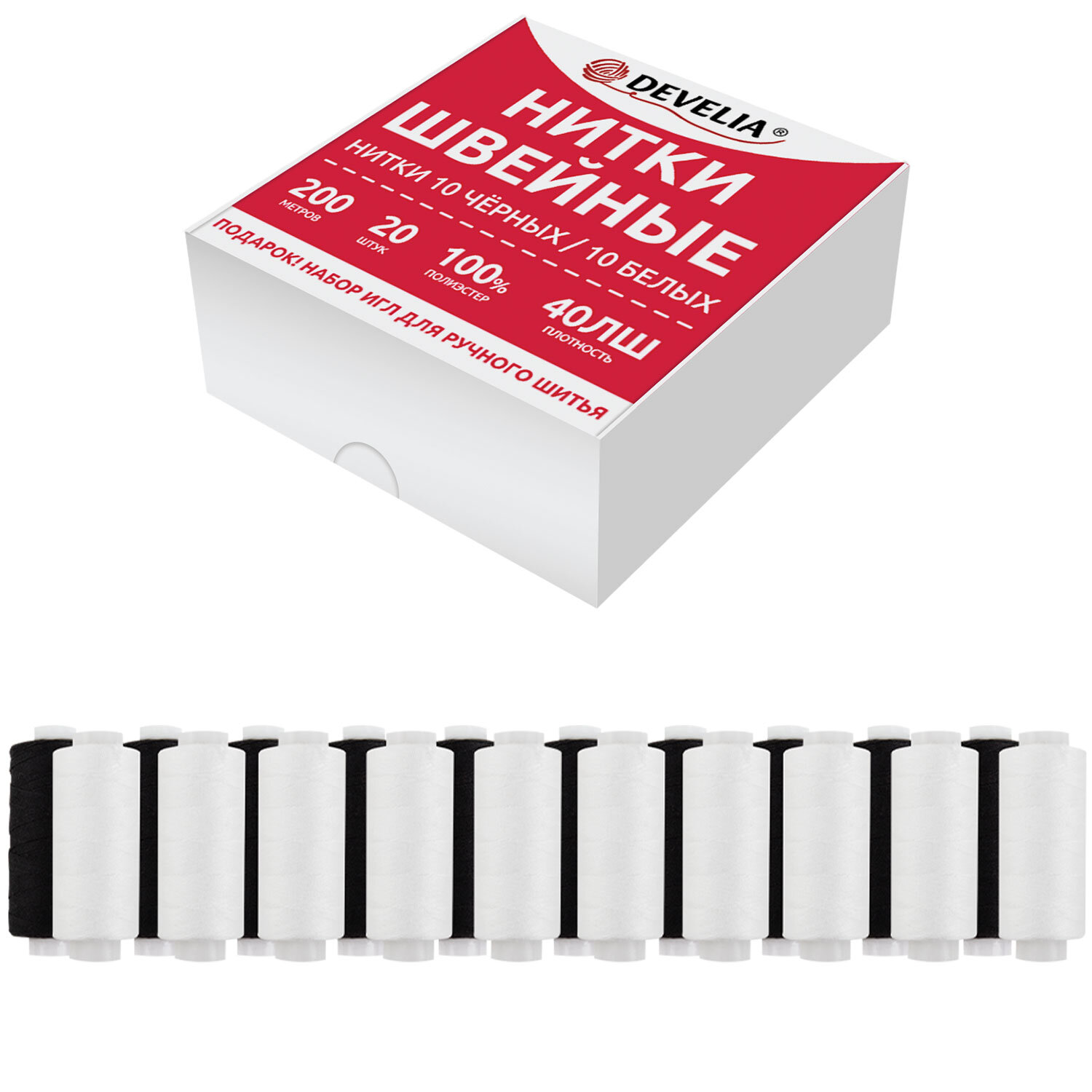 В набор входит 20 катушек 40 ЛШ двух цветов (белый, черный) в намотке 200 м и набор игл для ручного шитья (15 штук). Поставляются в картонной коробке.