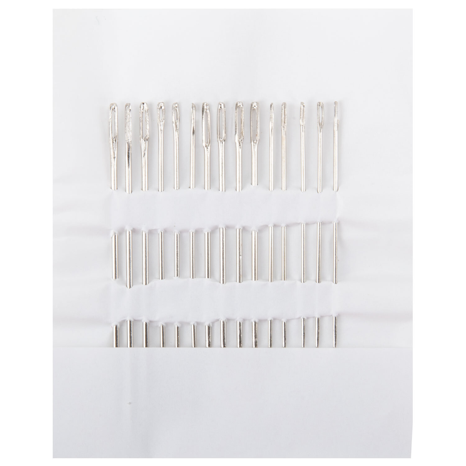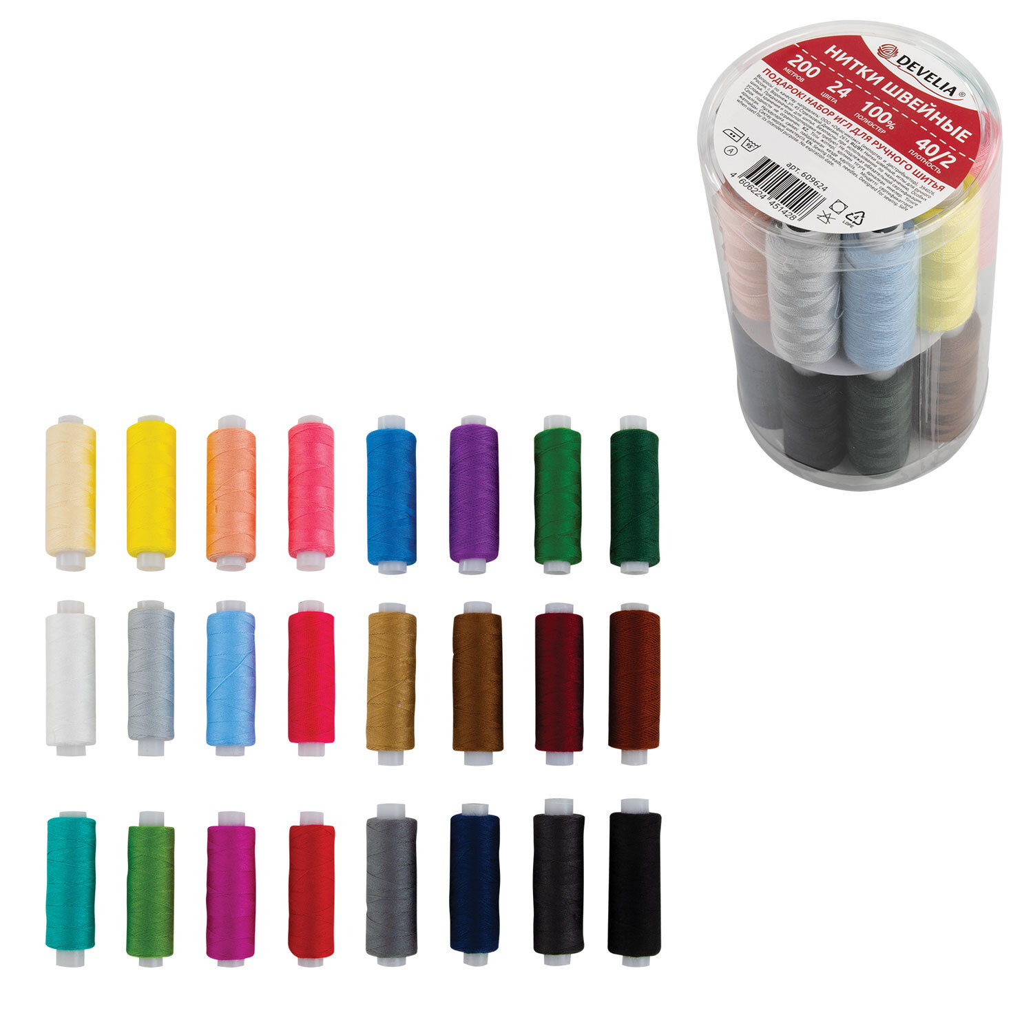 В набор входит 24 катушки 40/2 различных цветов (пастельные, яркие, темные) в намотке 200 м и набор игл для ручного шитья (15 штук). Поставляются в пластиковой прозрачной тубе с крышкой.