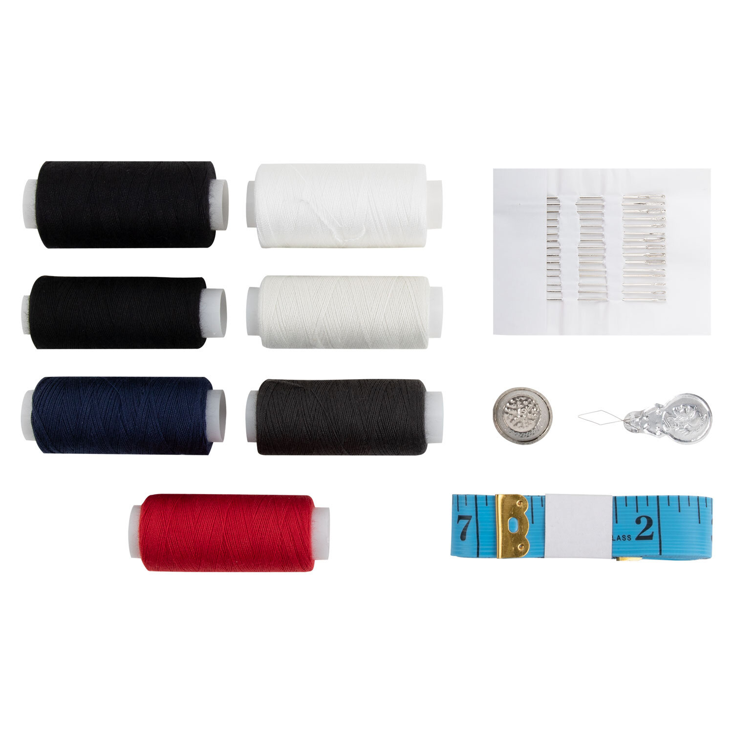 В набор входит 7 катушек армированных ниток в намотке 200 м стандартных цветов (толщина нити 100 ЛЛ - 2 штуки; 35 ЛЛ - 5 штук), иглы для ручного шитья разных размеров - 15 штук, сантиметр, наперсток, нитевдеватель. Поставляются в пластиковом прозрачном боксе с удобной завинчивающейся крышкой. Материал состоит из прочной армированной нити.