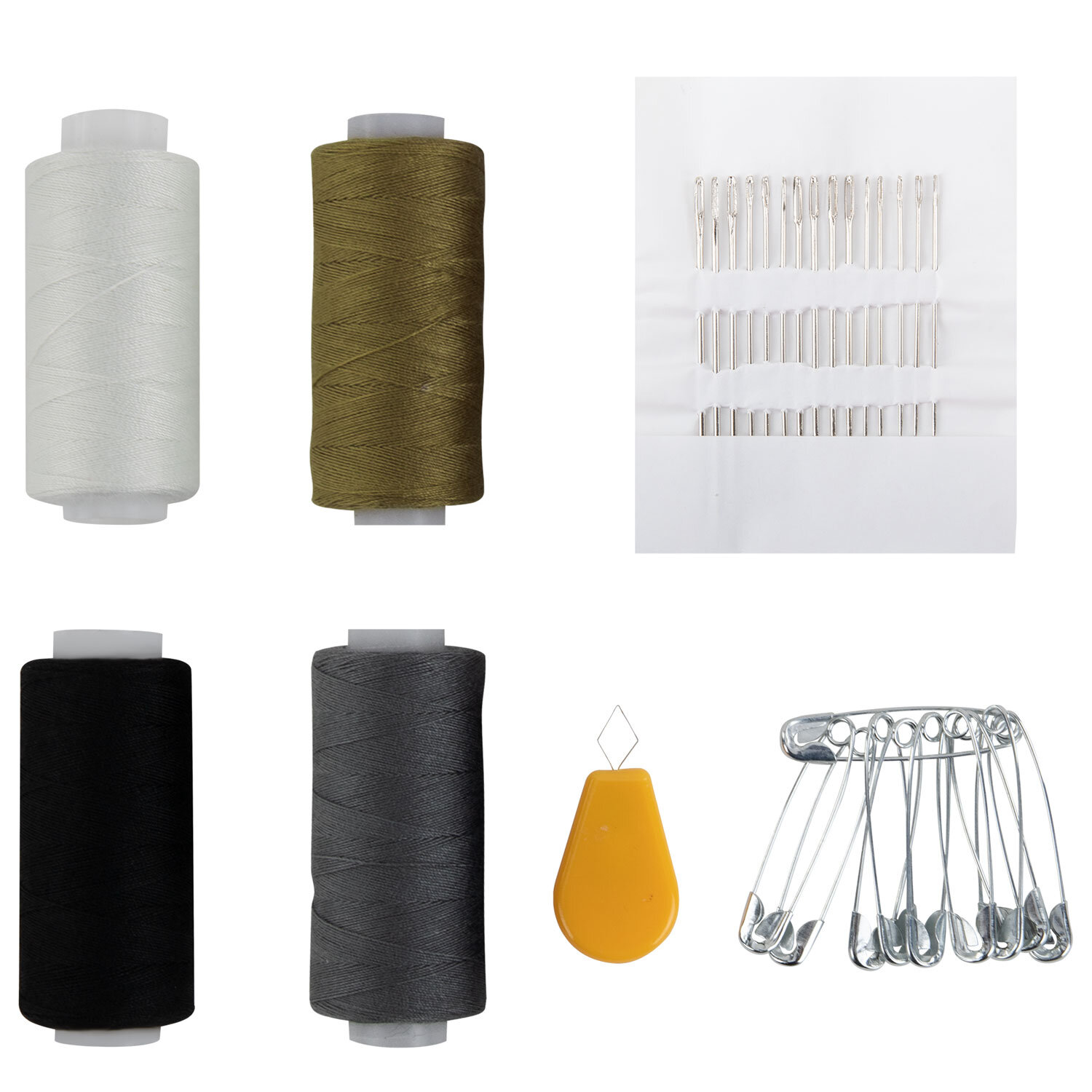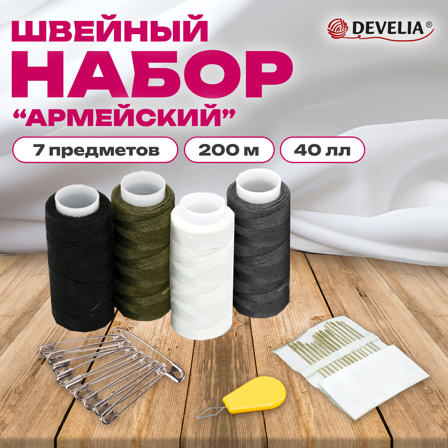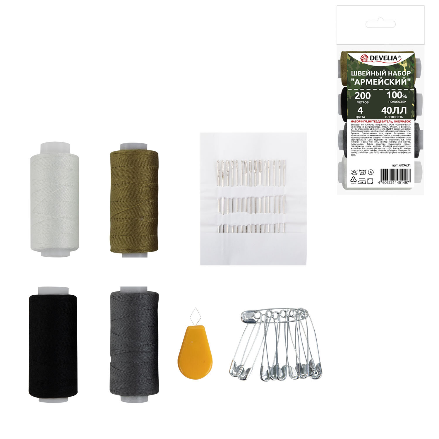 В набор "Армейский" входит 4 катушки ниток 40 ЛЛ в намотке 200 м стандартных цветов (черный, белый, серый, зеленый), иглы для ручного шитья разных размеров – 15 штук, нитковдеватель, 10 булавок. Поставляются в полипропиленовом пакете.