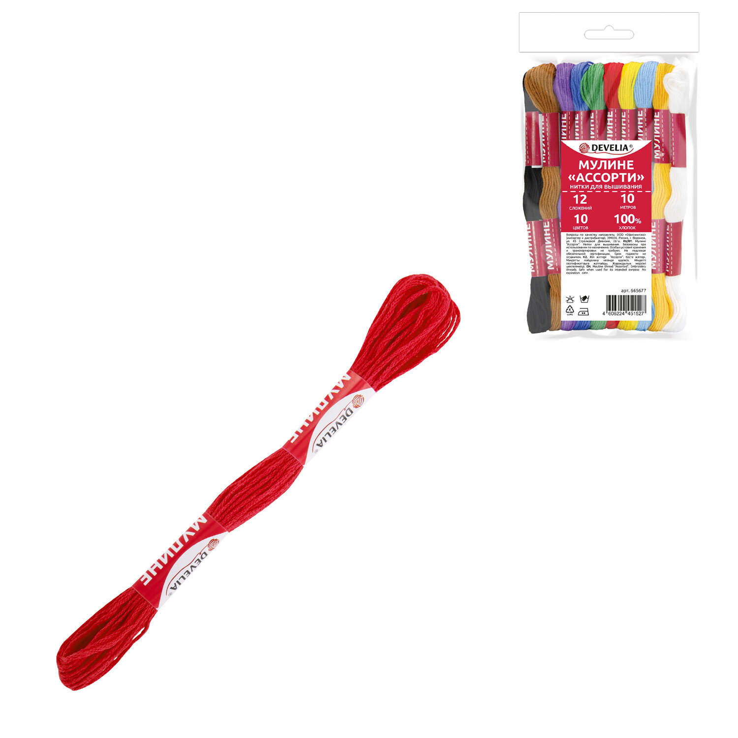 Нитки для вышивания (мулине), набор 10 цветов, 10 м, хлопок, DEVELIA (Девелиа) Код товара: 665677 109,44 ₽ Купить Производитель:DEVELIA Нитки мулине DEVELIA произведены из 100% хлопка высокого качества, предназначены для разных техник вышивания и плетения. Стойкие цвета не теряют насыщенности и блеска, долго сохраняя свою декоративность. Набор ниток мулине DEVELIA состоит из 10 мотков ниток стандартных цветов в 12 сложений в намотке по 10 метров. Поставляются в пластиковом прозрачном боксе с удобной крышкой. Хлопковые мулине – самый распространенный и популярный вид ниток для вышивания. Является самым устойчивым к воздействию химических веществ и времени. У ниток мулине DEVELIA стойкая окраска, они не линяют даже при стирке в очень горячей воде. Они шелковистые и прочные. Картины, вышитые этими нитками, можно смело стирать, не опасаясь, что нитки полиняют. Вышивать нитками DEVELIA комфортно, они ровно ложатся, не путаются и блестят. В работах с большим количеством цветов нитки мулине обеспечивают оптимальную передачу цвета. Нитки легко проходят сквозь ткань, не пушатся и не теряют блеска. Особенностью является отсутствие скрутки между нитями, что позволяет легко разделять их на любую толщину. Помимо вышивки крестиком и гладью, мулине может быть использовано в поделках и плетении. Метод завязывания узелков в определенной последовательности позволяет создать яркие красочные браслеты. С помощью набора ниток мулине DEVELIA рукодельницы смогут создать уникальные изделия и предметы интерьера, картины, панно вышитые или сплетенные, а также с помощью вышитых узоров и рисунков придать вещам неповторимость. Цвета ниток в наборе могут незначительно отличаться от представленных на фото.Производство: КитайТип ниток: мулинеСерия: ВышивальныеКоличество цветов: 10Количество в комплекте: 10 шт.Длина намотки: 10 мМатериал ниток: 100% хлопокЦвет: ассортиВес: 31 грРазмер упаковки: 1.2 × 15.5 × 10.3 смОбъём: 0.0002 м3Промежуточная упаковка: 100 штТранспортная упаковка: 100 штШтрих-код: 4606224451527 Файлы Сертификат-1.jpg Сертификат-2.jpg Сертификат-3.jpg Сертификат-4.jpg Сертификат-5.jpg Сертификат-6.jpg Сертификат-7.jpg Сертификат-8.jpg Сертификат-9.jpg Сертификат-10.jpg Сертификат-11.jpg Сертификат-12.jpg Сертификат-13.jpg Сертификат-14.jpg Сертификат-15.jpg Сертификат-16.jpg Сертификат-17.jpg Сертификат-18.jpg Сертификат-19.jpg Сертификат-20.jpg Сертификат-21.jpg Сертификат-22.jpg Сертификат-23.jpg Сертификат-24.jpg Сертификат-25.jpg Сертификат-26.jpg