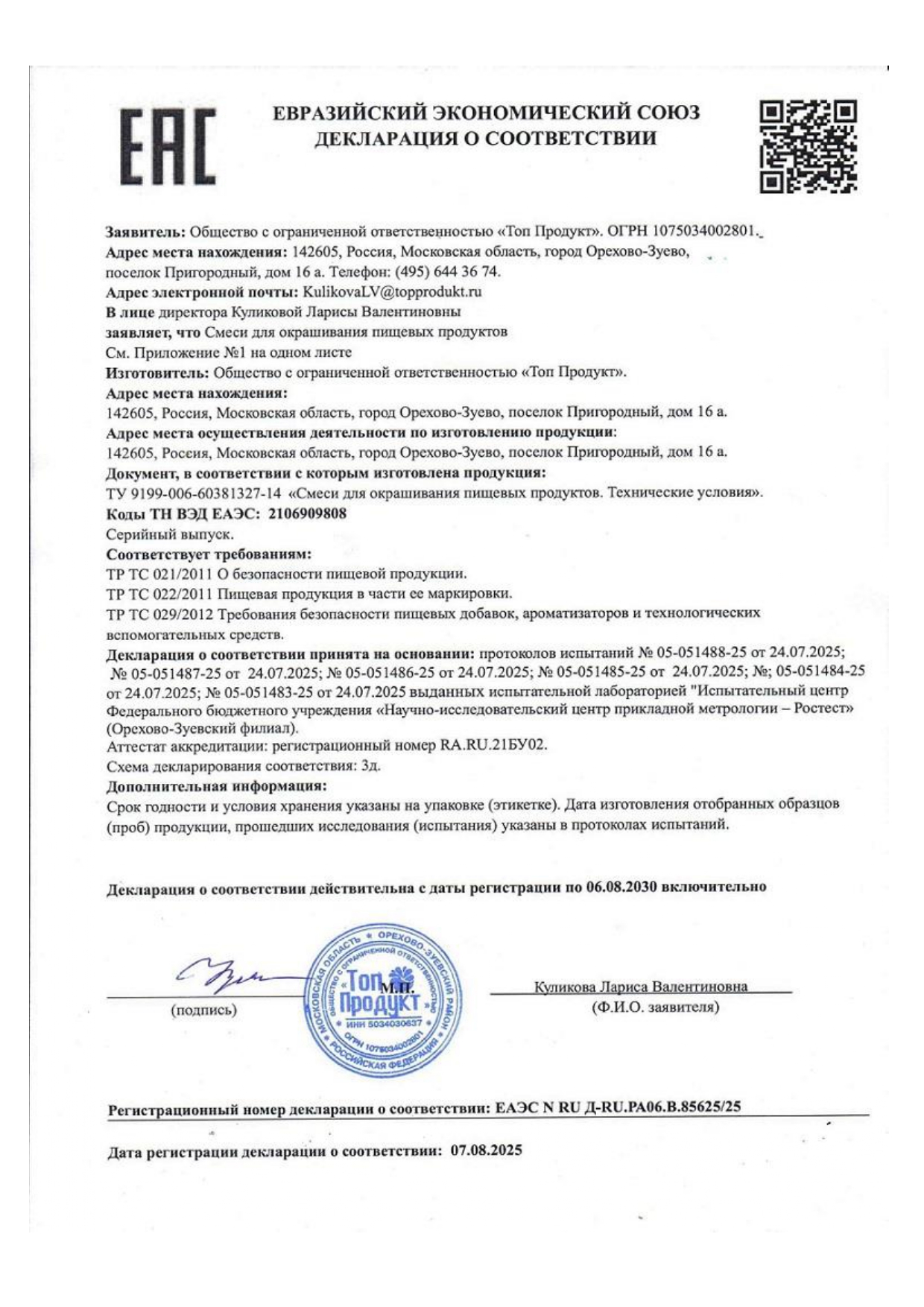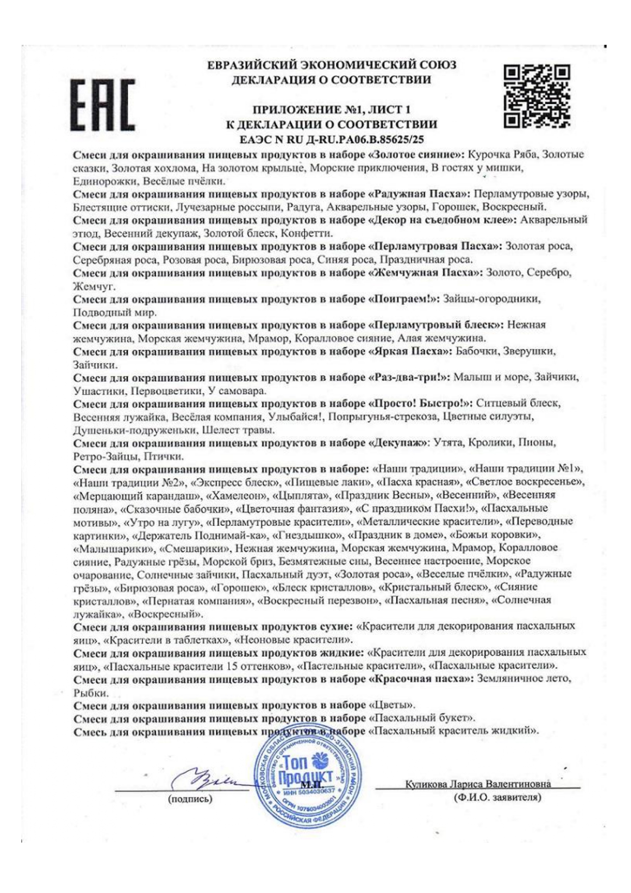 Красители пасхальные для окрашивание яиц, СУХИЕ, яркие ассорти цвета, 56720, 81312 Код товара: 592669 49,25 ₽ Купить Производитель:ДОМАШНЯЯ КУХНЯ Яркие моменты праздника с пищевыми красителями для яиц! Дайте волю своему творчеству и добавьте ярких красок! Красители пасхальные пищевые для окрашивания яиц сухие, упакованы в пакет. Поставляются в 2 видах ассорти цветов без возможности выбора, 4 цвета по 4 г: 1. Смеси для окрашивания пищевых продуктов сухие в цветах: розовый, зелёный, синий, жёлтый; 2. Смеси для окрашивания пищевых продуктов сухие в цветах: красный, фиолетовый, бирюзовый, оранжевый. Упакованы в равном количестве в транспортной упаковке. Яркие и насыщенные цвета, разнообразие оттенков, легкость в использовании! Идеально для всей семьи: окрашивание яиц – это увлекательное занятие, которое объединяет близких. Создавайте незабываемые моменты вместе, превращая процесс в веселое и креативное времяпрепровождение.Производство: РоссияТип товара: красители для яицВид: сухиеВес: 16 гЦвет: ассортиКоличество в комплекте: 1 шт.Упаковка: пакетСрок годности: 60 месРазмер упаковки: 0.8 × 15.9 × 9.9 смОбъём: 0.0001 м3Промежуточная упаковка: 22 штТранспортная упаковка: 22 штШтрих-код: 4606134043874 Сертификат-1.jpg Сертификат-2.jpg