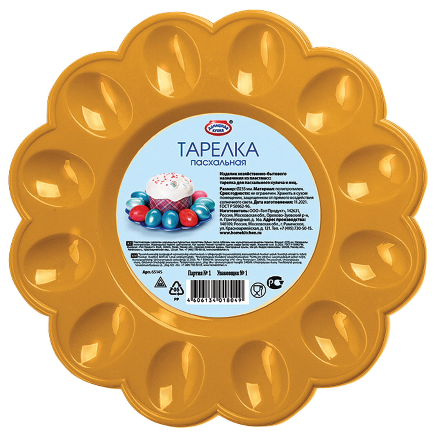 Подставка пасхальная для кулича и яиц, d 23,5 см, 12 яиц, пластик, цвет красный, 42976 Код товара: 592677 125,77 ₽ Купить Производитель:ДОМАШНЯЯ КУХНЯ Подставка для куличей и яиц — это не просто красивый элемент сервировки, а практичное и традиционное решение для праздничного стола, особенно на Пасху! Пасхальная подставка предназначена для праздничного украшения Вашего стола в Светлый День Пасхи. В центре декоративной подставки диаметр 12,4 см - для пасхального кулича, а по окружности - 12 отверстий для пасхальных яиц. Диаметр декоративной подставки - 23,5 см. Материал изделия - полипропилен. Поставляется в 4х цвета ассорти (без возможности выбора): красный, золотистый, зеленый, жёлтый. Без индивидуальной упаковки.Производство: РоссияТип товара: подставкаРазмер: 23,5 смМатериал: пластикЦвет: ассортиКоличество в комплекте: 1 шт.Вес: 55 грРазмер упаковки: 0.5 × 23.5 × 23.5 смОбъём: 0.0004 м3Промежуточная упаковка: 10 штТранспортная упаковка: 50 штШтрих-код: 4606134018049 Сертификат-1.jpg Сертификат-2.jpg Сертификат-3.jpg