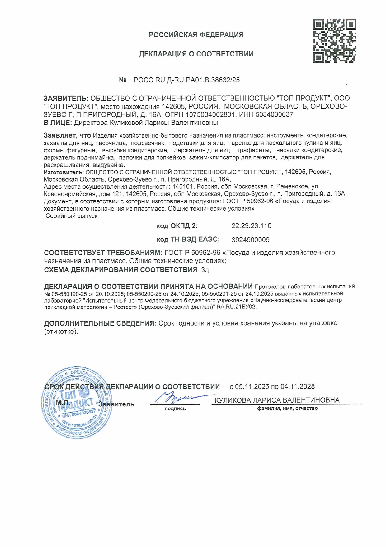 Пасочница пасхальная для приготовления творожной пасхи 465 г, с подсвечником, рецептом, пластик 34108 Код товара: 592678 99 ₽ Купить Производитель:ДОМАШНЯЯ КУХНЯ Подарите своей пасхальной выпечке идеальную форму и торжественный вид с пасочницей, созданной специально для приготовления ароматной творожной пасхи! Пасочница пасхальная объёмом 465гр (размеры 11х8,5х8,5 см) выполнена из пластика ярко-красного цвета. Особое украшение пасочницы — подсвечник в форме «ХВ». После застывания пасхи вы можете установить в нее маленькую свечу и подавать угощение как центр праздничного стола — красиво, торжественно и по-домашнему тепло. В комплекте — подарочный рецепт традиционной творожной пасхи, чтобы вы с лёгкостью приготовили идеальное угощение даже впервые.Производство: РоссияТип товара: Пасочница пасхальнаяМатериал: пластикРазмер: 11х8,5х8,5 смКоличество в комплекте: 1 шт.Дизайн: ПасочницаУпаковка: пакетВес: 26 грРазмер упаковки: 10.3 × 9.2 × 9 смОбъём: 0.0005 м3Промежуточная упаковка: 24 штТранспортная упаковка: 24 штШтрих-код: 4606134040026 Сертификат-1.jpg Сертификат-2.jpg Сертификат-3.jpg