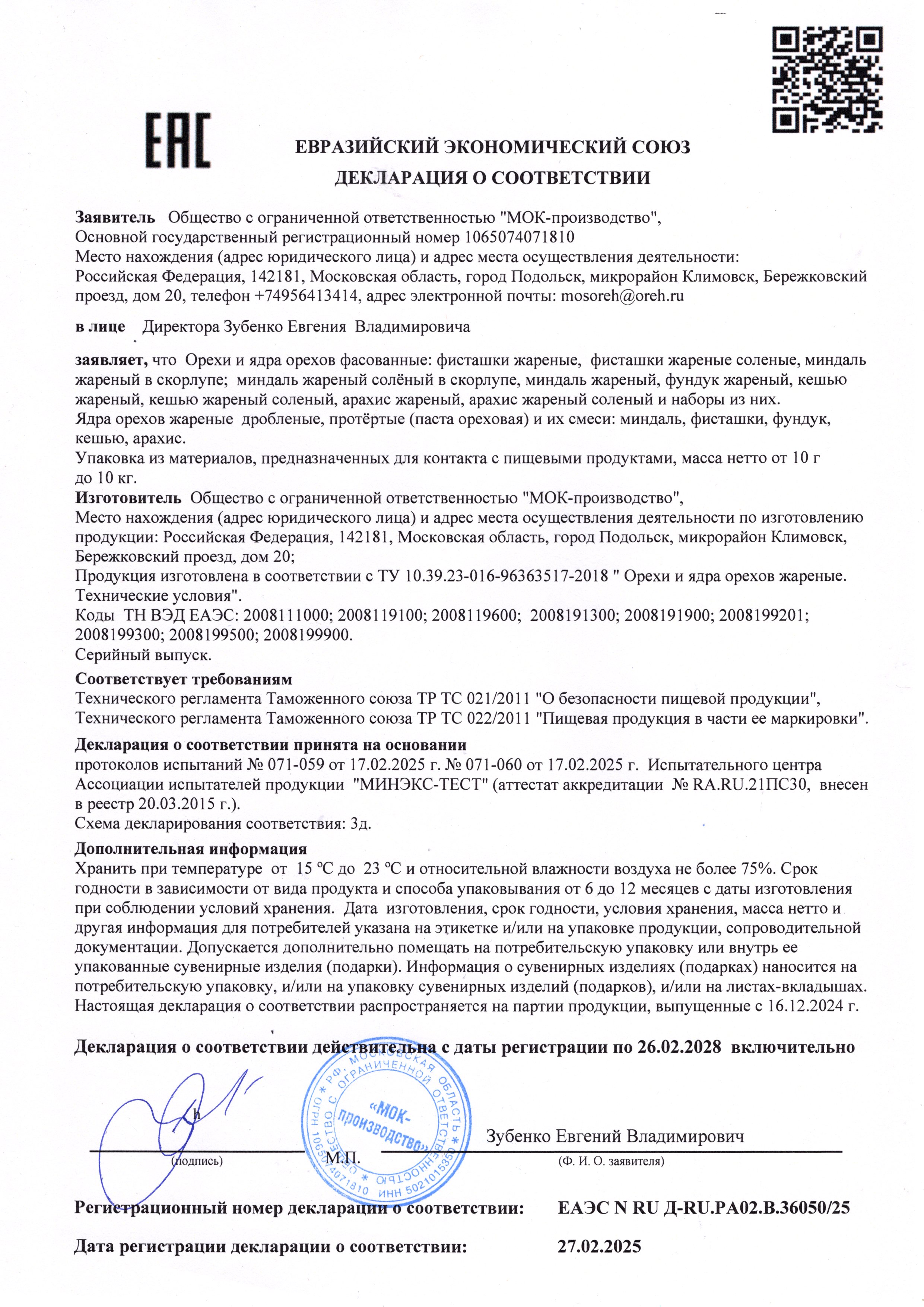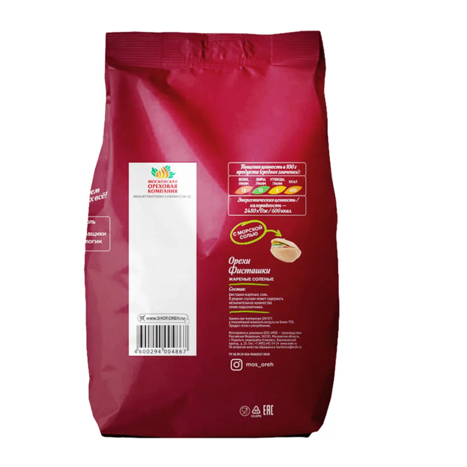 Фисташки жареные соленые ДЖАЗ, 777 г Код товара: 624511 1 954,49 ₽ Купить Производитель:ДЖАЗ Фисташки ДЖАЗ стали настоящим эталоном качества. Используются фисташки среднего размера исключительно натурального раскрытия – это орехи, которые полностью созрели и раскрылись еще на дереве. Состав: фисташки жареные, соль поваренная пищевая. Пищевая ценность на 100 г продукта: белки - 18 г, жиры - 48 г, углеводы - 22 г, калорийность - 604 кал. Специальная технология обжарки придает нашим фисташкам незабываемый, слегка сладковатый привкус и сохраняет все полезные вещества, а умеренное добавление морской соли добавляет вкусу яркостьПроизводство: РоссияТип продукта: фисташкиВес нетто: 777 гОсобенности: жареные, соленыеВкус: фисташки жареные соленыеТип упаковки: герметичный мягкий пакетСрок годности: 12 мес.Фирма-производитель: Московская ореховая компанияСрок годности: 12 месВес: 819 грРазмер упаковки: 7.2 × 20.1 × 12.8 смОбъём: 0.0026 м3Промежуточная упаковка: 5 штТранспортная упаковка: 5 штШтрих-код: 4600294004867 Сертификат-1.jpg Сертификат-2.jpg Сертификат-3.jpg
