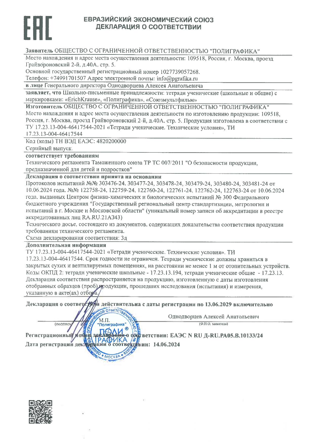 Тетрадь обложка пластик, 18 л. клетка, Erich Krause, CoverPro (микс в спайке) Код товара: 404865 41,42 ₽ Купить Производитель:ERICH KRAUSE Тетрадь школьная ученическая Erich Krause. Двойная обложка: внешняя выполнена из высококачественного износостойкого прозрачного пластика с фактурой "апельсиновая корка", внутренняя – из качественной мелованной бумаги. Тетрадь формата А5+ (170x203 мм). Внутренний блок состоит из 18 листов в клетку с полями. Бумага офсетная плотностью 60 г/м2. Цвет линовки – синий. Скругленные уголки обложки и блока. Тип скрепления – скоба. Тетради разных дизайнов упакованы в термоусадочную пленку по 10 штук.Производство: РоссияЛиновка блока: клеткаКоличество листов: 18Обложка: пластикФормат: А5Наличие полей: даТип скрепления: скобаСерия: ErichKrauseДизайн: CoverPrоВнутренний блок: офсетПлотность внутреннего блока: 60 г/м2Белизна: 100 %Однотонный дизайн обложки: даКоличество дизайнов в минимальной упаковке: 5 шт.Количество дизайнов в транспортной упаковке: 5 шт.Длина: 203 ммШирина: 170 ммВес: 58 грРазмер упаковки: 0.3 × 20.3 × 17.1 смОбъём: 0.0001 м3Промежуточная упаковка: 10 штТранспортная упаковка: 200 штШтрих-код: 4601921563566 Файлы Приложение-1.pdf Сертификат-1.jpg Сертификат-2.jpg Сертификат-3.jpg