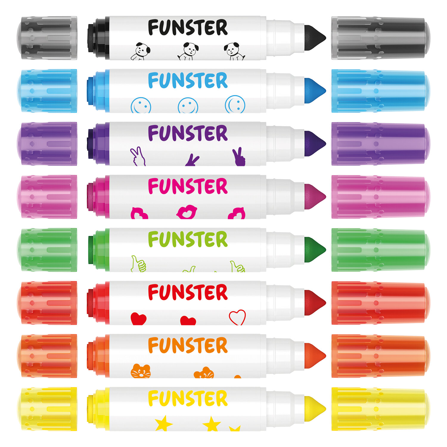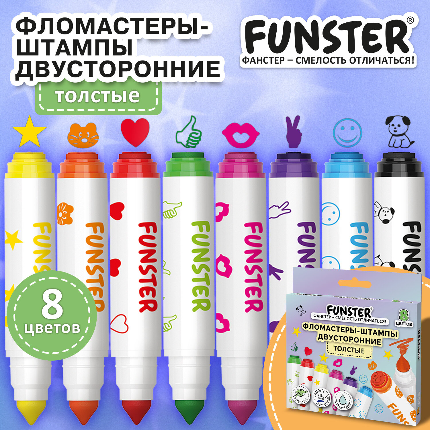 Фломастеры-штампы двусторонние FUNSTER (ФАНСТЕР) 8 цветов, ударопрочный наконечник Код товара: 152627 214,91 ₽ Купить Производитель:FUNSTER Фломастеры-штампы двусторонние FUNSTER (ФАНСТЕР) - прекрасные помощники в развитии творческих способностей у детей! Утолщенные двусторонние фломастеры имеют 2 вида наконечника: с одной стороны конической формы, с другой - наконечники-штампы с восьмью разными картинками. Конический наконечник с линией письма от 1 до 7 мм подходит как для мелких рисунков так и для закрашивания, а наконечники-штампы сделают процесс рисования увлекательнее и веселее. Запаса чернил фломастера хватит на 300 метров письма! Быстросохнущие чернила на водной основе безопасны для детей, отмываются с кожи с помощью теплой воды и мыла и легко отстирываются с одежды. Круглая форма корпуса с диаметром 15 мм идеально подходит для детских рук. Колпачок оснащен специальными прорезями для вентиляции, которые делают использование фломастеров более безопасным. Рекомендованы для детей от 3-х лет.Производство: КитайКоличество цветов: 8Форма корпуса: круглаяУтолщенный: даЭффект чернил: без эффектаДвухсторонний: даТип чернил: легкосмываемыеСерия: StampsШирина линии письма: 7 ммПишущий узел: 7.5 ммДлина письма: 300 мДлина корпуса: 106 ммДиаметр корпуса: 15.5 ммВентилируемый колпачок: даЗаблокированный пишущий узел: даУпаковка: картонная коробка с европодвесомСрок годности: 60 месВес: 87 грРазмер упаковки: 1.7 × 10.6 × 13 смОбъём: 0.0003 м3Промежуточная упаковка: 24 штТранспортная упаковка: 144 штШтрих-код: 4606224486031