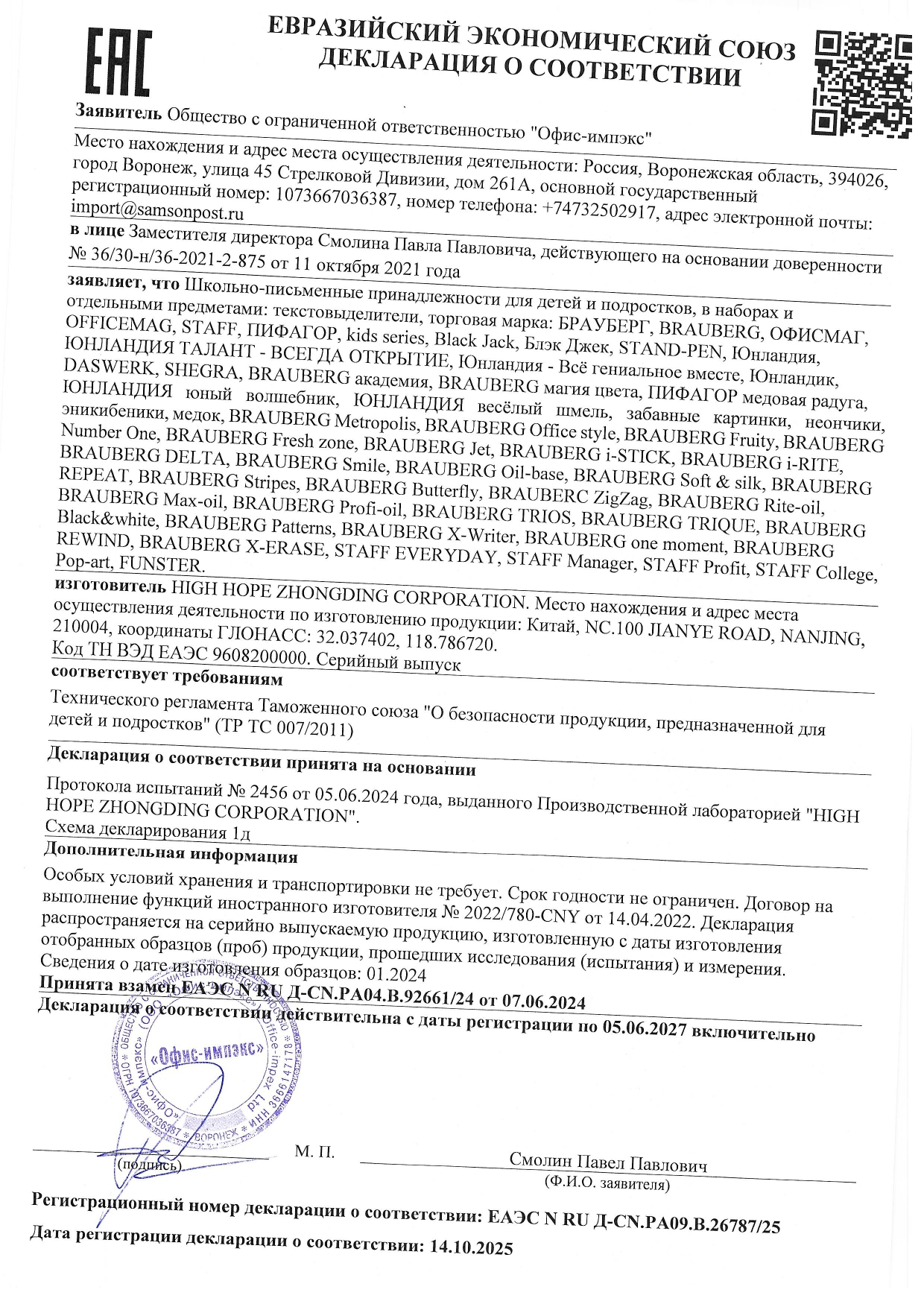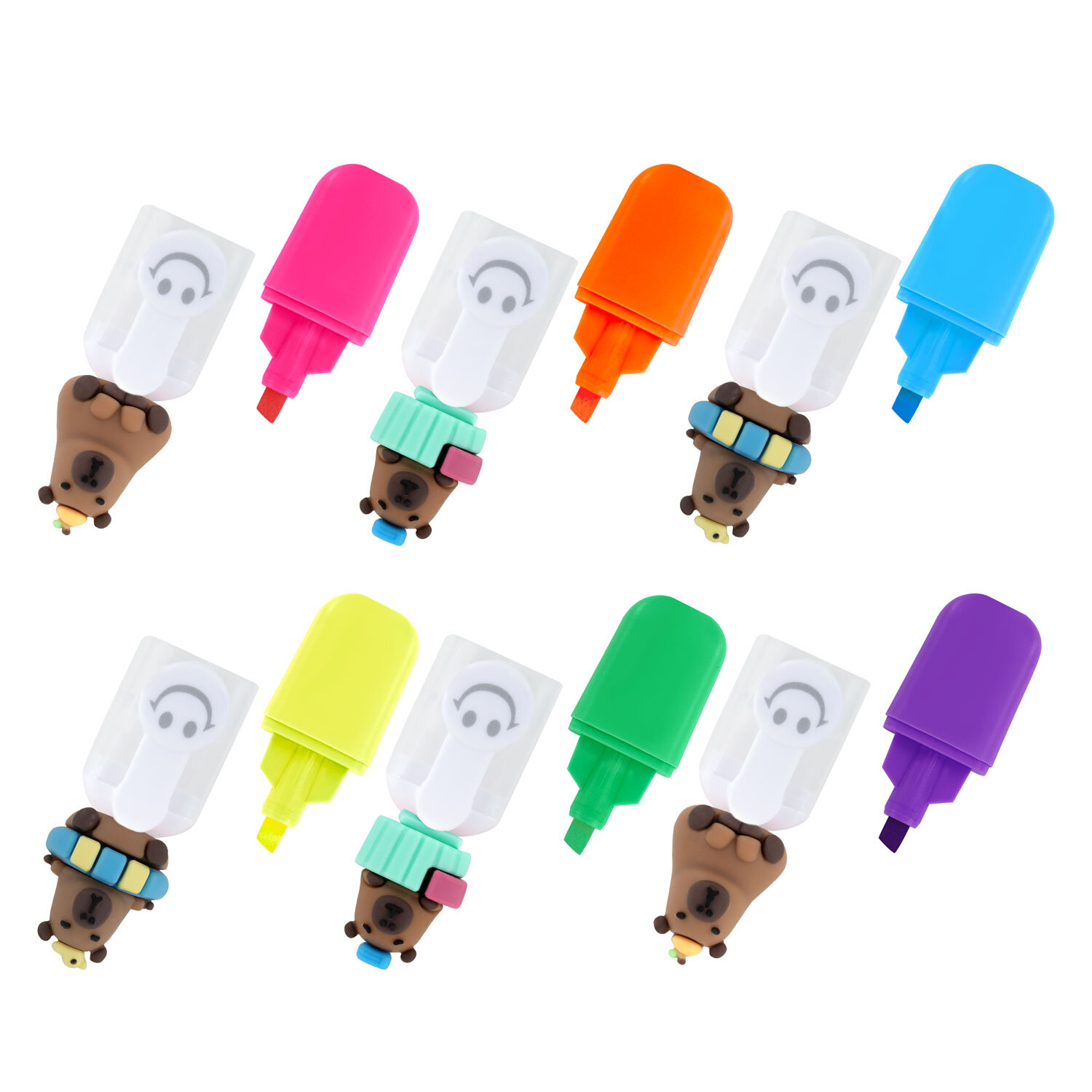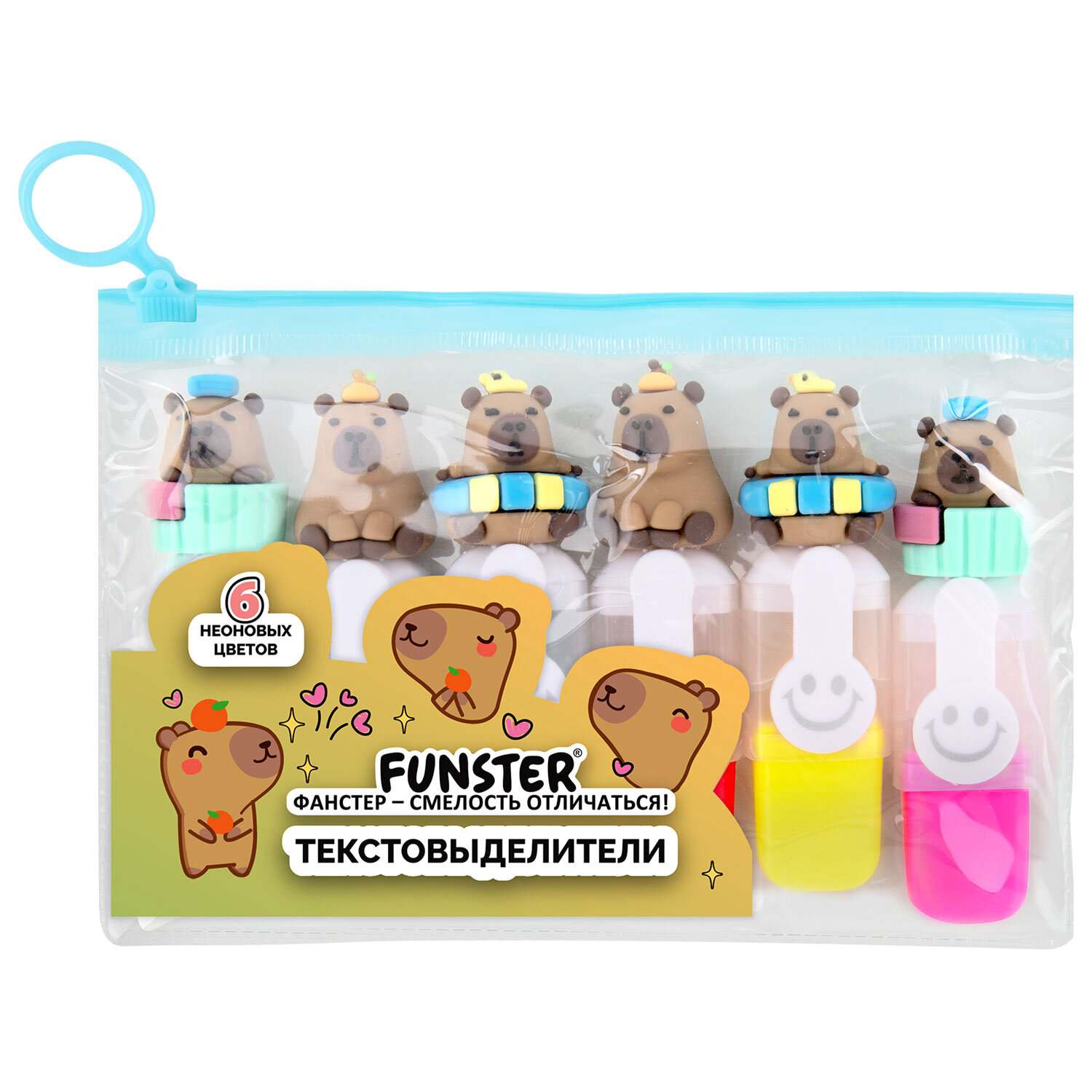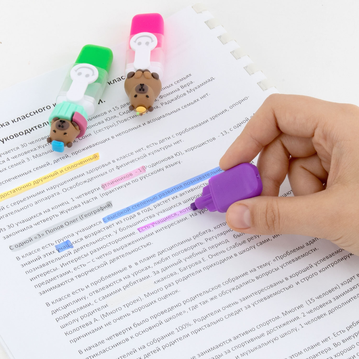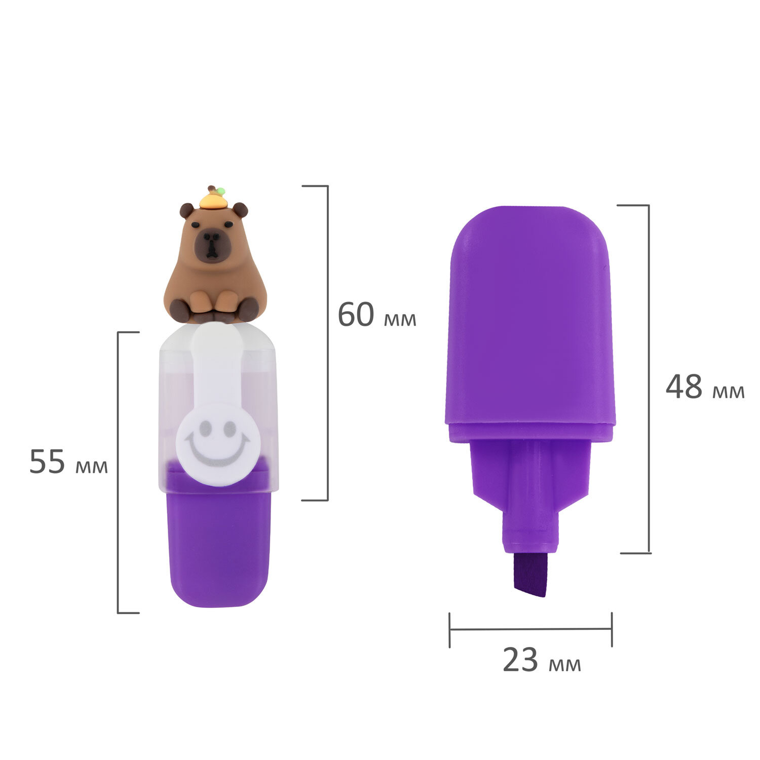 Набор текстовыделителей с топперами 6 ЦВЕТОВ НЕОН, "КАПИБАРЫ", линия 1-4 мм, FUNSTER (ФАНСТЕР) Код товара: 152646 273,43 ₽ Купить Производитель:FUNSTER Текстовыделители FUNSTER "КАПИБАРЫ" предназначены для выделения текста на бумаге любого типа. Идеально подходят для решения учебных, домашних и офисных задач. В наборе 6 неоновых цветов: розовый, оранжевый, фиолетовый, желтый, синий и зеленый. Неоновые цвета позволяют ярко выделить важные места в тексте. Цвет корпуса текстовыделителя соответствует цвету чернил. Текстовыделители имеют плоскую форму корпуса с диаметром 23 мм. Колпак украшен ярким топпером в форме капибары. Скошенный наконечник с толщиной линии письма от 1 до 4 мм обеспечивает удобство при работе с текстом, напечатанным мелким шрифтом, или таблицами. В комплект входит прозрачная сумочка для хранения длиной 15,5 см. Благодаря особой водной основе чернил текстовыделитель не высыхает без колпачка в течение 8 часов. Текстовыделитель обладает экономным расходом чернил. Чернила быстро впитываются и тем самым предотвращают размазывание в процессе использования.Производство: КитайЦвет чернил: неоновый ассортиКоличество в комплекте: 6 шт.Форма наконечника: скошенныйСпецэффект цвета чернил : неоновыйОснова чернил: воднаяСерия: ФигурныеДизайн: КапибарыМин. толщина линии письма: 1 ммМакс. толщина линии письма: 4 ммФорма корпуса: плоскаяДиаметр корпуса: 23 ммНаличие клипа: даУпаковка: ПВХ-чехолСрок годности: 48 месВес: 91 грРазмер упаковки: 2 × 15.8 × 10.5 смОбъём: 0.0005 м3Промежуточная упаковка: 12 штТранспортная упаковка: 144 штШтрих-код: 4606224508290 Сертификат-1.jpg Сертификат-2.jpg Сертификат-3.jpg