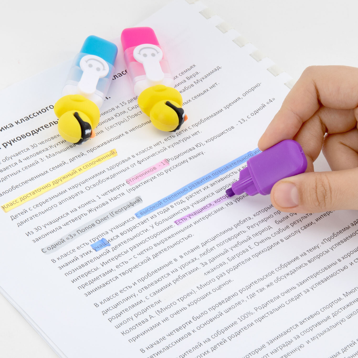 Набор текстовыделителей с топперами 6 ЦВЕТОВ НЕОН, "КРУТЫЕ УТЯТА", линия 1-4 мм, FUNSTER (ФАНСТЕР) Код товара: 152647 273,43 ₽ Купить Производитель:FUNSTER Текстовыделители FUNSTER "КРУТЫЕ УТЯТА" предназначены для выделения текста на бумаге любого типа. Идеально подходят для решения учебных, домашних и офисных задач. В наборе 6 неоновых цветов: розовый, оранжевый, фиолетовый, желтый, синий и зеленый. Неоновые цвета позволяют ярко выделить важные места в тексте. Цвет корпуса текстовыделителя соответствует цвету чернил. Текстовыделители имеют плоскую форму корпуса с диаметром 23 мм. Колпак украшен ярким топпером в форме утёнка. Скошенный наконечник с толщиной линии письма от 1 до 4 мм обеспечивает удобство при работе с текстом, напечатанным мелким шрифтом, или таблицами. В комплект входит прозрачная сумочка для хранения длиной 15,5 см. Благодаря особой водной основе чернил текстовыделитель не высыхает без колпачка в течение 8 часов. Текстовыделитель обладает экономным расходом чернил. Чернила быстро впитываются и тем самым предотвращают размазывание в процессе использования.Производство: КитайЦвет чернил: неоновый ассортиКоличество в комплекте: 6 шт.Форма наконечника: скошенныйСпецэффект цвета чернил : неоновыйОснова чернил: воднаяСерия: ФигурныеДизайн: Крутые утятаМин. толщина линии письма: 1 ммМакс. толщина линии письма: 4 ммФорма корпуса: плоскаяДиаметр корпуса: 23 ммНаличие клипа: даУпаковка: ПВХ-чехолСрок годности: 48 месВес: 97 грРазмер упаковки: 2 × 15.8 × 9.5 смОбъём: 0.0005 м3Промежуточная упаковка: 12 штТранспортная упаковка: 144 штШтрих-код: 4606224508306 Сертификат-1.jpg Сертификат-2.jpg Сертификат-3.jpg
