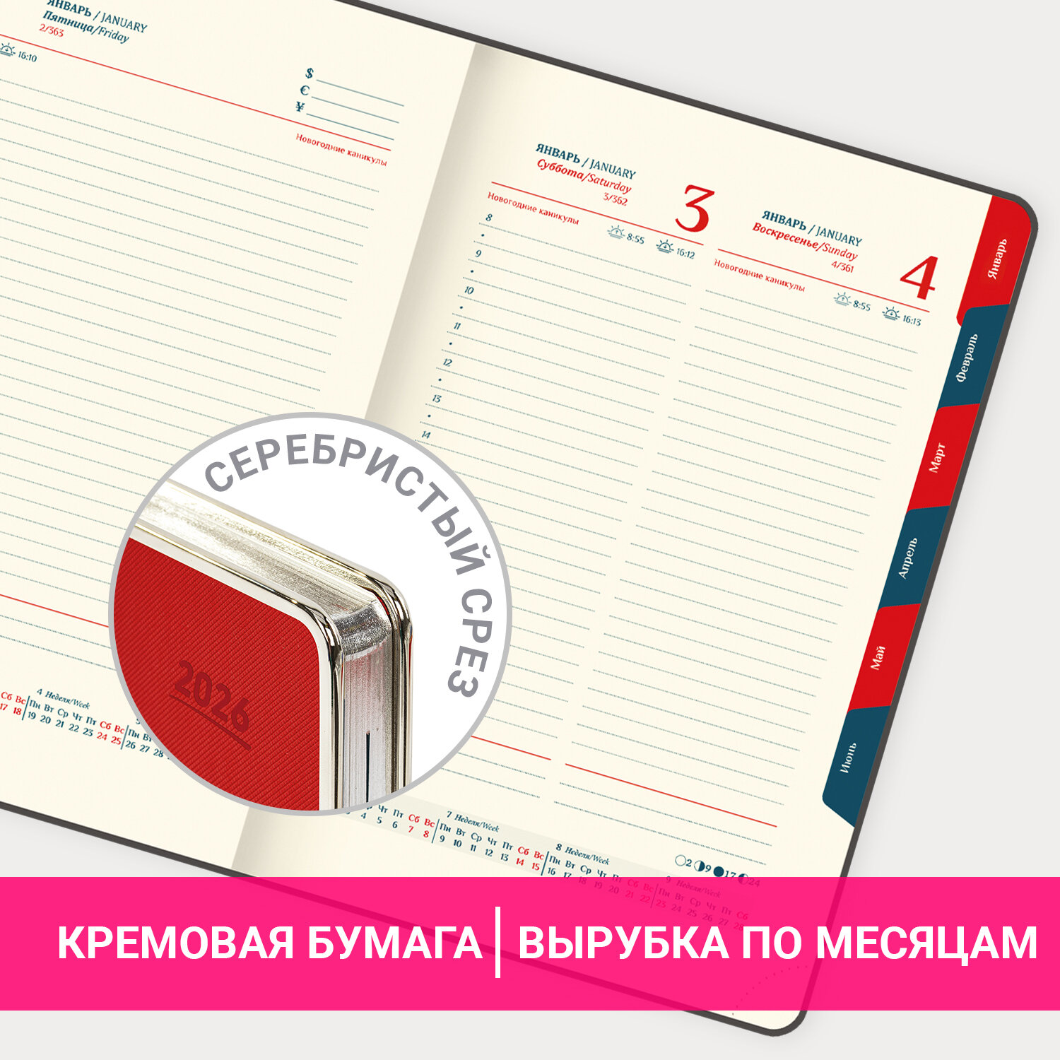 Ежедневник датированный 2026 А5 148х218 мм, GALANT "Infinity Silver", под кожу, красный Код товара: 117497 1 133,51 ₽ Купить Производитель:GALANT Датированный ежедневник серии "Infinity Silver" от GALANT – надежный спутник делового человека. Внутренний блок включает 168 листов тонированной бумаги цвета "слоновая кость" плотностью 70 г/м2. Каждая страничка имеет перфорированный угол. Благодаря стандартному формату А5 (148х218 мм) ежедневник удобно использовать как в офисе, так и на выездных деловых встречах. Твердая обложка красного цвета выполнена под кожу с отделкой из металлических накладок, что увеличивает ее износоустойчивость. Срез ежедневника покрыт серебряной фольгой в цвет металлических накладок, и это придает ему особый шарм. Материал обложки подходит для горячего тиснения. Дополнением является закладка-ляссе, с помощью которой при необходимости можно быстро открыть ежедневник на нужной странице, а также вырубка по месяцам. Ежедневник снабжен обширным справочным материалом. В конце есть 6 страниц для записей и заметок.Производство: КитайТип ежедневника: датированныйФормат: А5Обложка: под кожуВид обложки: твердаяКоличество листов: 168 шт.Особенности: вырубка блока, закладка-ляссе, металлические углы, перфорация уголков, поролоновая прослойка, скругленные углы, справочная информацияСерия: Infinity SilverГод: 2026Тип застежки: нетОсновной цвет обложки: красныйДополнительный цвет обложки: нетЦвет среза: серебристыйЦвет внутреннего блока: кремовыйПлотность внутреннего блока: 70 г/м2Высота строки для записи: 4 ммТип крепления: сшивкаПечать блока: 2 краскиПодходит для блинтового тиснения: даПодходит для тиснения фольгой: даПодходит для заливки полимерной смолой: даДлина: 218 ммШирина: 148 ммТолщина: 20 ммВес: 504 грРазмер упаковки: 2.3 × 21.7 × 15.1 смОбъём: 0.001 м3Промежуточная упаковка: 15 штТранспортная упаковка: 15 штШтрих-код: 4606224489247 Файлы Сертификат-1.jpg Сертификат-2.jpg Сертификат-3.jpg Сертификат-4.jpg Сертификат-5.jpg Сертификат-6.jpg Сертификат-7.jpg Сертификат-8.jpg Сертификат-9.jpg Сертификат-10.jpg Сертификат-11.jpg Сертификат-12.jpg Сертификат-13.jpg Сертификат-14.jpg Сертификат-15.jpg Сертификат-16.jpg Сертификат-17.jpg Сертификат-18.jpg Сертификат-19.jpg Сертификат-20.jpg Сертификат-21.jpg Сертификат-22.jpg Сертификат-23.jpg Сертификат-24.jpg Сертификат-25.jpg Сертификат-26.jpg
