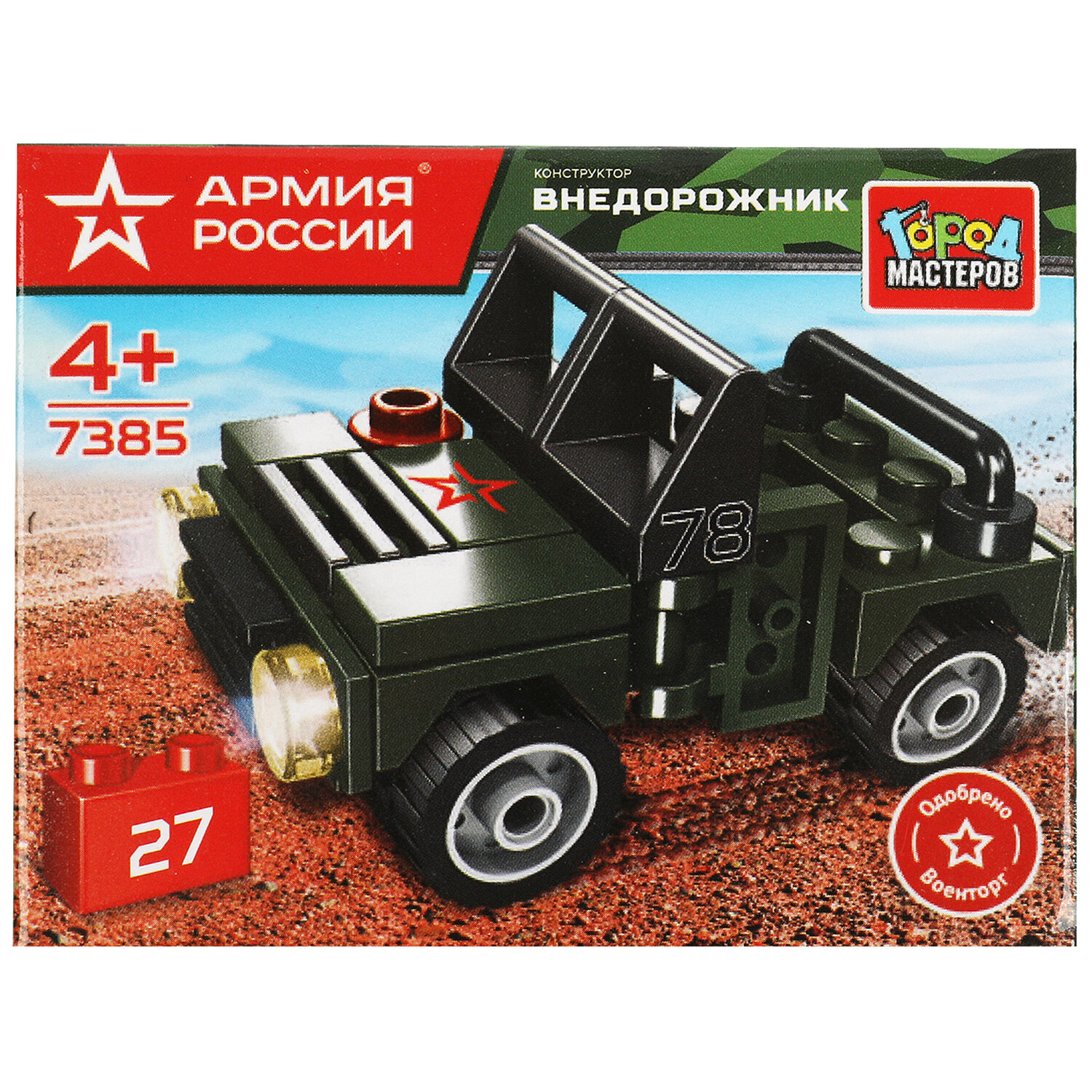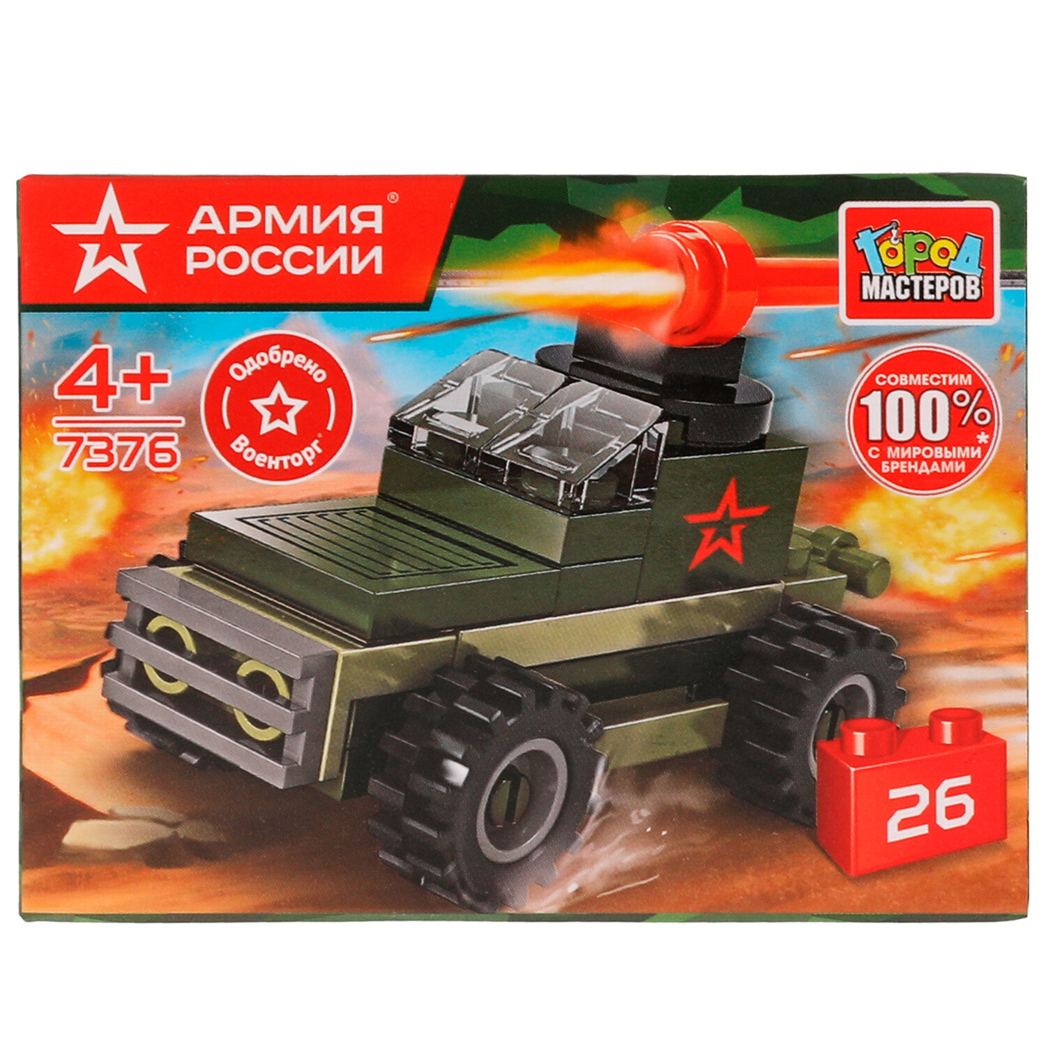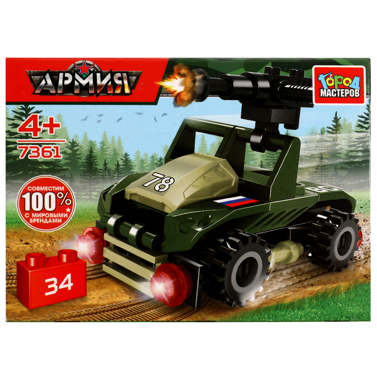 Конструктор пластиковый АРМИЯ РОССИИ, 20 - 29 деталей, ассорти, ГОРОД МАСТЕРОВ Код товара: 667465 167,5 ₽ Купить Производитель:ГОРОД МАСТЕРОВ Торговая марка «Город Мастеров» представляет развивающие конструкторы европейского качества, совместимые c конструкторами ведущих мировых производителей. Пластиковый конструктор серии «Армия России» - это идеальная детская игрушка для мальчиков, стремящихся к приключениям. Она является замечательным вариантом развивающих игр и отлично подходит для всех любителей сборных моделей. Эта игрушка совместима с моделями конструкторов мировых брендов, все детали легко и плотно соединяются между собой. Пластмассовый материал конструкции гарантирует долговечность и безопасность в использовании.Производство: КитайТип товара: конструктор пластиковыйСерия: Город МастеровМатериал: пластикУровень сложности сборки: начальныйРекомендуемый возраст: 4+Тип деталей: разные формыДетали совместимы с "LEGO": даСюжет: Военная техникаКоличество элементов: 20 шт.Количество моделей для сборки: 1Комплектация: инструкция по сборкеЦвет: ассортиУпаковка: картонная коробкаВес: 48 грРазмер упаковки: 4.8 × 9.2 × 6.8 смОбъём: 0.0009 м3Промежуточная упаковка: 10 штТранспортная упаковка: 10 штШтрих-код: 6934600007913
