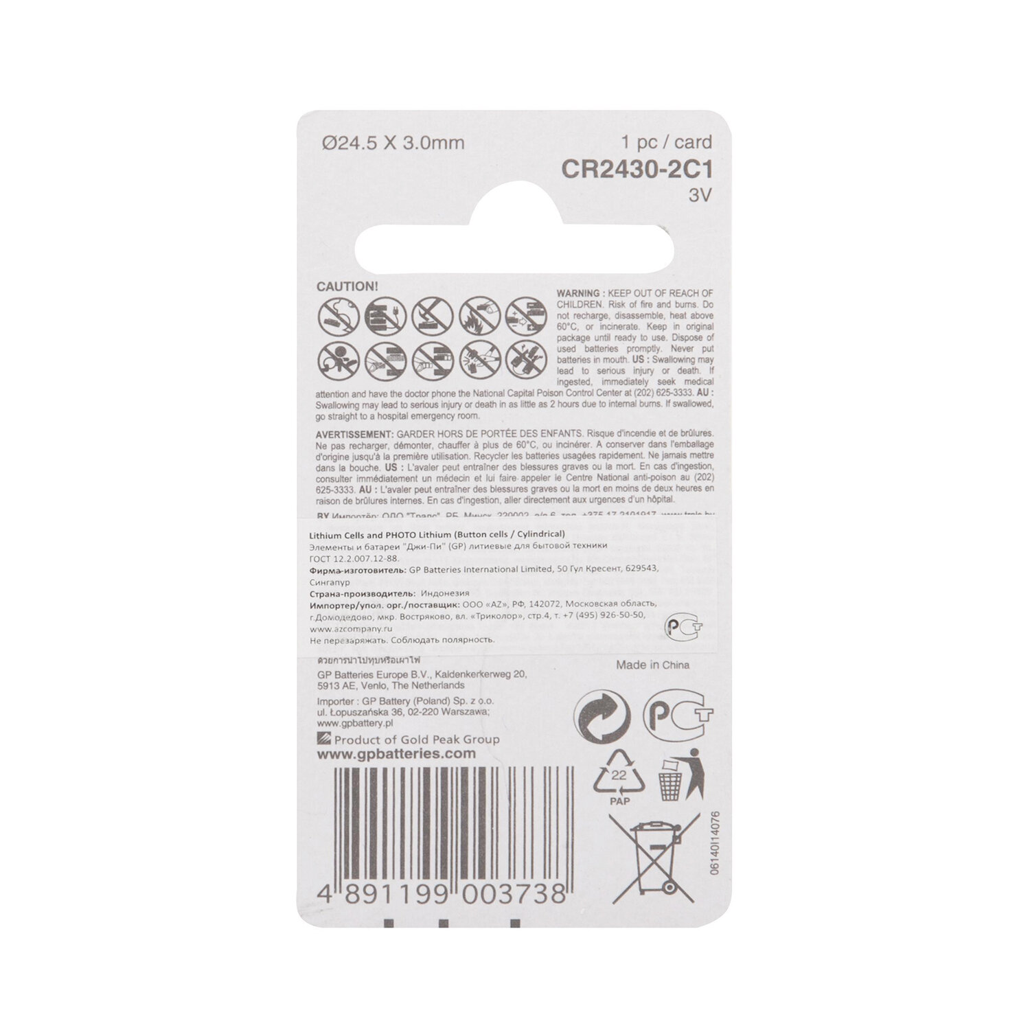 Батарейка литиевая GP Lithium CR2430 "таблетка, дисковая, кнопочная" 1 шт., блистер Код товара: 454102 357,58 ₽ Купить Производитель:GP Литиевые батарейки GP размера CR2430 предоставляют высокий выходной уровень, что делает их идеально подходящими для наручных часов, фотографического оборудования, калькуляторов, компьютерного оборудования. Батарейки GP - это надежные элементы питания, которые обеспечивают стабильную работу устройств. Утонченная технология GP обеспечивает длительный срок хранения (10 лет) и дарит непревзойдённое качество работы даже при экстремальных температурных условиях, при этом они на 40% легче обычных батареек. С этими батарейками можете полностью положиться на свое устройство.Производство: КитайФорма батарейки: дисковые «монетки»Серия: LithiumТипоразмер: CR2430Технология: литиеваяНапряжение: 3 ВКоличество в упаковке: 1 шт.Упаковка: блистерСрок годности: 120 месВес: 8 грРазмер упаковки: 0.5 × 4 × 9 смПромежуточная упаковка: 10 штТранспортная упаковка: 600 штШтрих-код: 4891199003738 Файлы Сертификат-1.jpg Сертификат-2.jpg Сертификат-3.jpg Сертификат-4.jpg