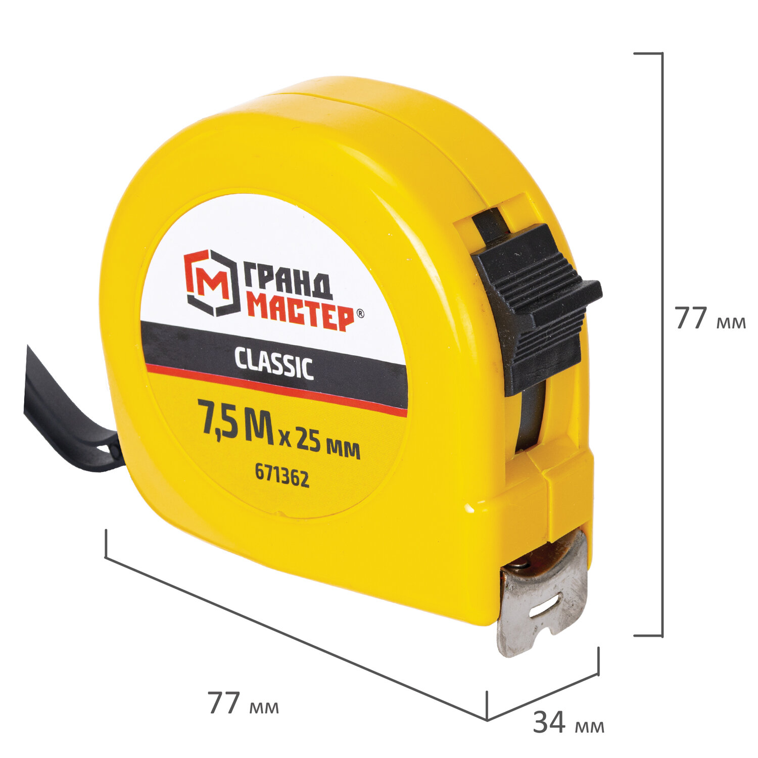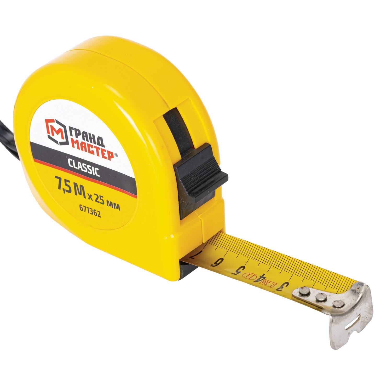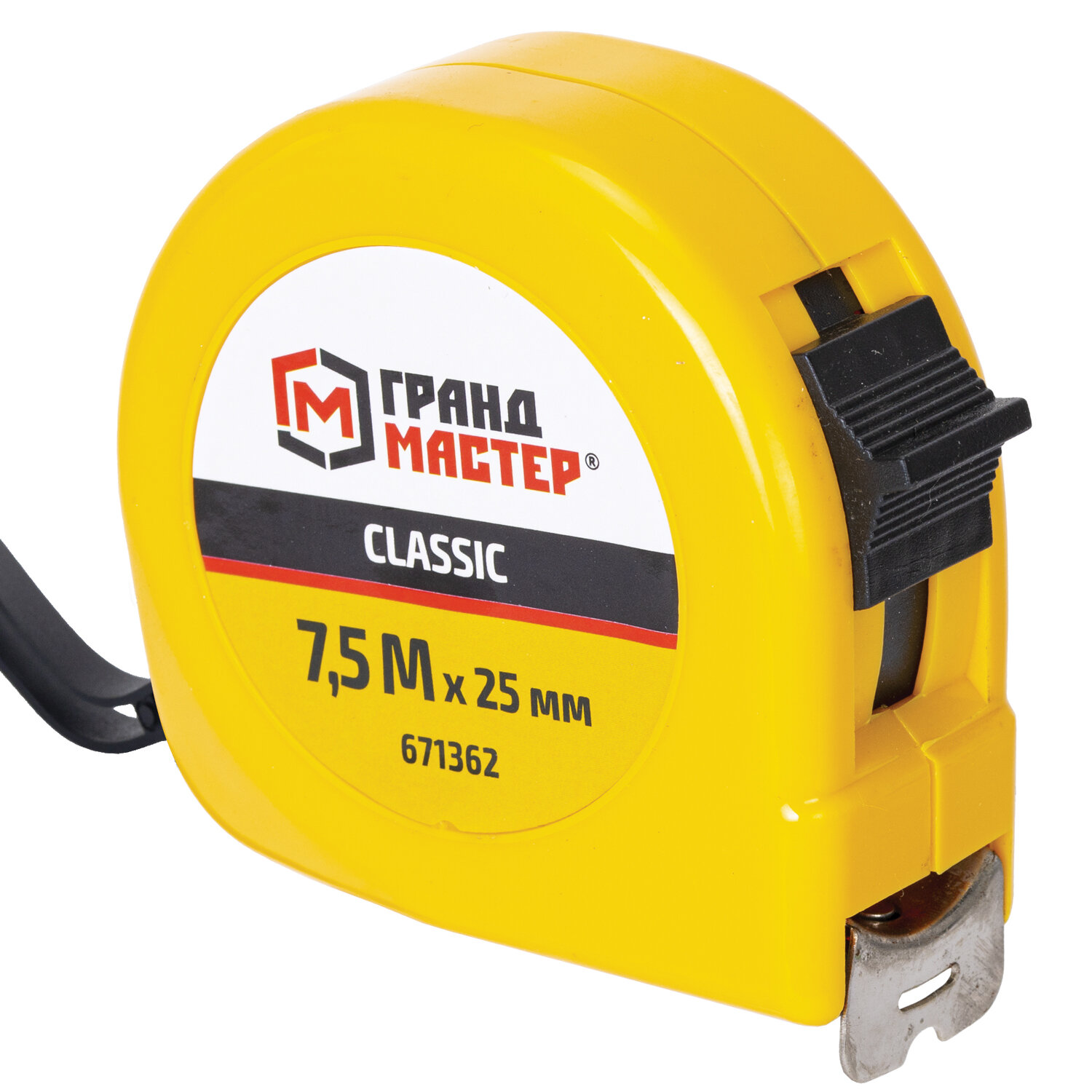 Рулетка измерительная 7,5 м х 25 мм, пластиковый корпус, с фиксатором, ГРАНДМАСТЕР Classic Код товара: 671362 179,44 ₽ Купить Производитель:ГРАНДМАСТЕР Рулетка ГРАНДМАСТЕР применяется для измерения размеров поверхностей и расстояний. Благодаря эргономичному дизайну и высокому классу точности измерений рулетка станет незаменимым помощником в быту и профессиональной деятельности. Рулетка ГРАНДМАСТЕР проста в обращении и обладает повышенной износостойкостью благодаря корпусу, изготовленному из прочного ABS-пластика. Измерительная лента с метрической шкалой II класса точности изготовлена из прочной марганцевой стали, устойчивой к заломам, и оснащена зацепом для удобства измерений. Рулетка оснащена ремешком для ношения на запястье, а также металлической клипсой для крепления на поясе. Эргономичный дизайн с вертикальным фиксатором измерительной ленты позволит использовать рулетку даже одной рукой. Материал корпуса: ABS-пластик. Цвет корпуса: жёлтый. Материал измерительной ленты: 45 марганцевая сталь. Размеры измерительной ленты: длина 7,5 метров, ширина 25 миллиметров. Система измерения: метрическая. Цвет ленты: жёлтый. Фиксатор: вертикальный. Упаковка: бумажная карта с европодвесом.Производство: КитайВид рулетки: строительныйШирина ленты: 25 ммДлина ленты: 7.5 мСерия: РулеткиМатериал ленты: марганцевая стальКоличество режимов фиксации: 1Цена деления: 1 ммКласс точности: 2Тип корпуса: закрытыйМатериал корпуса: пластикВес: 304 грРазмер упаковки: 3.8 × 14.7 × 9.8 смОбъём: 0.0006 м3Промежуточная упаковка: 6 штТранспортная упаковка: 60 штШтрих-код: 4606224470849 Файлы Сертификат-1.jpg Сертификат-2.jpg Сертификат-3.jpg Сертификат-4.jpg Сертификат-5.jpg