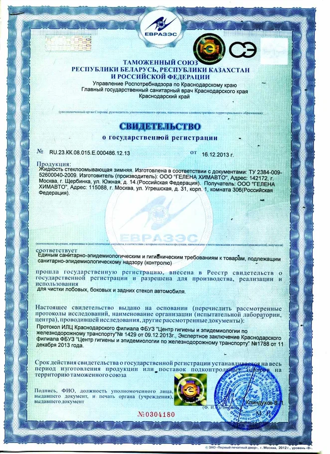 Препятствует образованию на лобовом стекле ледяной пленки и обмерзанию щеток, эффективно очищает от наледи, дорожной грязи, соли, реагентов при температуре до -20 °С. Улучшает обзор и повышает безопасность движения. Безопасна для всех типов лакокрасочного покрытия, резины и пластика. Состав: 30% дистиллированная вода; > 15, но < 30% изопропиловый спирт; 5%: неионогенные ПАВ, этиленгликоль, отдушка, краситель. Способ применения: Залить готовый к использованию продукт в бачок стеклоомывателя.