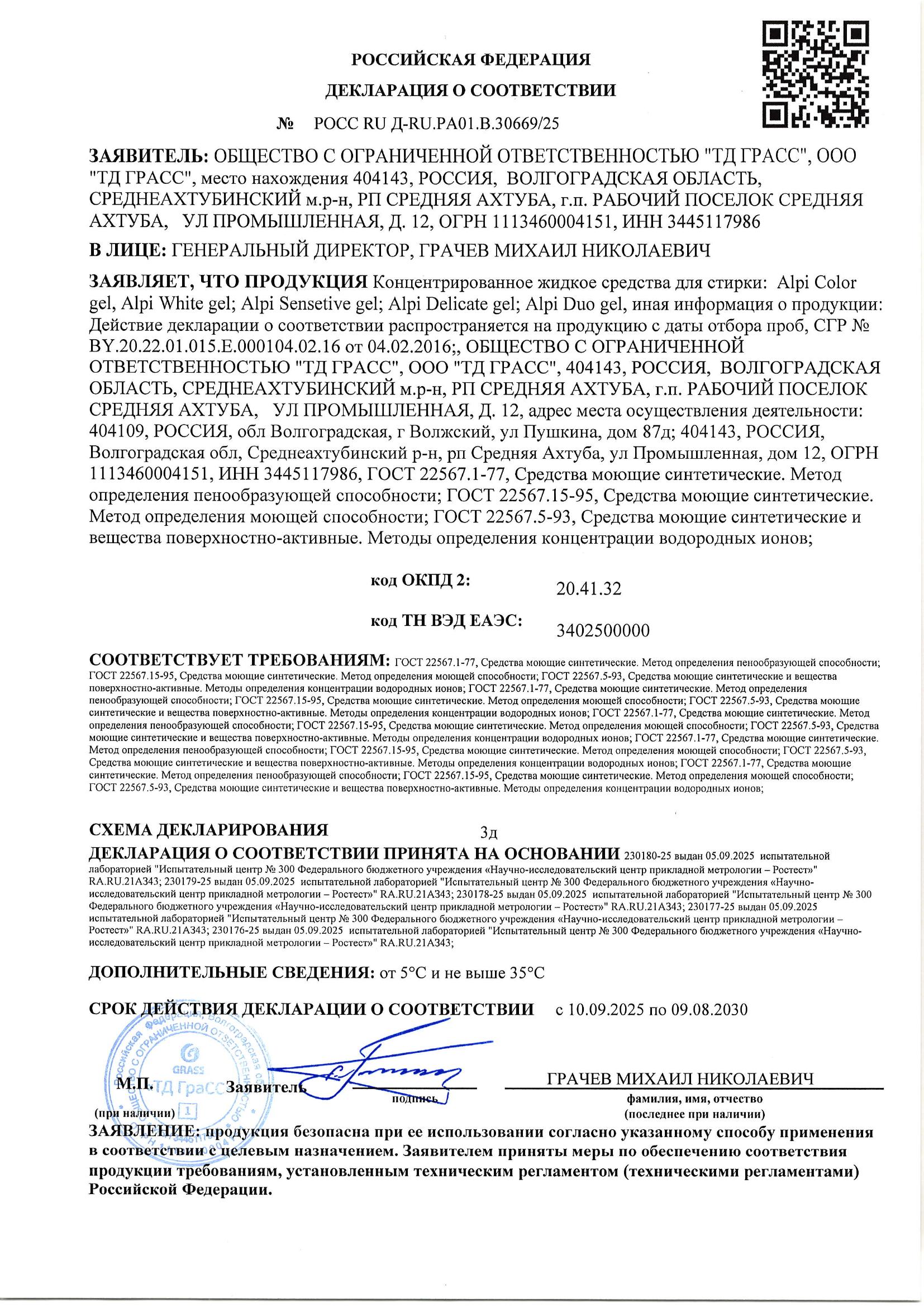 Гель для стирки белья концентрированный, 5 л, GRASS ALPI, "Детский" Код товара: 702591 1 138,81 ₽ Купить Производитель:GRASS Концентрированное жидкое средство GRASS ALPI "Детский" предназначено для стирки и замачивания изделий из хлопчатобумажных, льняных, синтетических тканей и тканей из смешанных волокон в стиральных машинах любого типа и ручной стирки. Концентрированное жидкое средство GRASS ALPI "Детский" отстирывает даже самые сильные загрязнения. Ключевые особенности: - для детских вещей, - гипоаллергенно Состав: не менее 30% очищенная вода; более 5%, но меньше 15% анионные ПАВ; менее 5%: неионогенные ПАВ, мыло, энзимы, поликарбоксилаты, метилхлороизотиазолинон, метилизотиазолинон, ароматизирующая добавка. Способ применения: налейте средство в отсек для стиральных порошков. Для удаления трудных пятен нанесите гель непосредственно на пятно перед стиркой. Использовать строго по назначению! Стирку вещей осуществлять при температуре 20-60 °С. Для выбора способа стирки следуйте рекомендациям на ярлыках изделий. Перед использованием средство рекомендуется взболтать. Меры предосторожности: беречь от детей! Хранить вдали от пищевых продуктов. При попадании в глаза немедленно промыть водой. При чувствительной коже и повреждениях кожи избегать длительного контакта со средством.Производство: РоссияТип: универсальныйОбъем/Вес: 5000 мл/гВид средства: гель концентратНазначение: для всех видов тканей, кроме шерсти и шелкаОтдушка: без отдушкиГипоаллергенный: даКоличество бункеров: 0 шт.Серия: GEL CONCENTRATEВид упаковки: канистраСрок годности: 36 месРазмер упаковки: 29.4 × 17.9 × 12.7 смОбъём: 0.0076 м3Промежуточная упаковка: 4 штТранспортная упаковка: 4 штШтрих-код: 4670113606817 Сертификат-1.jpg Сертификат-2.jpg